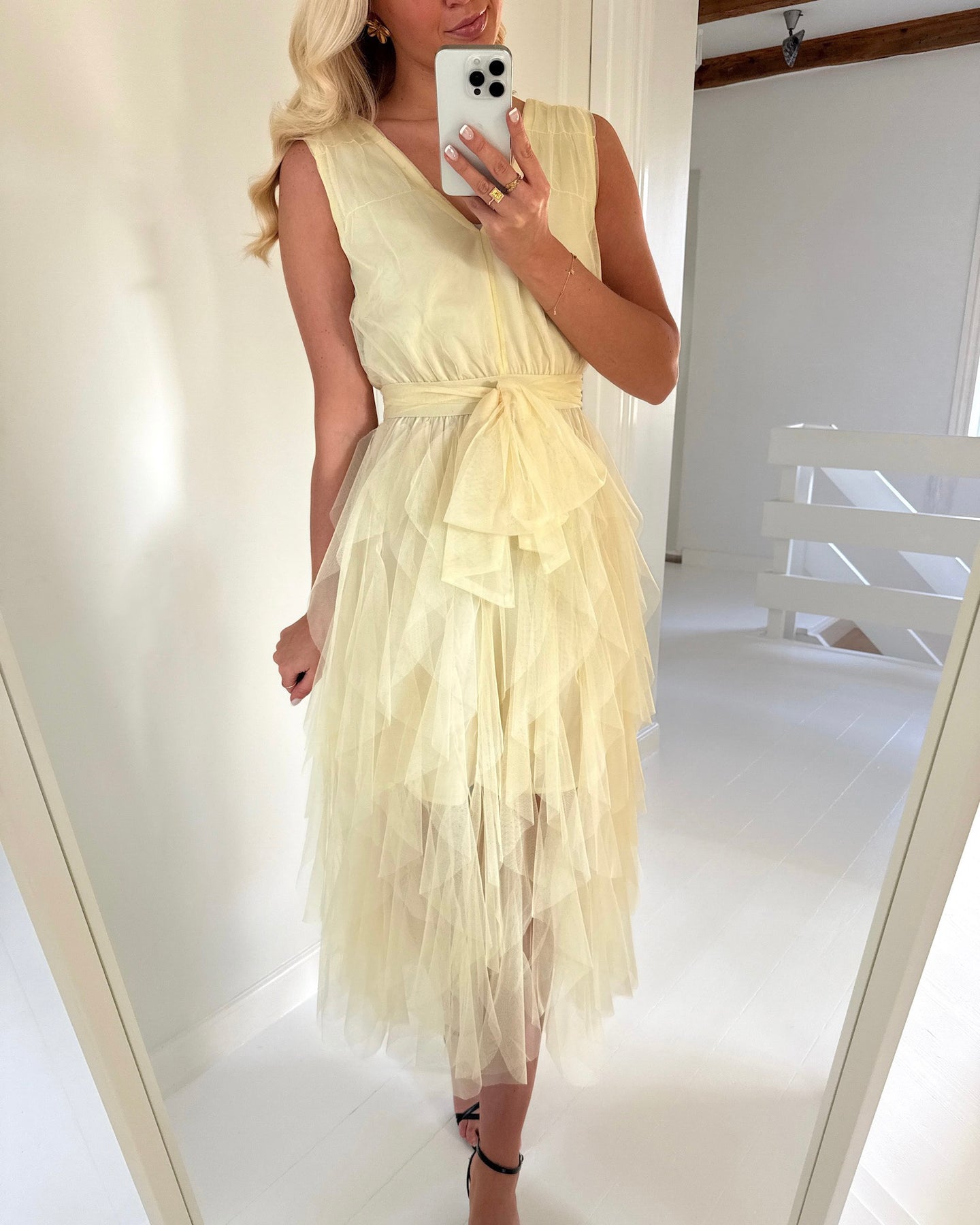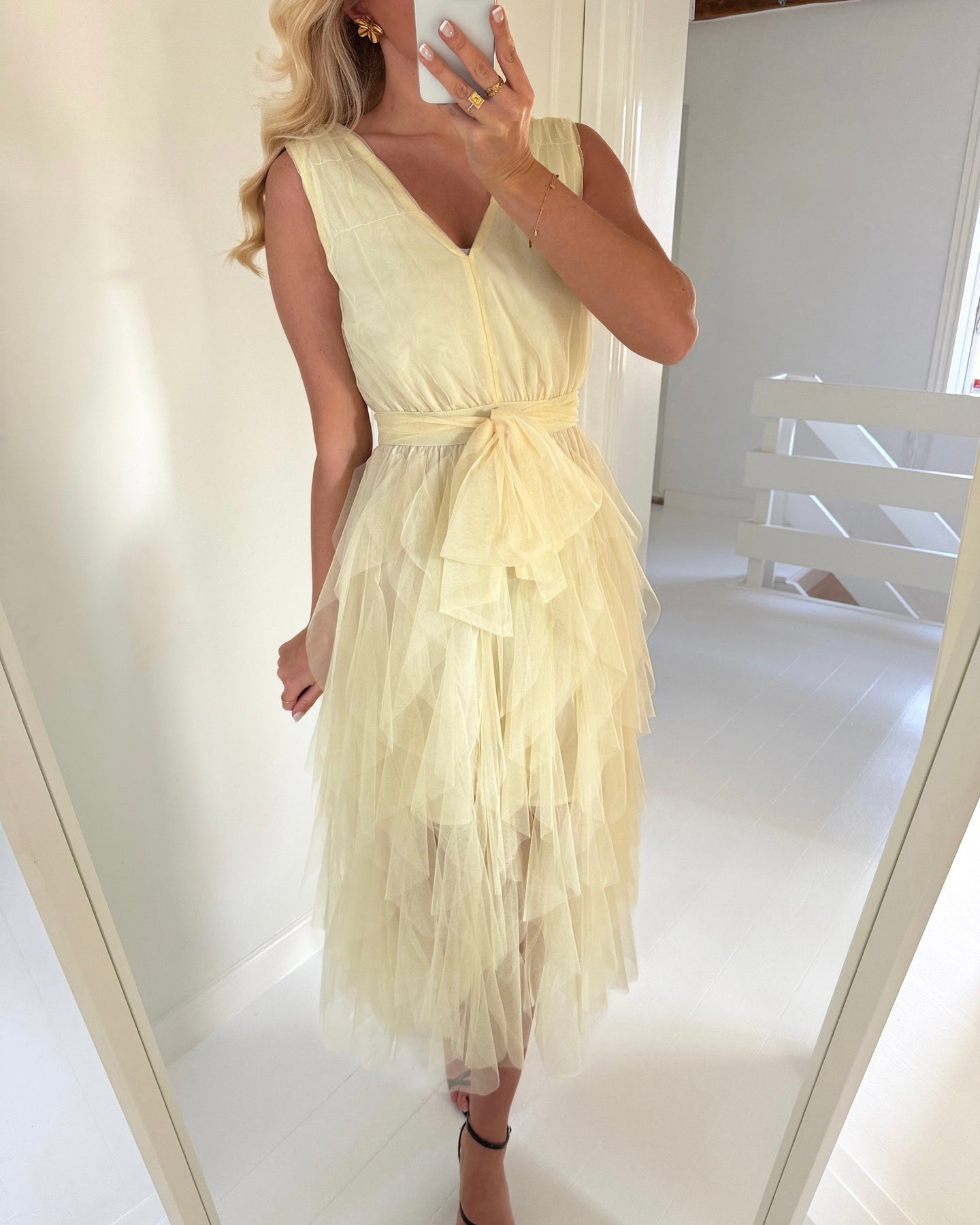 Smuk kjole i den fineste gule farve med feminint tyl.