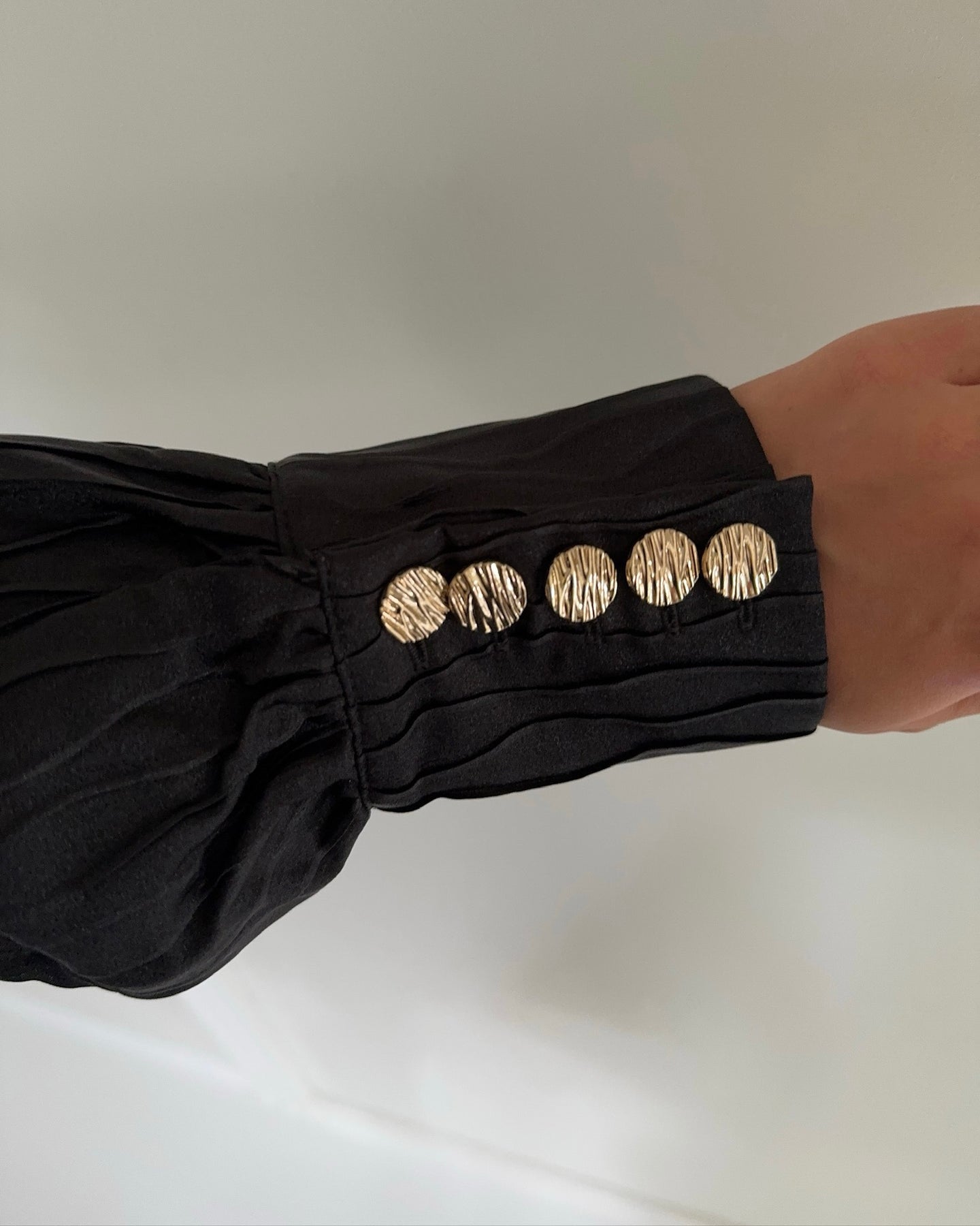 Den har dertil flotte voluminøse ærmer med knapmanchet ved håndleddene, struktur i stoffet og lukkes med skjult lynlås i ryggen.