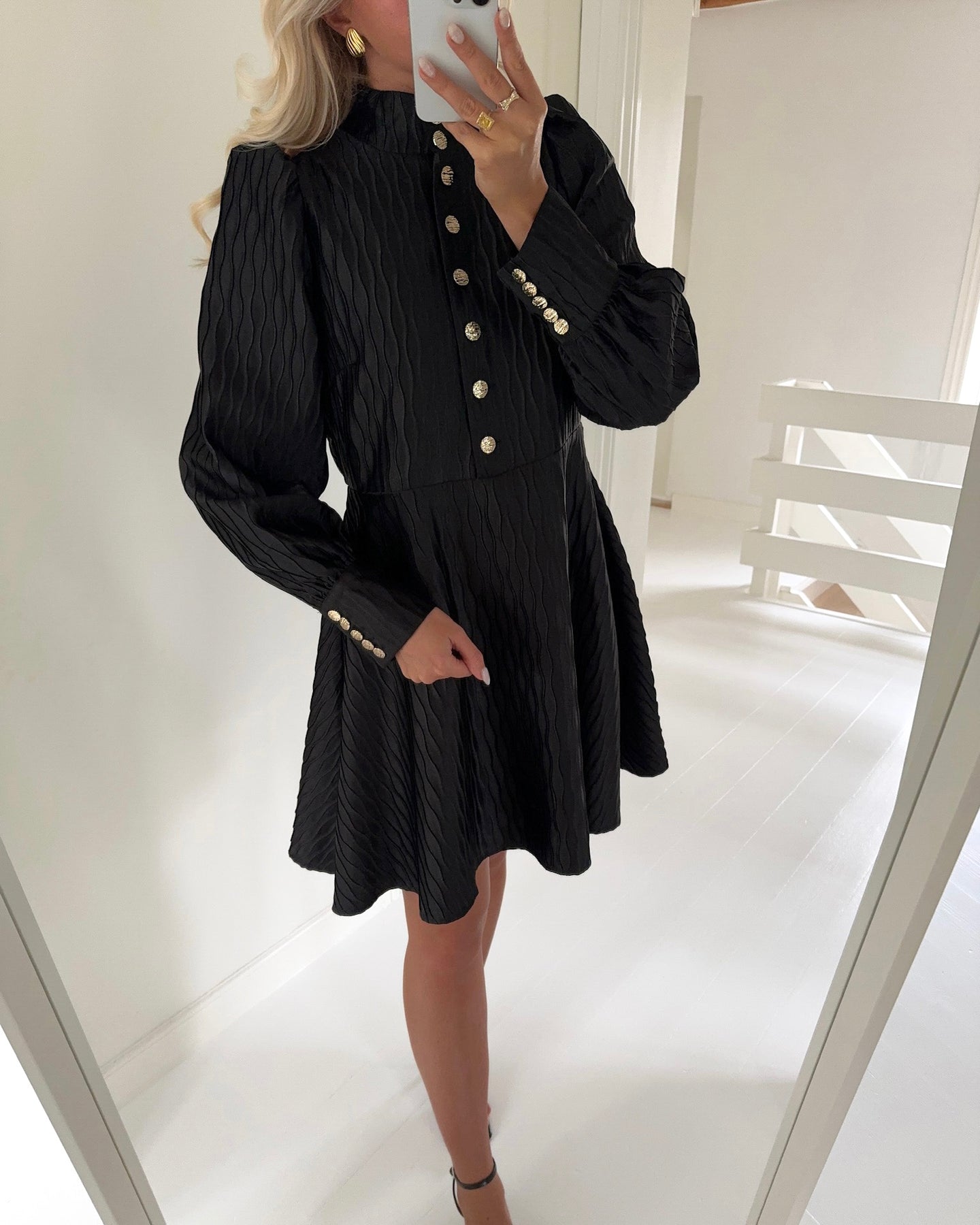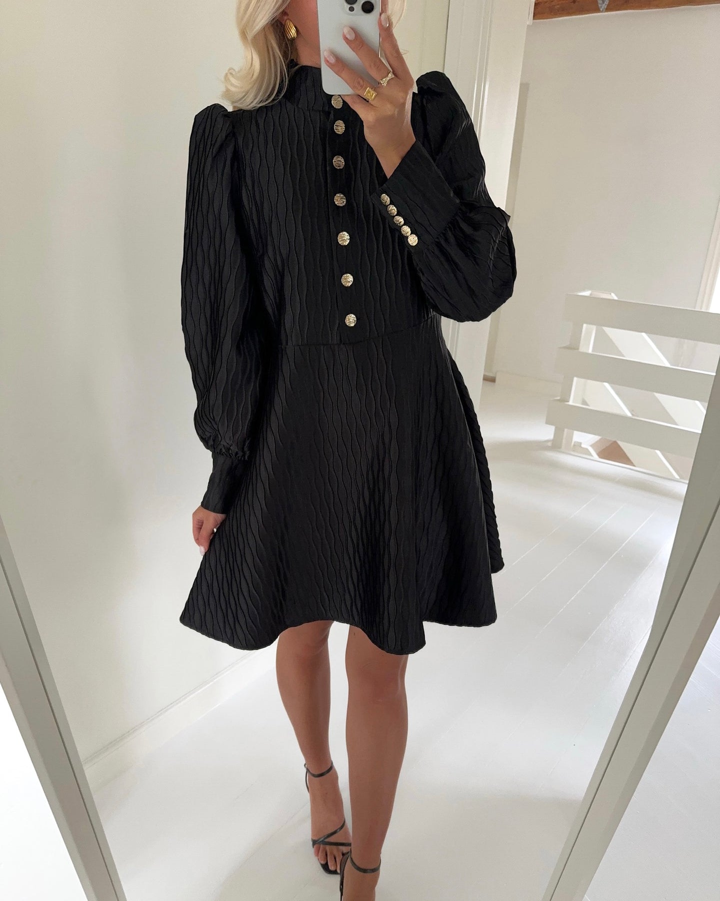 Kjolen har høj hals, smukke guldknapper ned til taljen samt et fint snit i taljen.