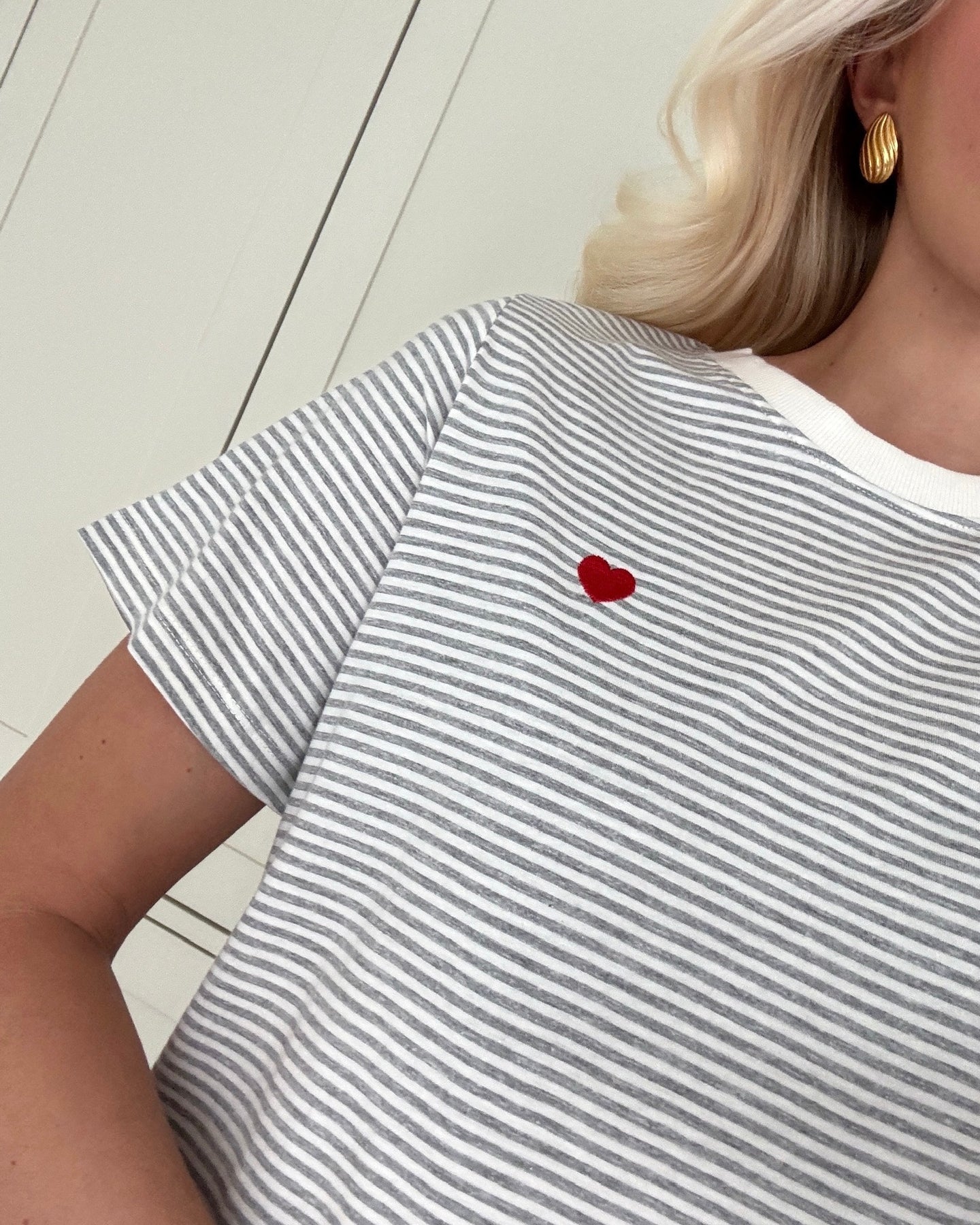 Sød t-shirt i lysegrå/hvid stribet med et sødt rødt broderet hjerte ved brystet.
