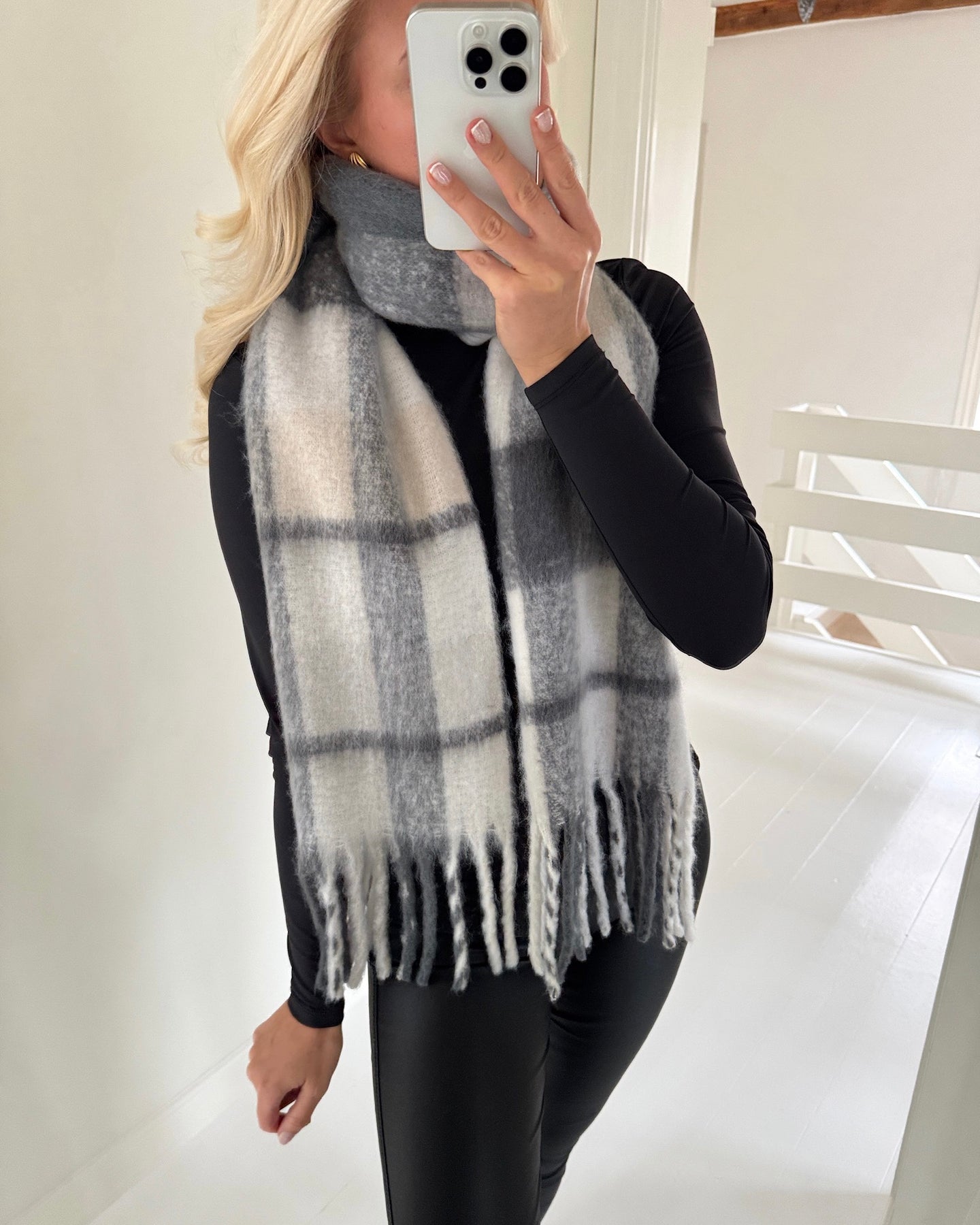 Langt og blødt tørklæde i en skøn grå ternet farve.