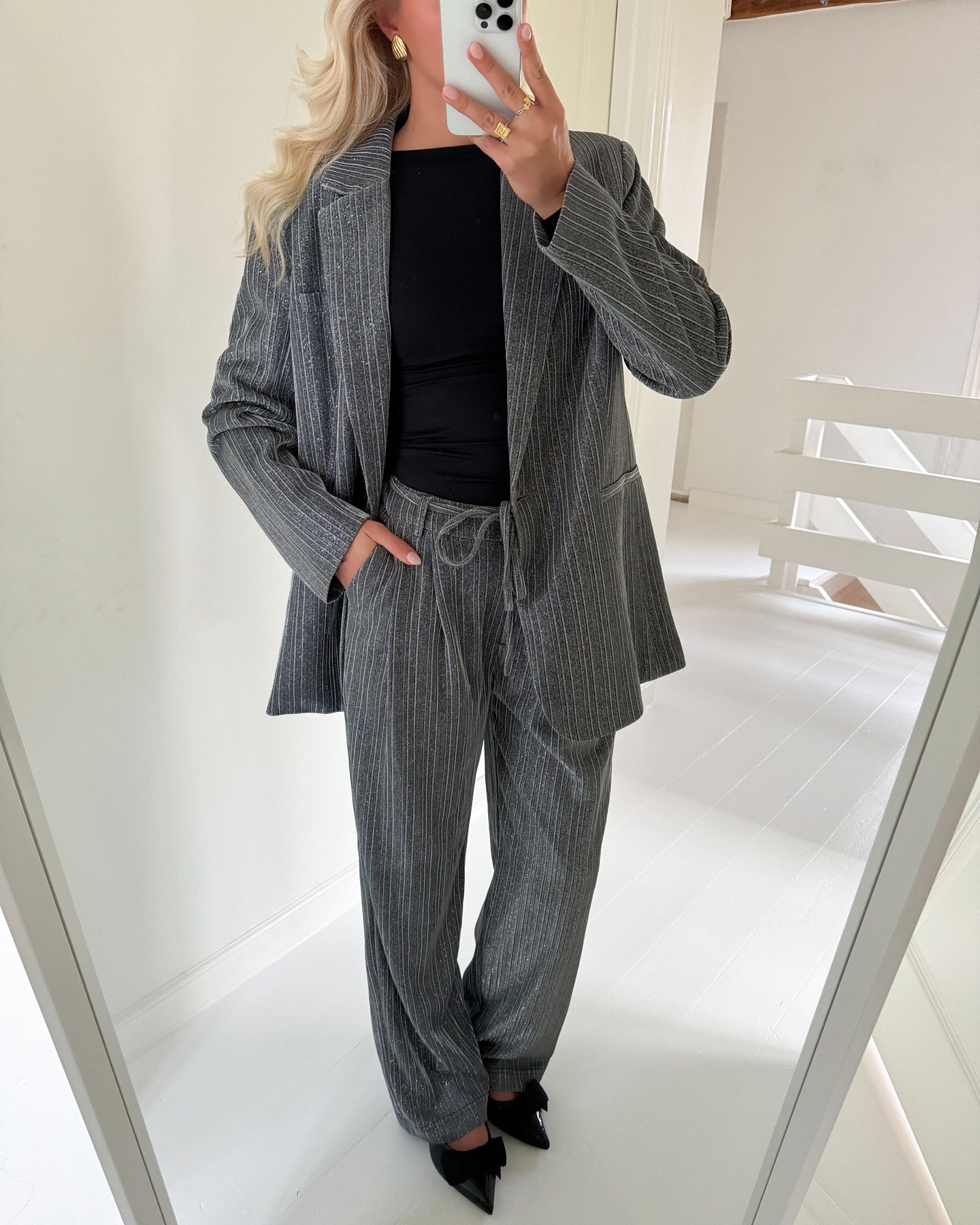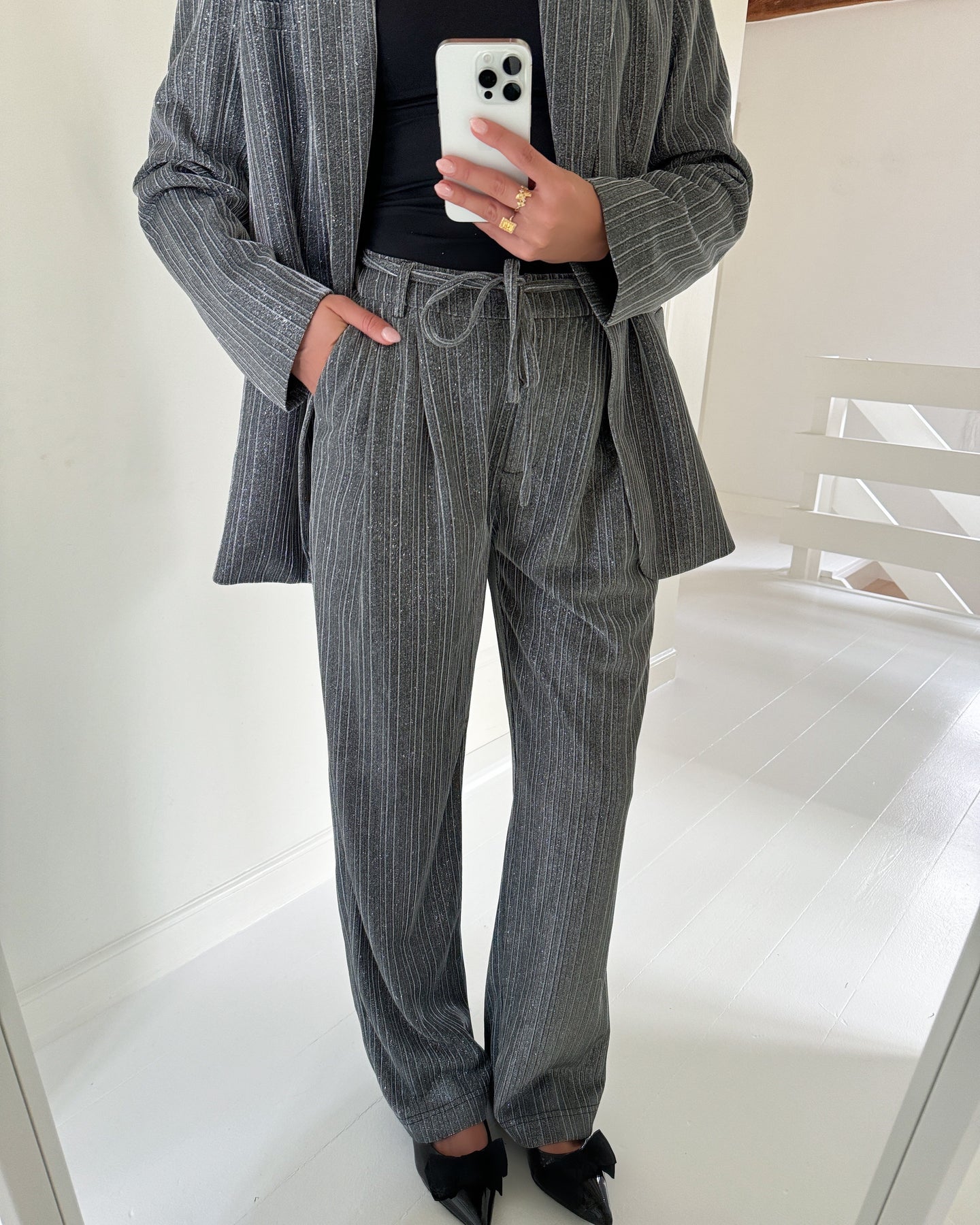 Bukserne har vide ben, lommer både foran og bagved samt et bindebånd taljen.
