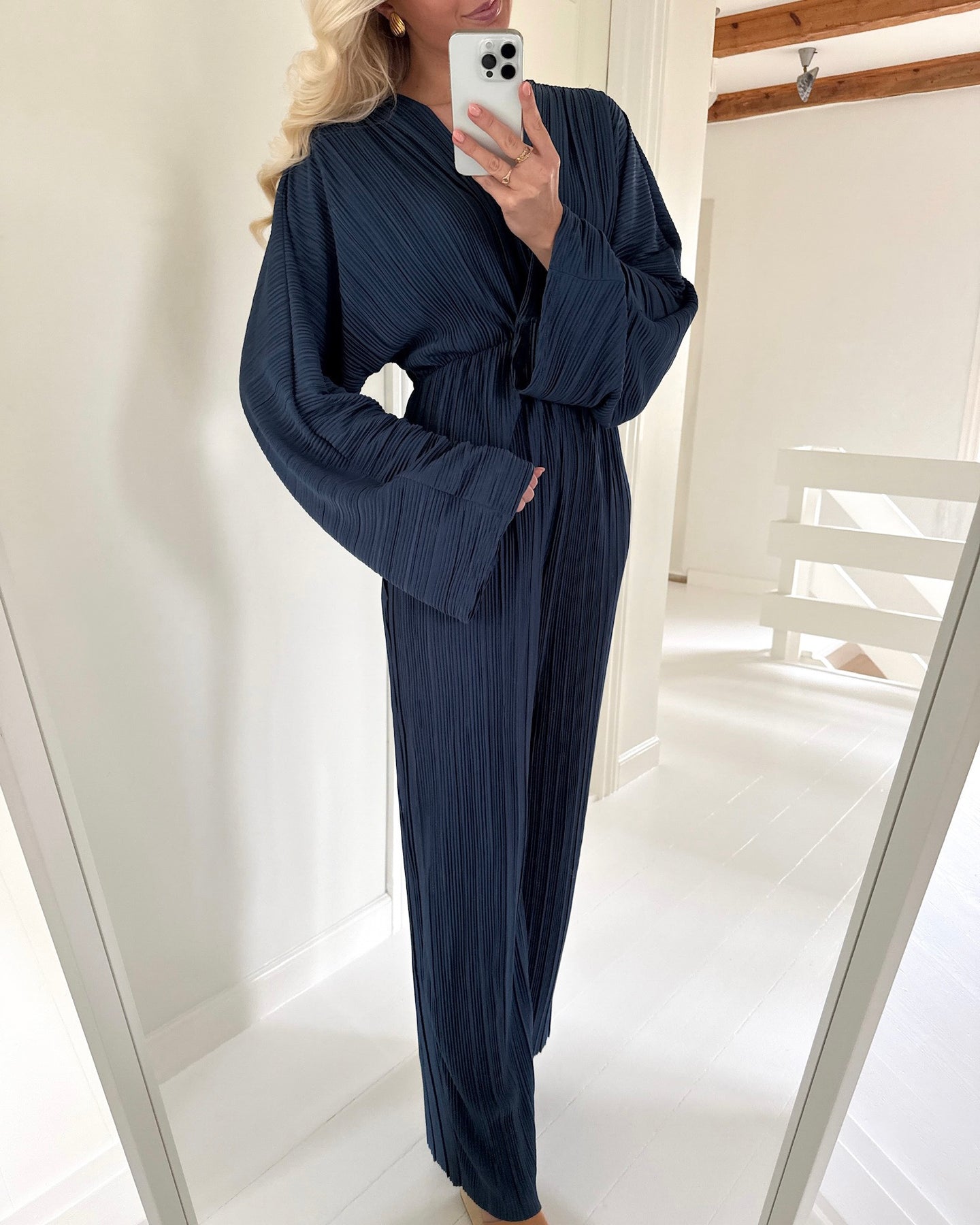 Den har lange løse ærmer, v-udskæring og et fin detalje foran brystet.
