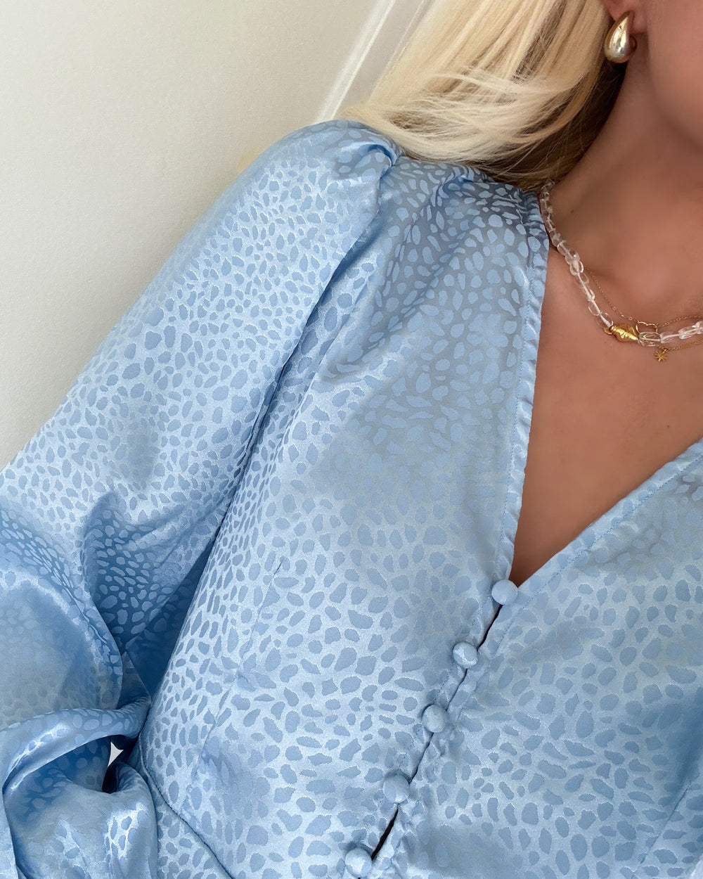 Kjolen er i den fineste lyseblå farve med det sødeste print.