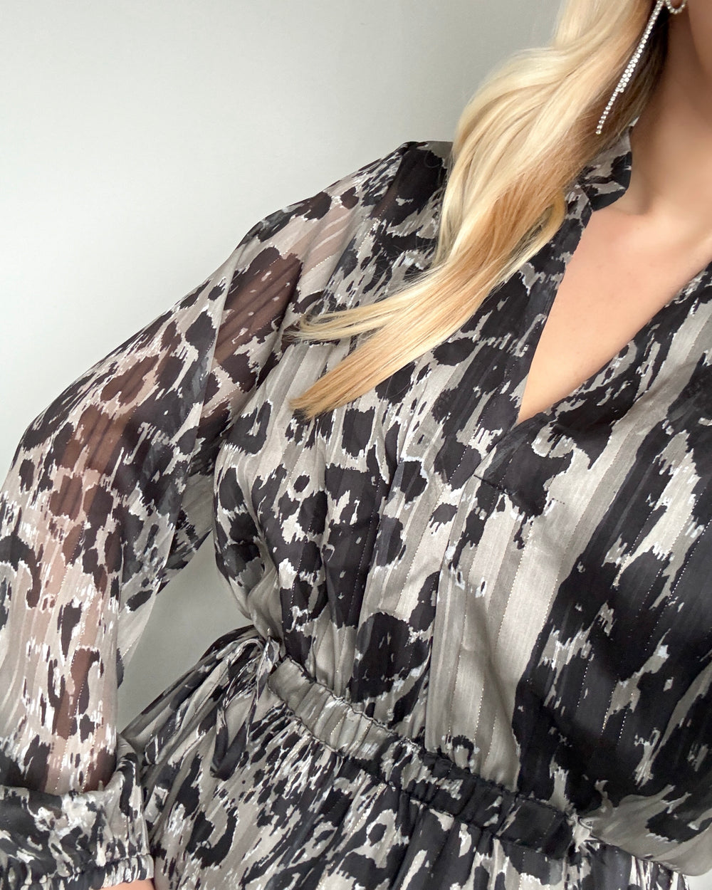 Kjolen har v-udskæring, lange løse ærmer og elastik ved taljen.