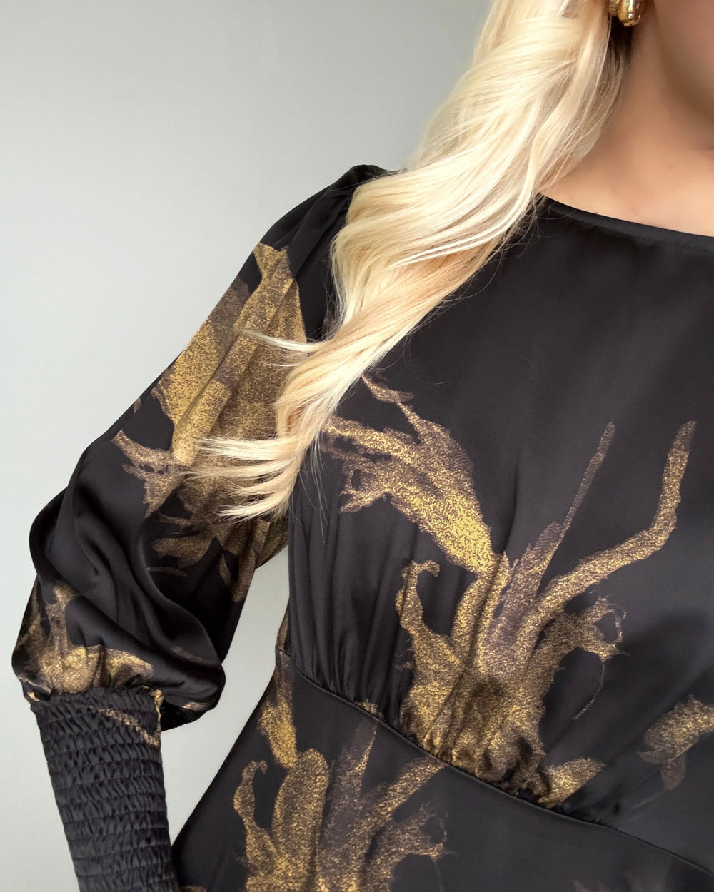 Løs kjole med det fineste print. Kjolen har høj hals og lange ærmer med en smuk lang smockkant.