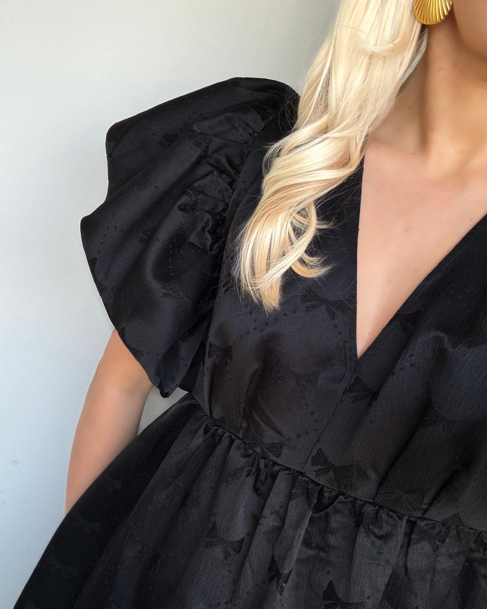 Kjolen har store ærmer, v-udskæring og et feminint snit i taljen.