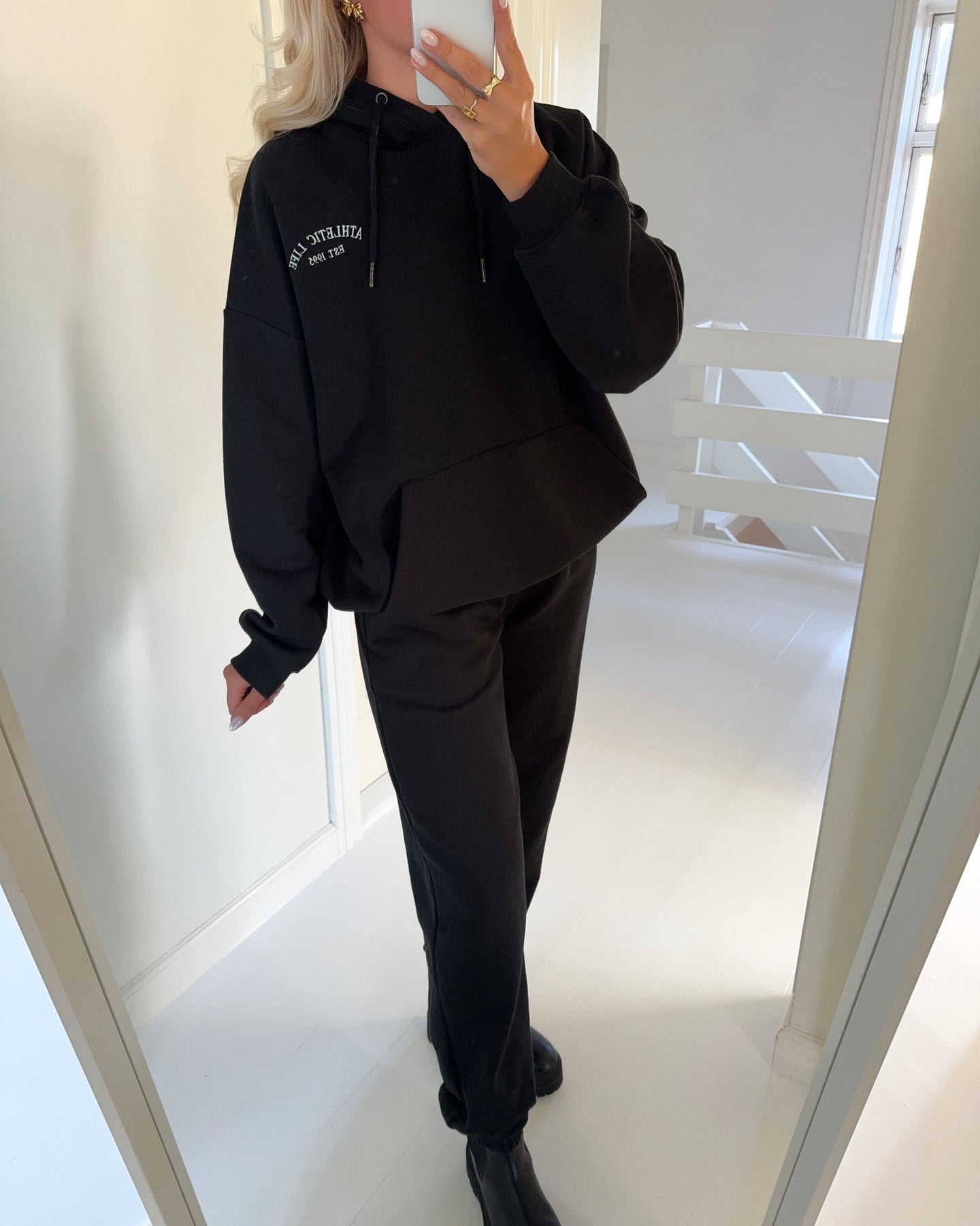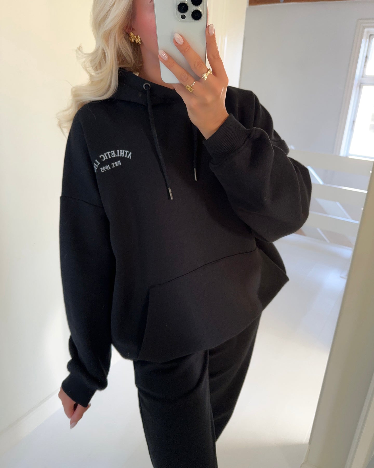 Hættetrøje i en blød og tyk bomuldsmix i klassisk sort med broderet tekst.