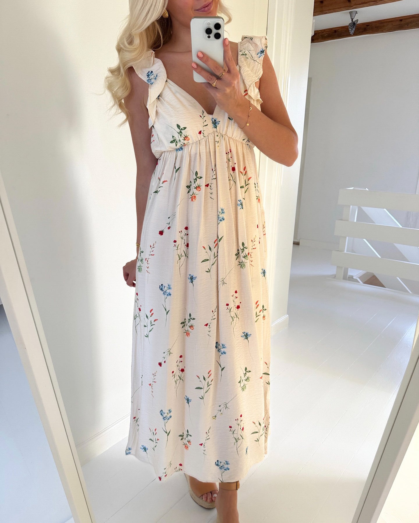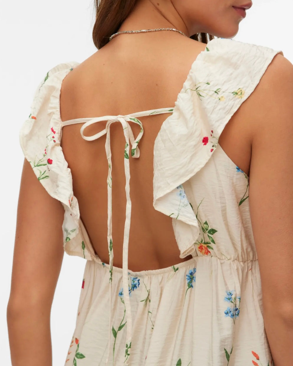 Kjolen har korte ærmer med flæser, en sød v-udskæring samt en åben ryg.