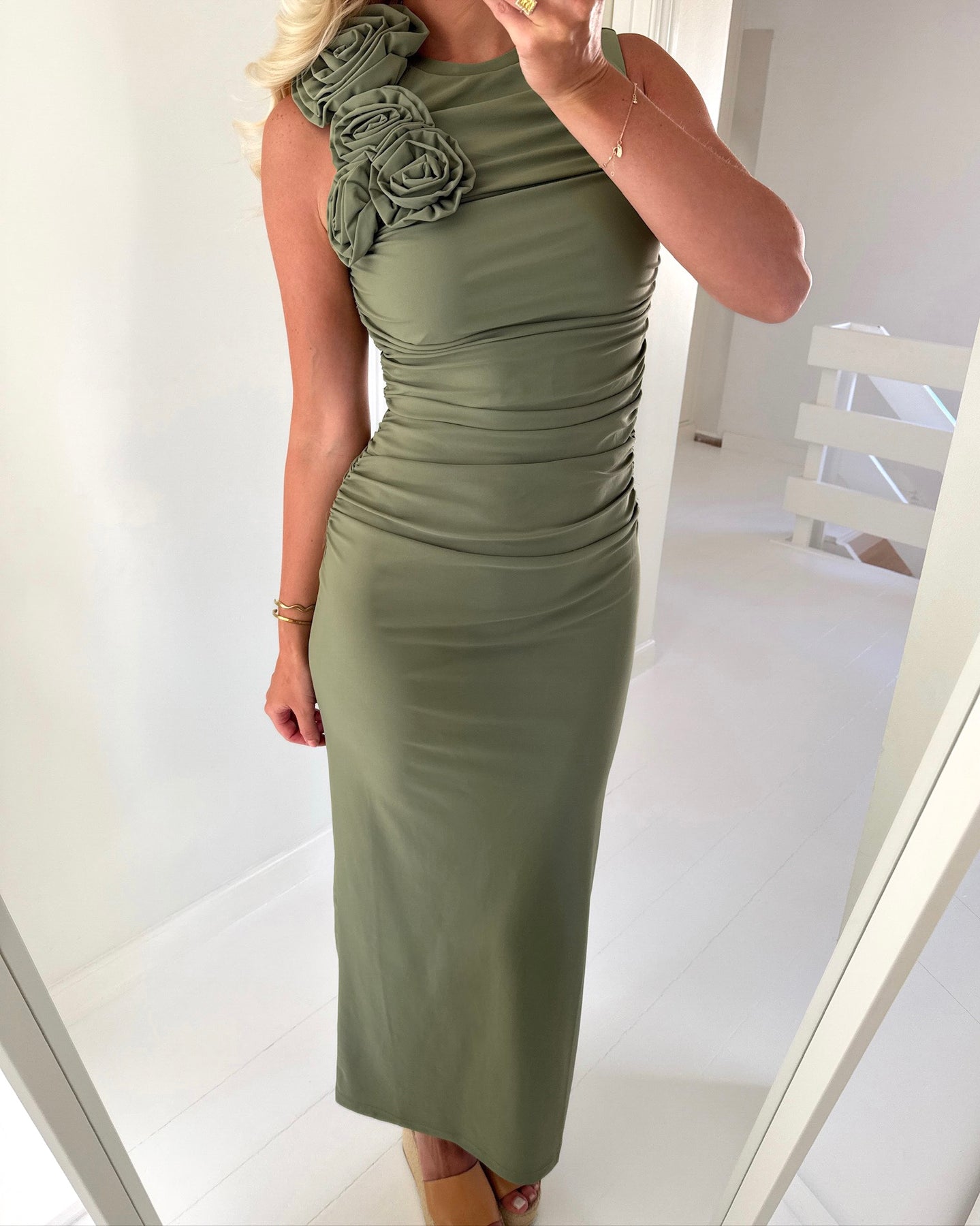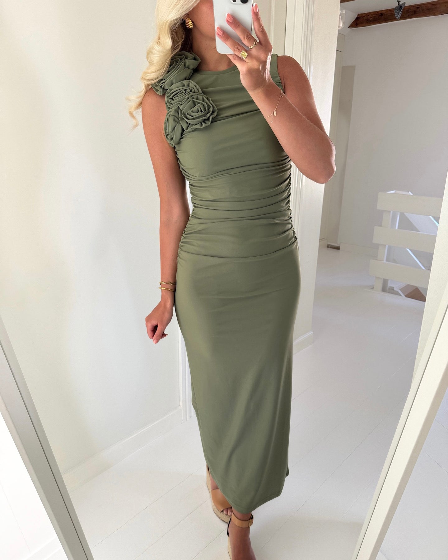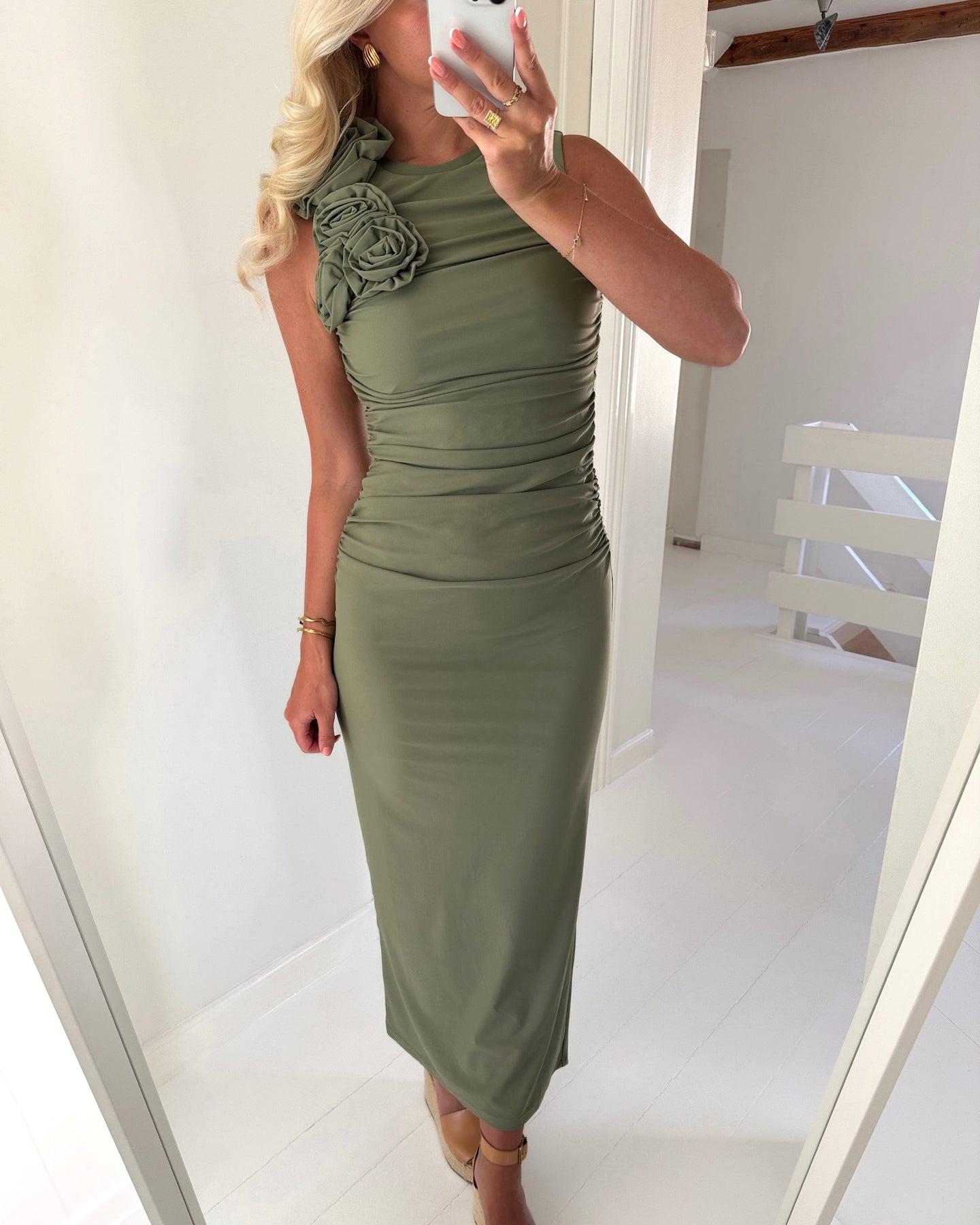 Utrolig yndig kjole i en fin grøn farve med søde blomsterdetaljer over den ene skulder.