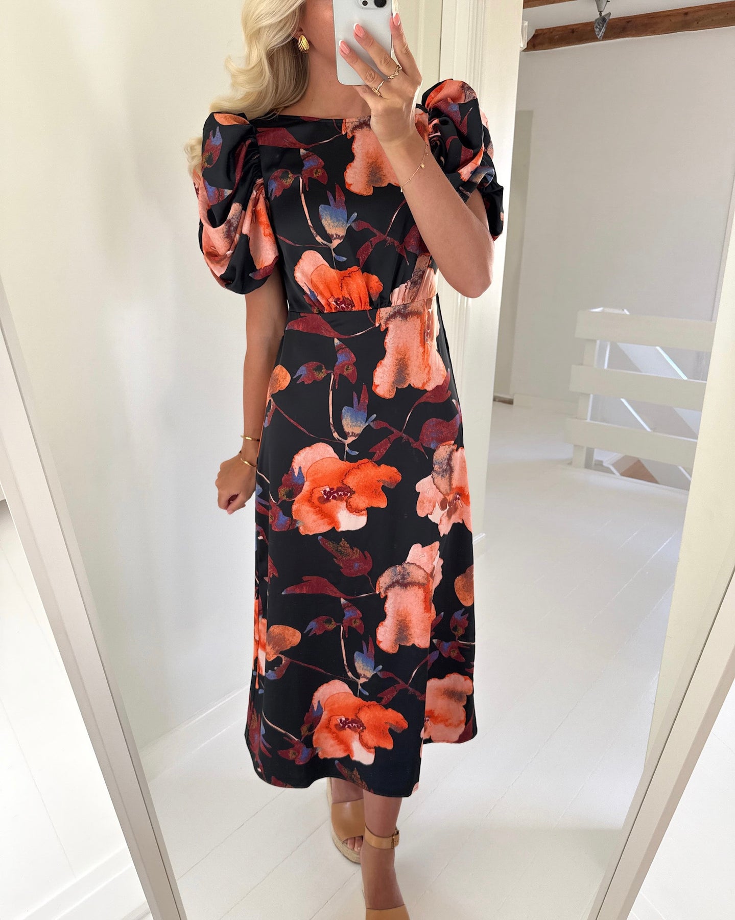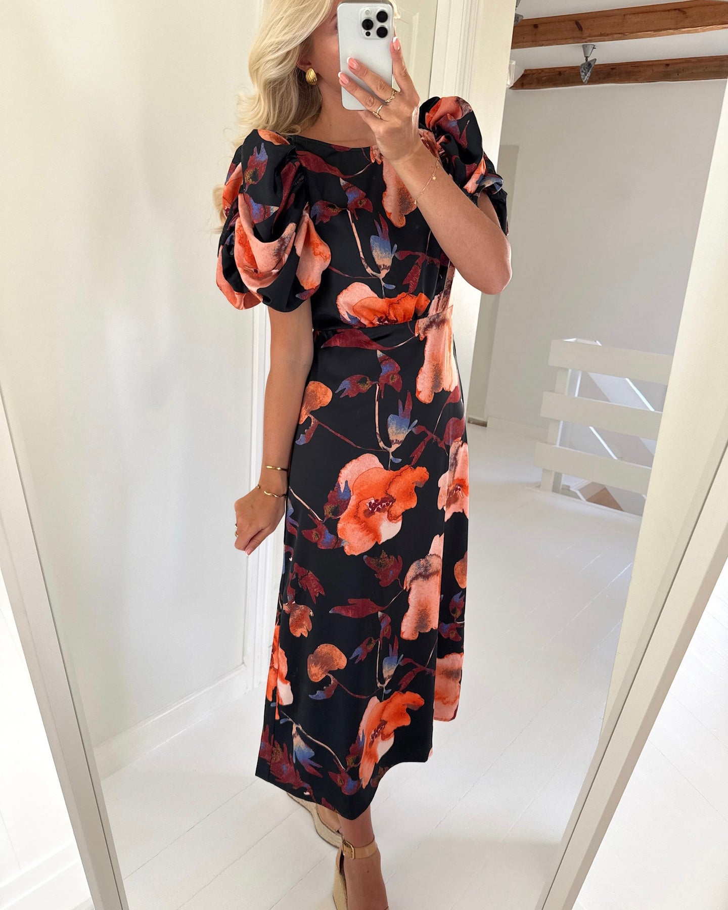 Smuk kjole i en klassisk sort farve med det fineste blomsterprint.