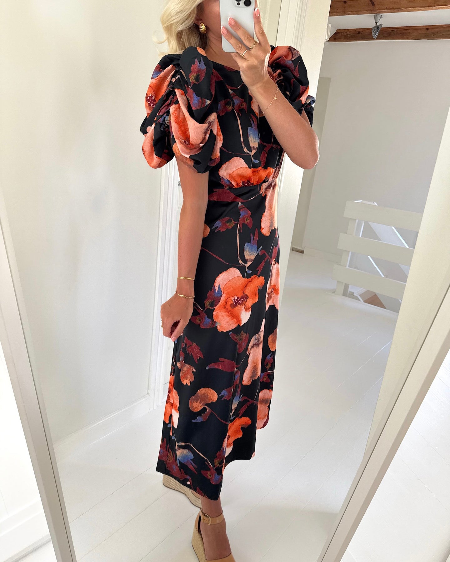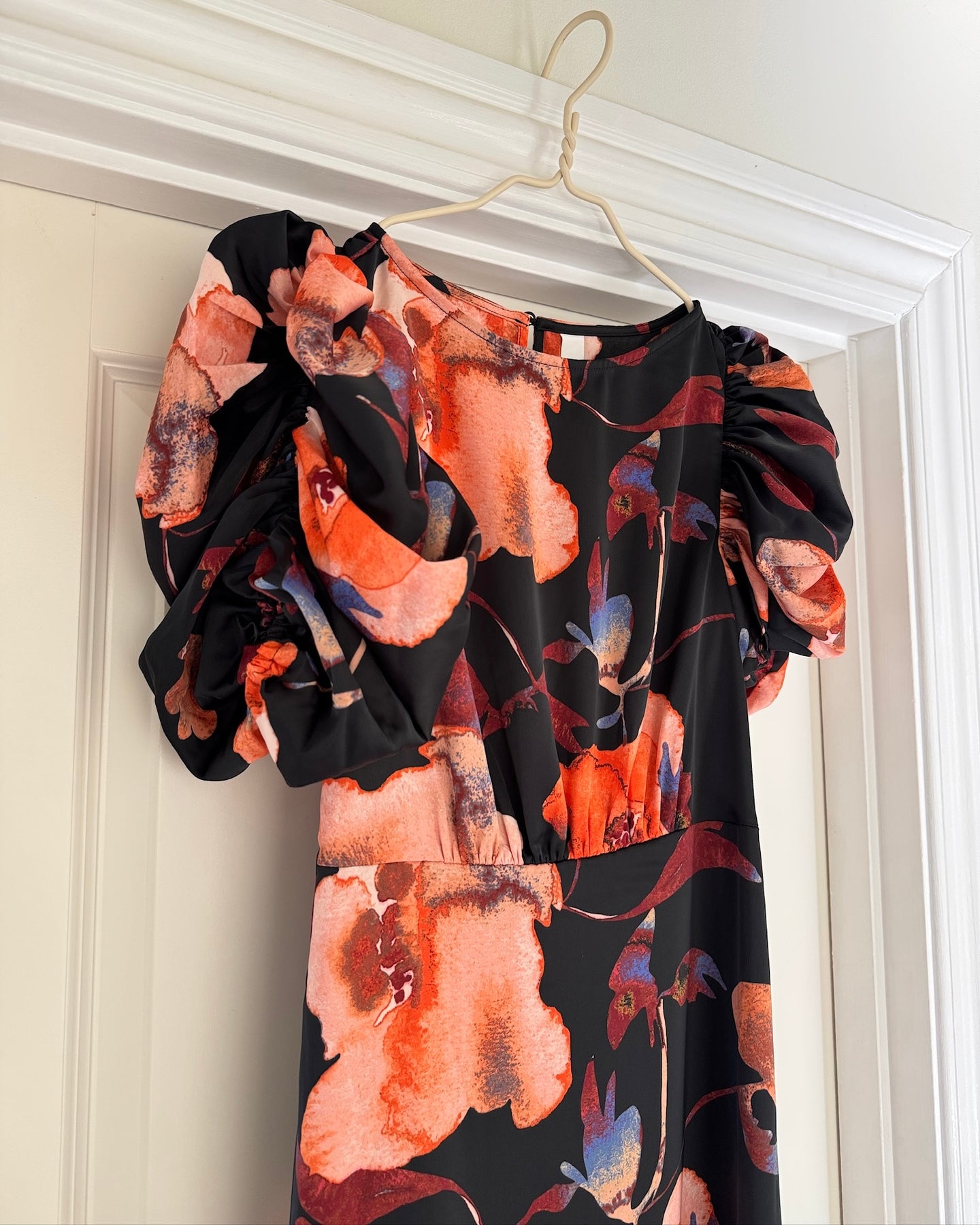 Kjolen har en rundet hals, puffede ærmer og et snit ved taljen.