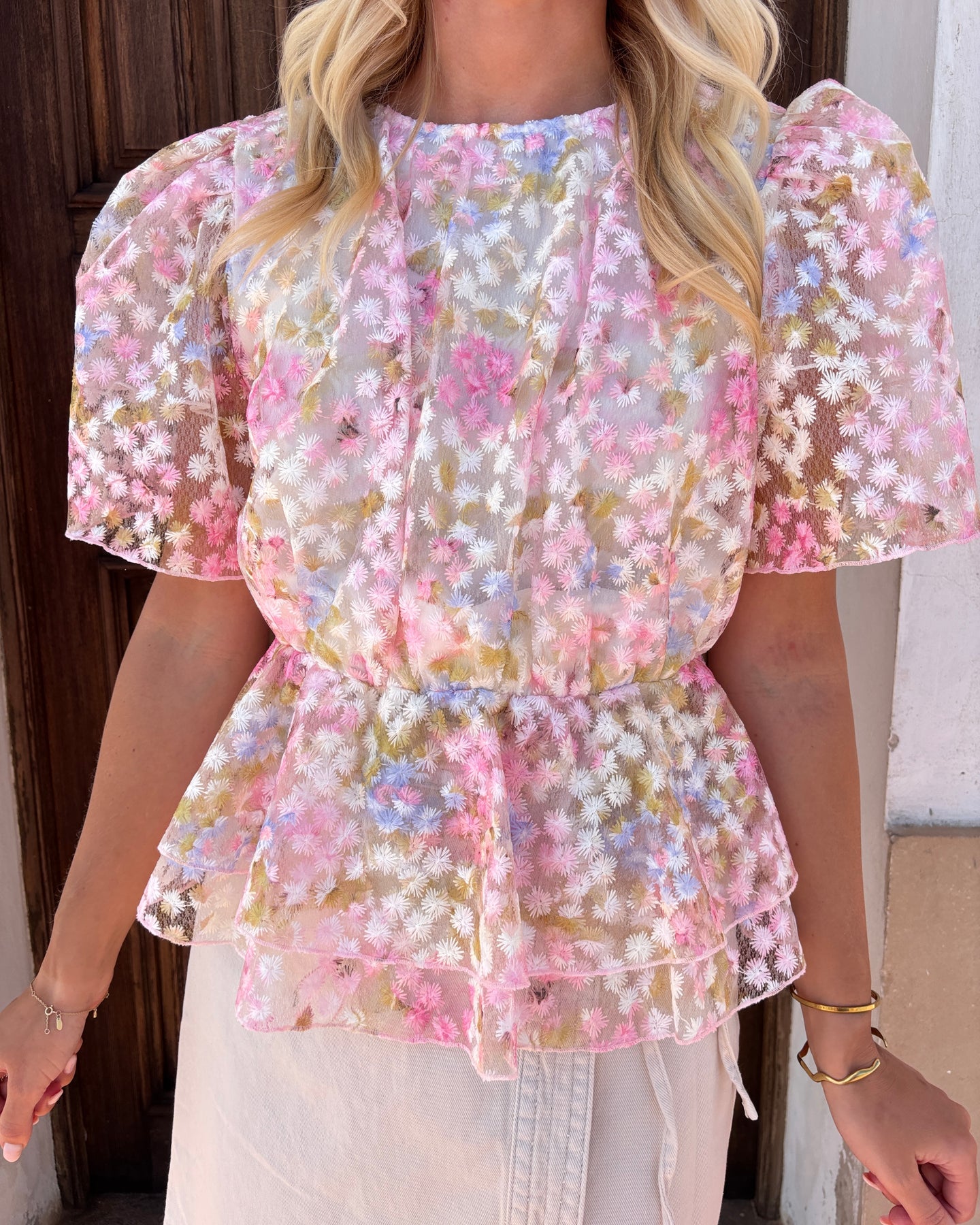 Utrolig smuk hvid top med det fineste blomsterprint og fine broderede blomster med glimmer.