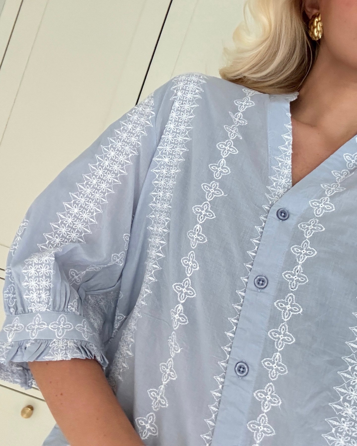 Skjorte i en lækker lyseblå farve med eksklusivt hvid broderi.