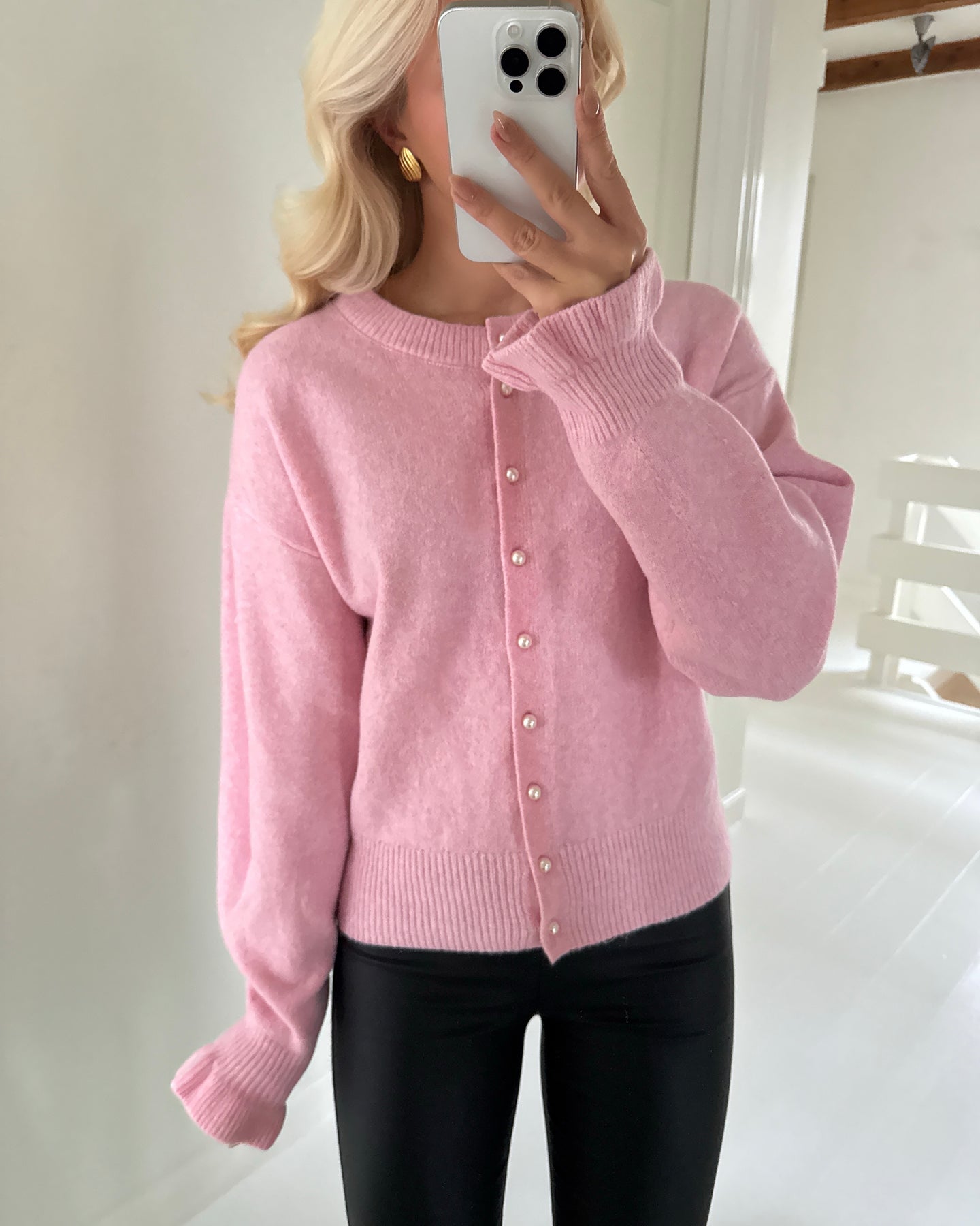 Smuk cardigan i en fin lyserød farve med perleknapper.