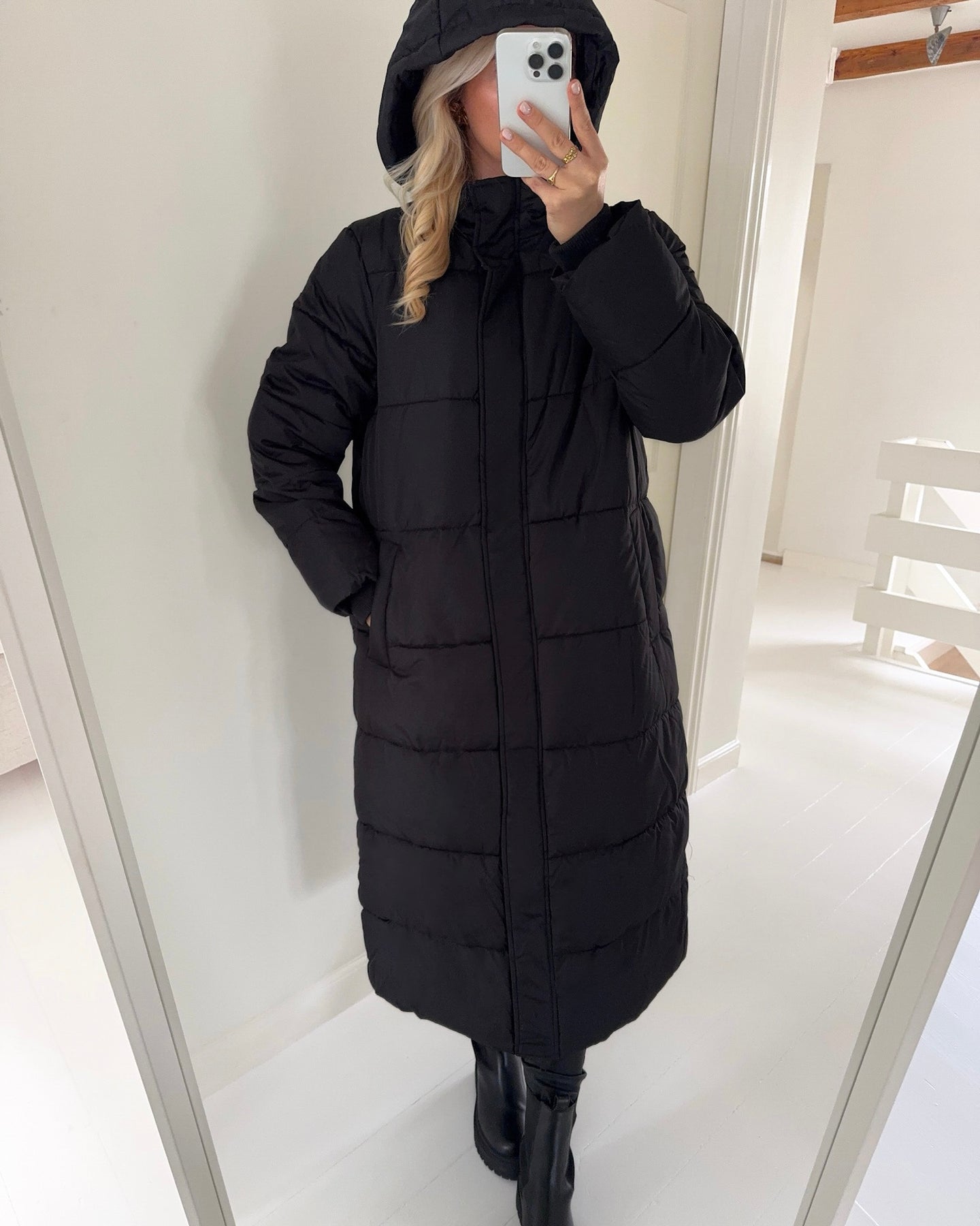 Fineste jakke i sort med hætte, høj krave og lynlås hele vejen ned.