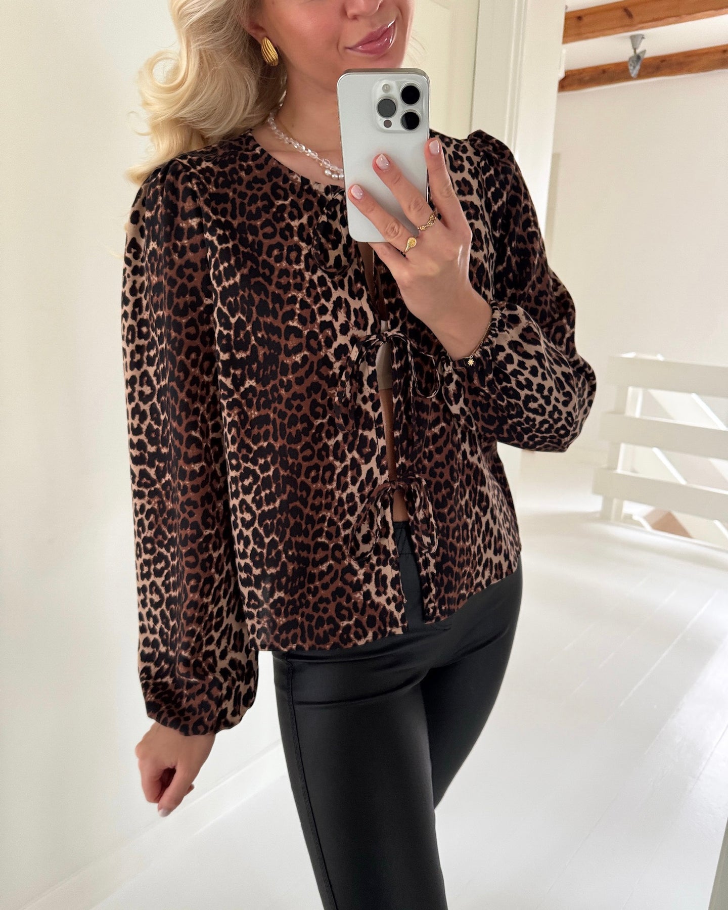 Skøn bluse i med det lækreste leopardprint med bindedetaljer foran.