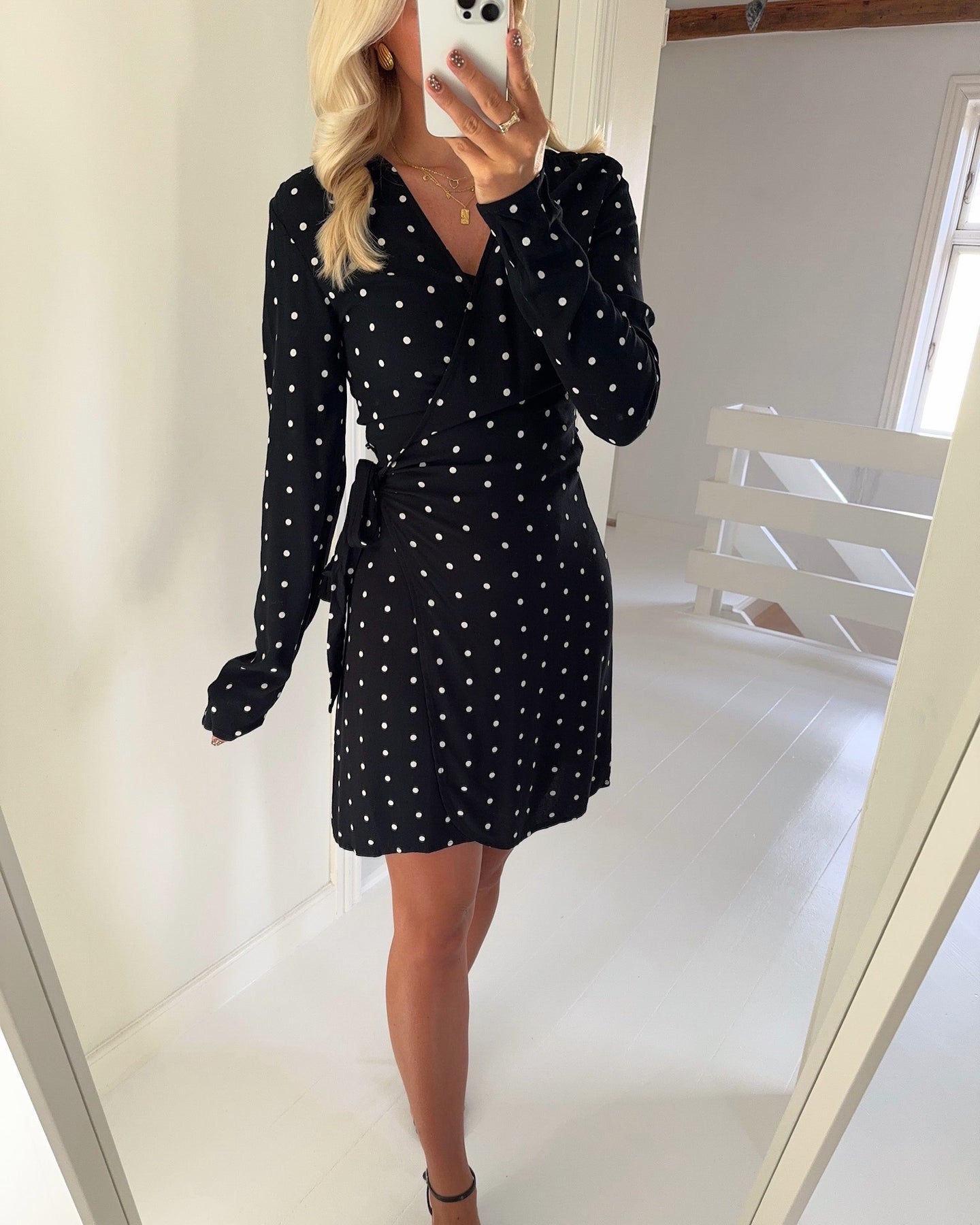 Utrolig smuk wrap-kjole i en klassisk sort med hvide polkaprikker.