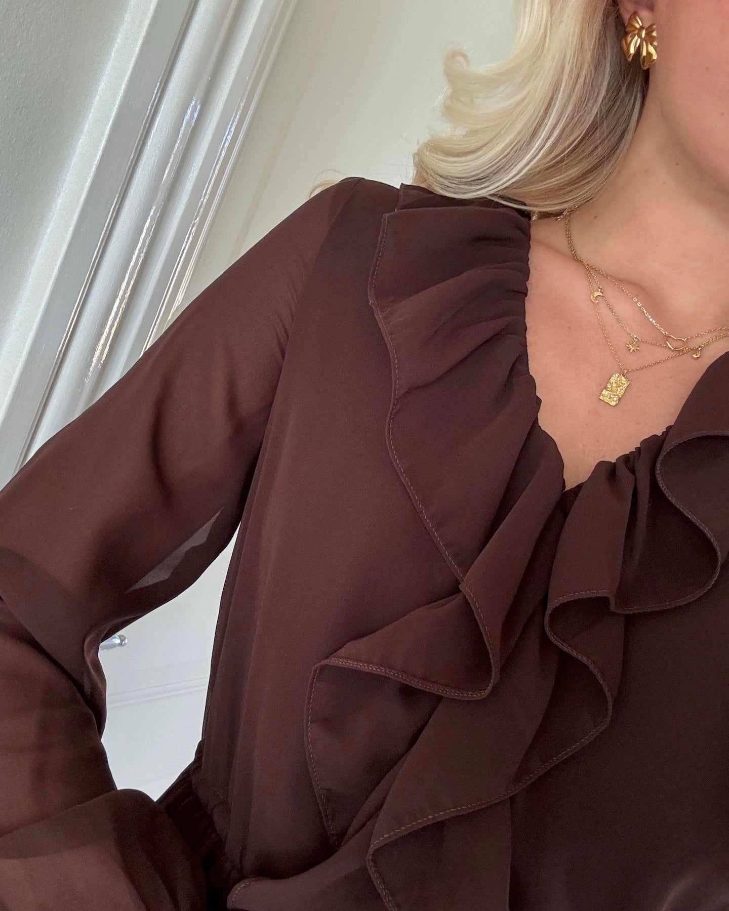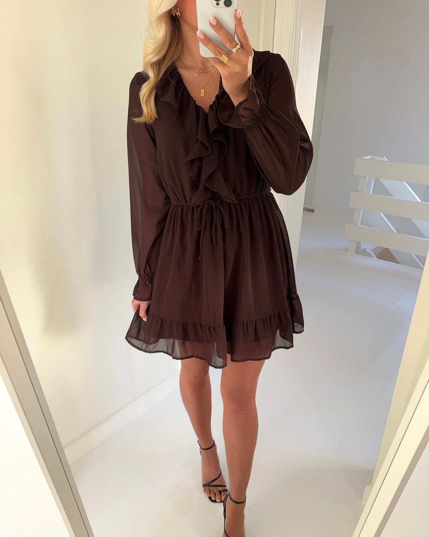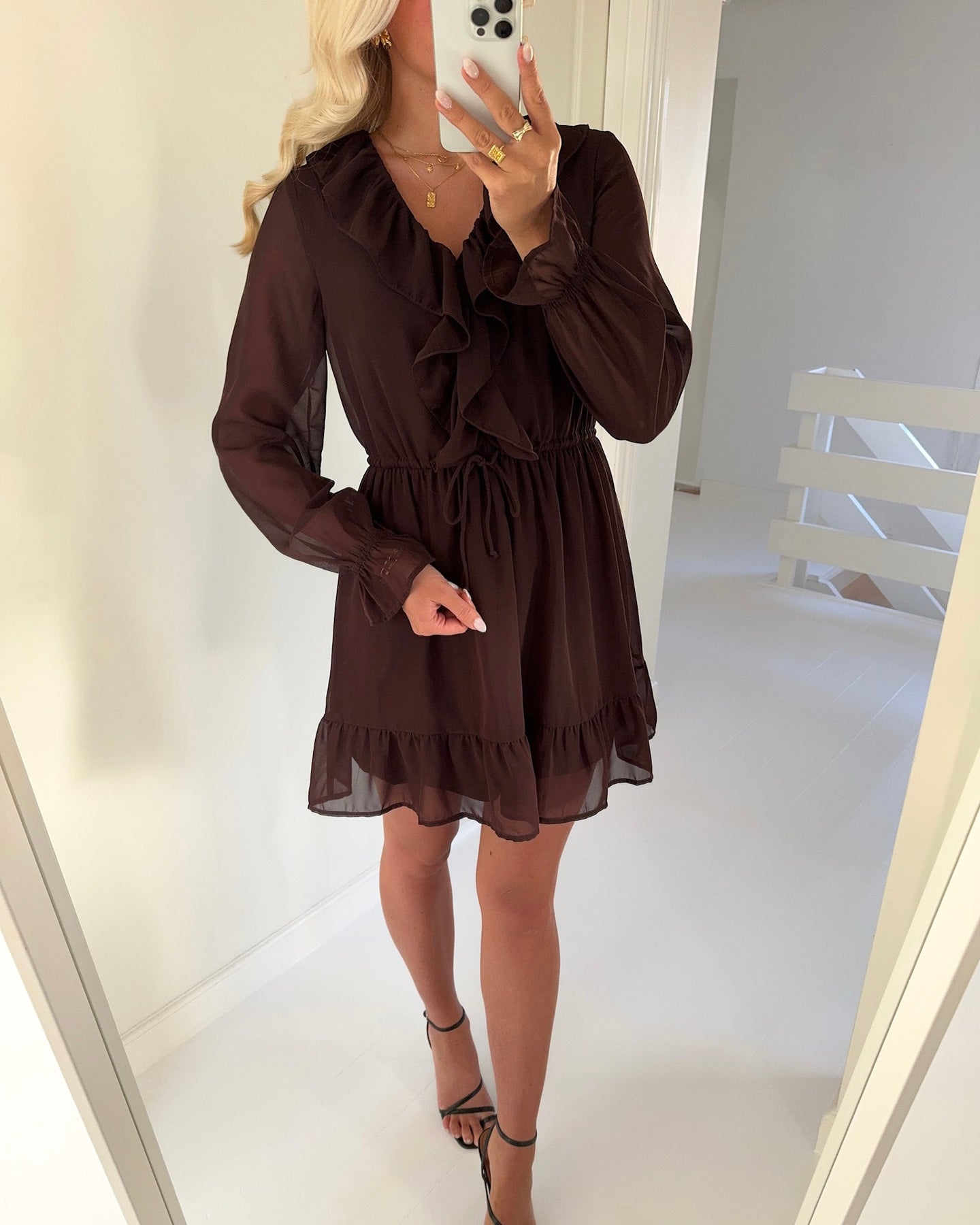 Kjolen har en sød v-udskæring, fine flæsedetaljer og bindbånd.