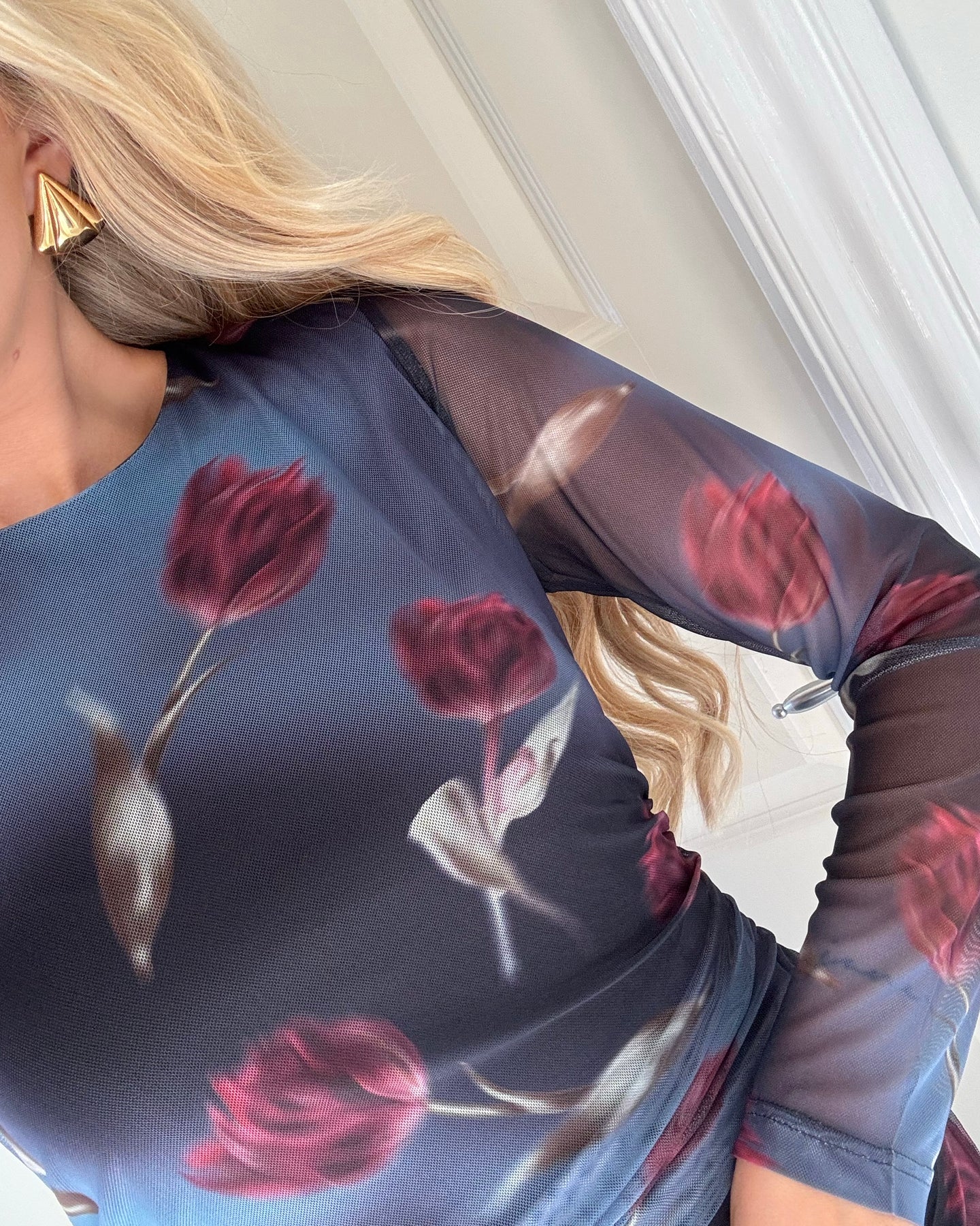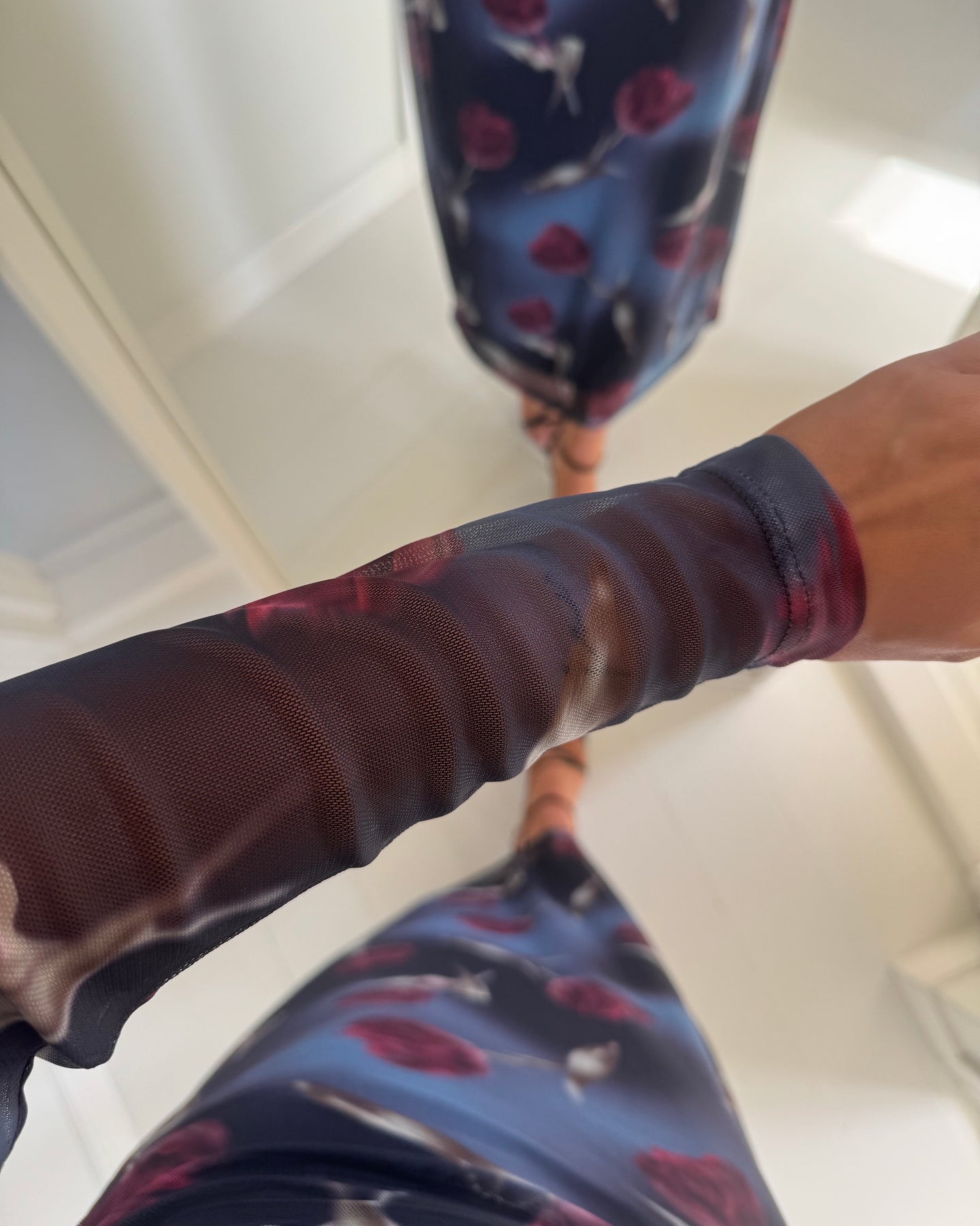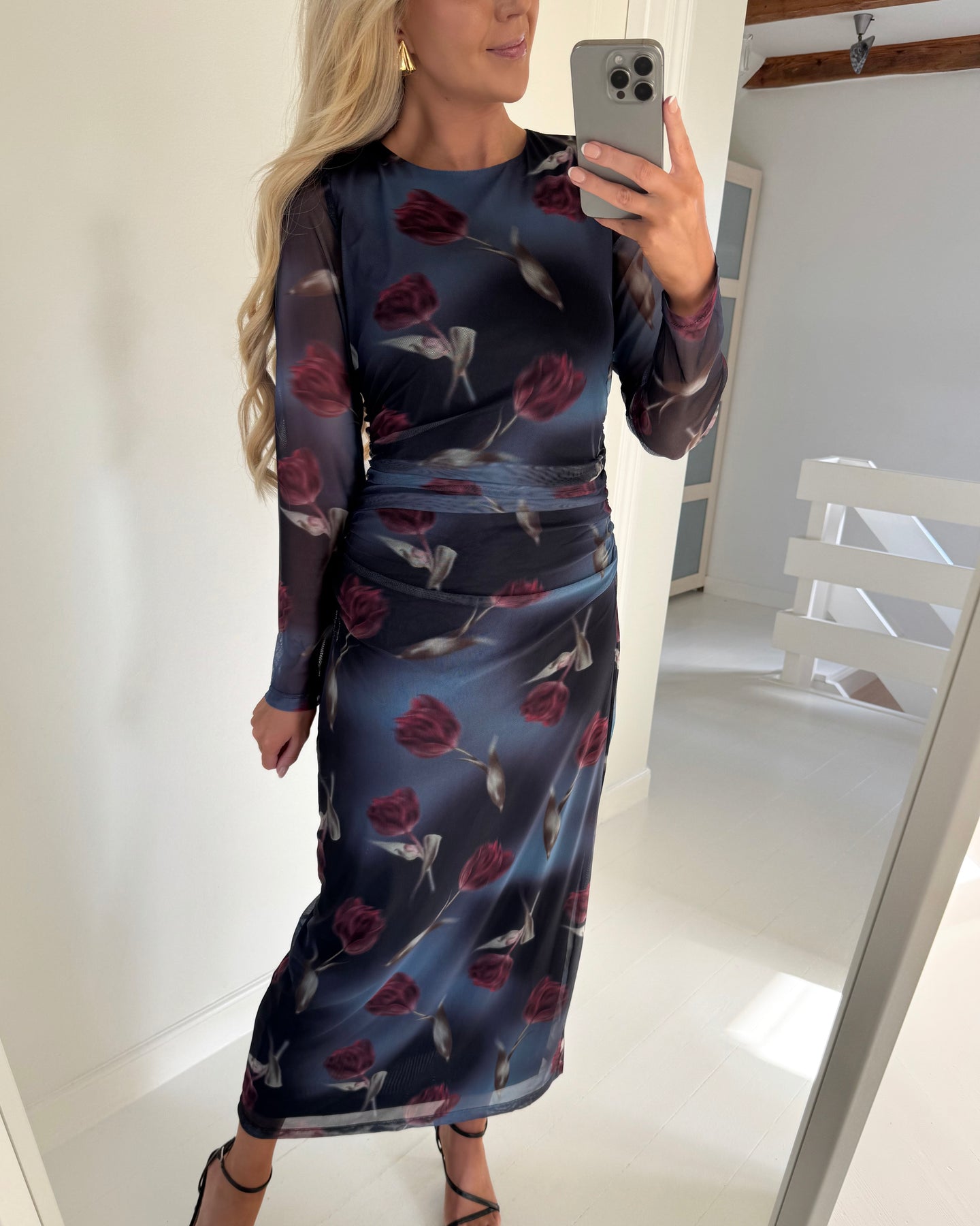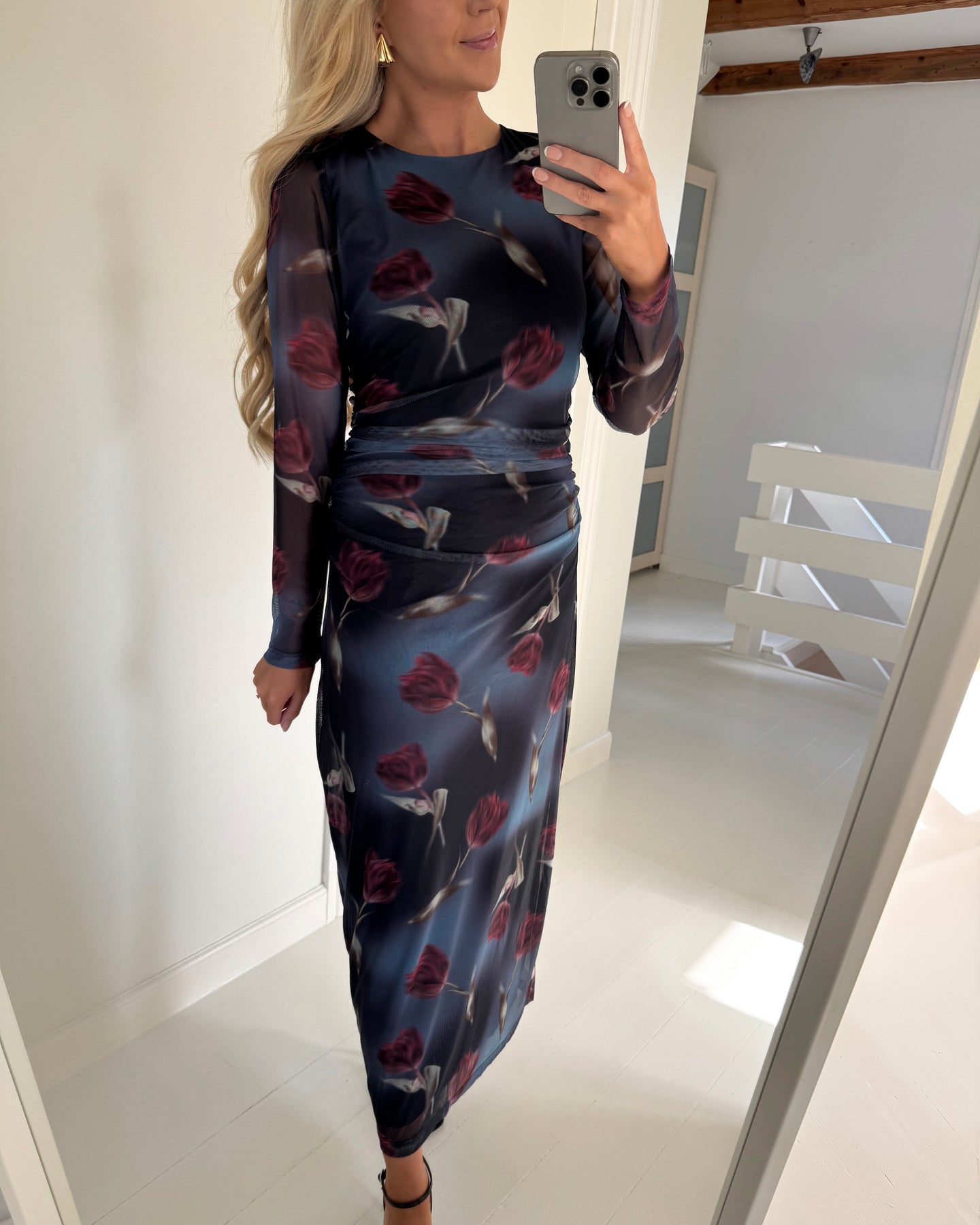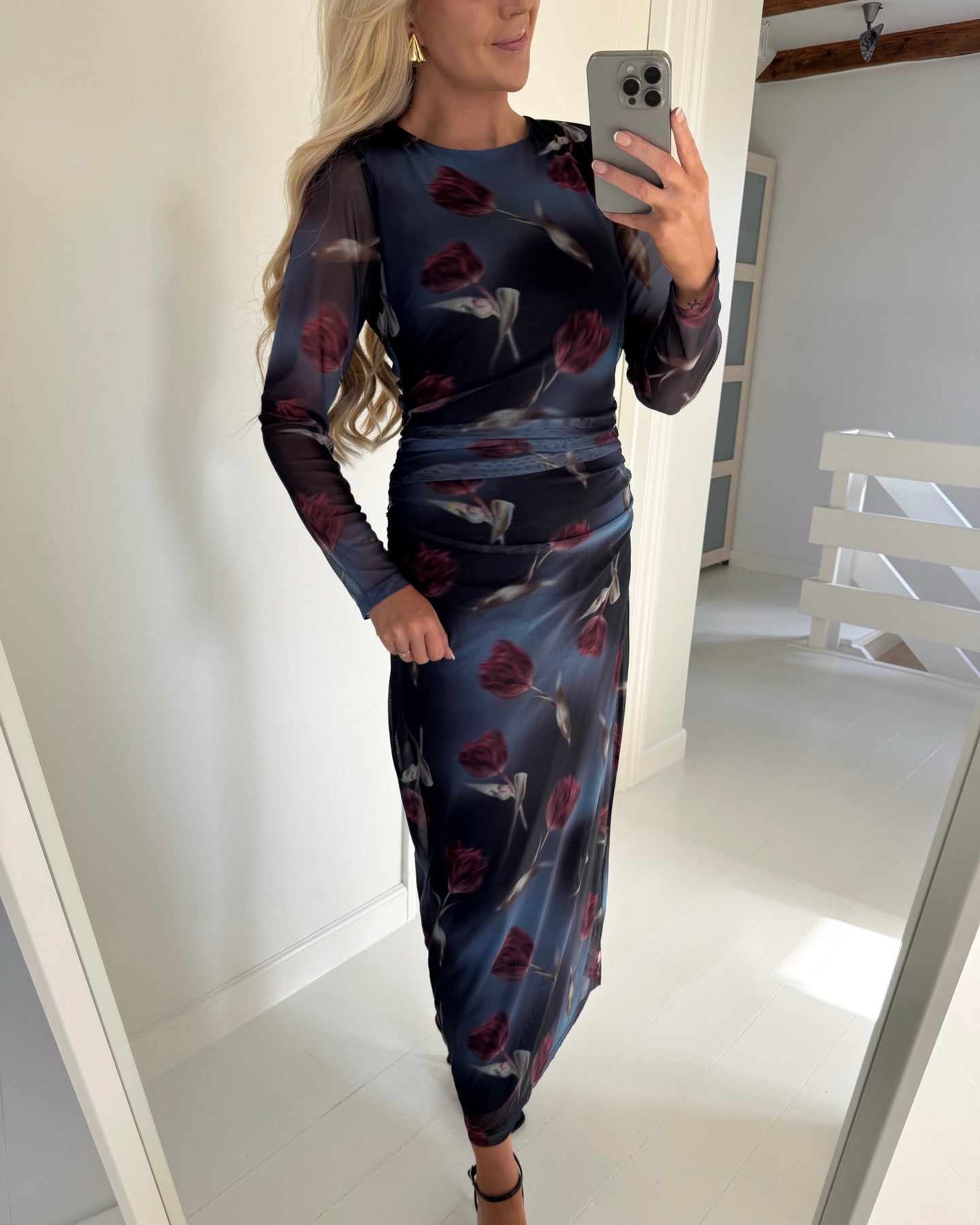Skøn lang mesh kjole i en klassisk sort med fint blomsterprint.