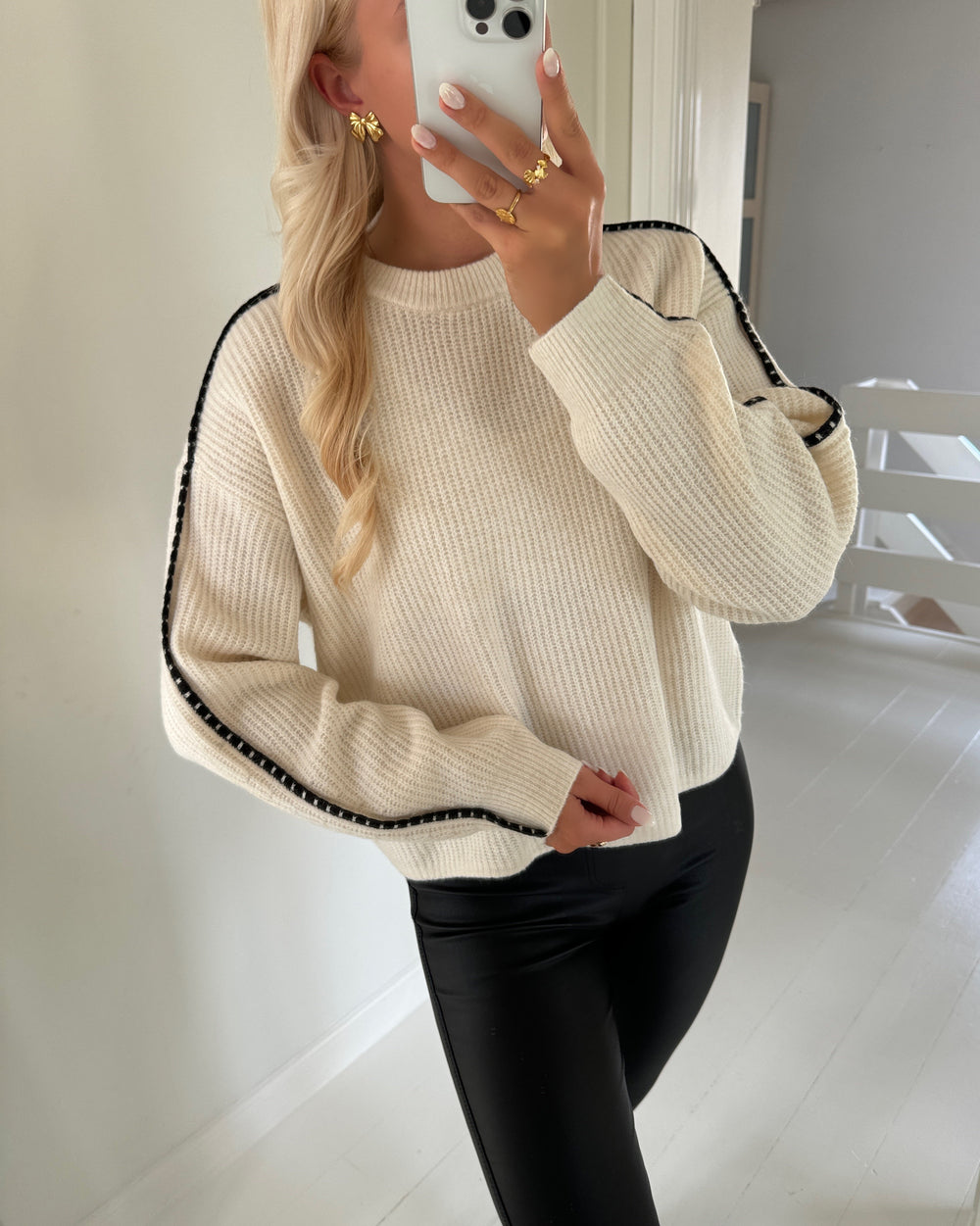 Striktrøjen har lange ærmer og en rund hals samt detaljer nedad ærmet.