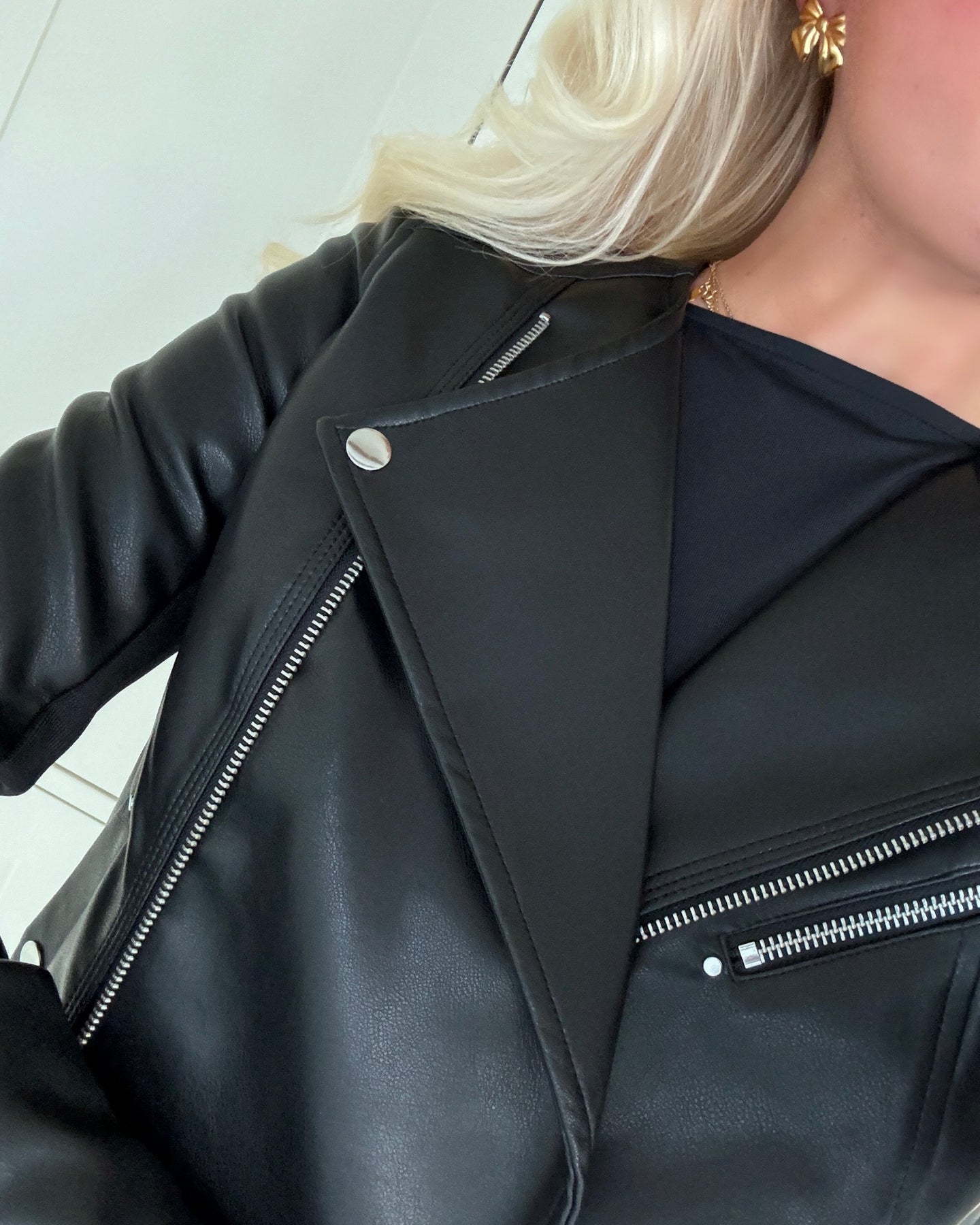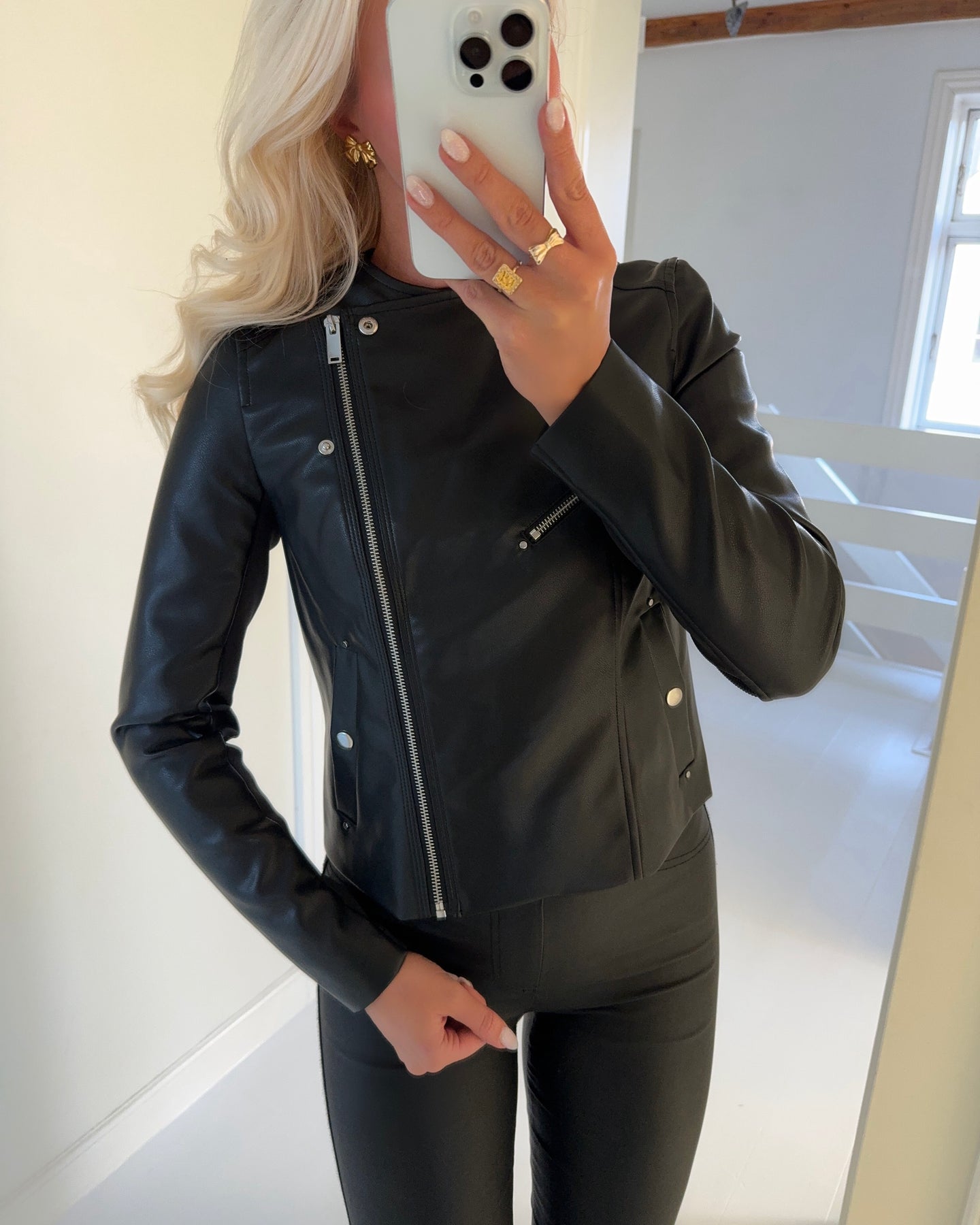 Jakken har lange ærmer, lommer med trykknapper samt lynlåsdetaljer.