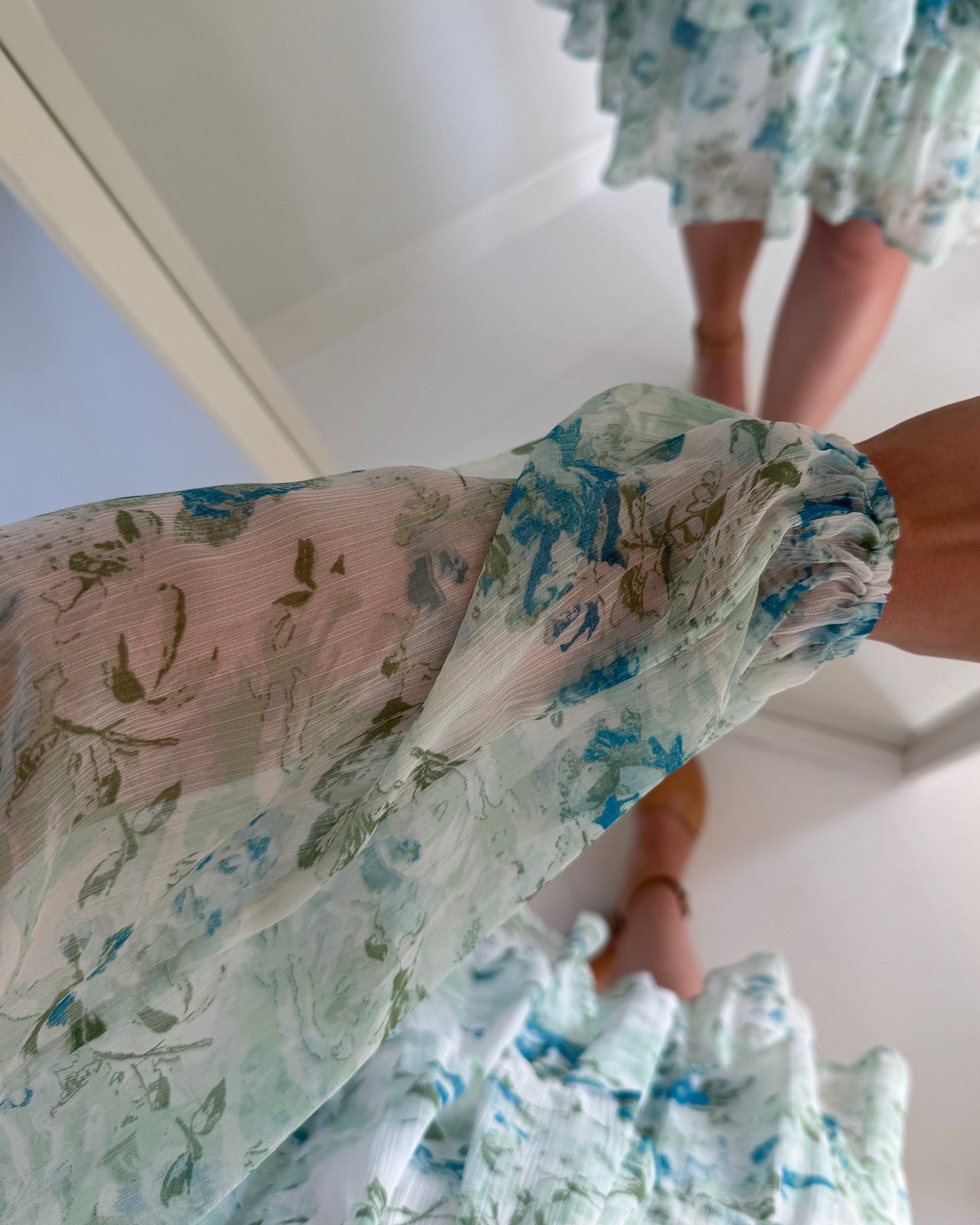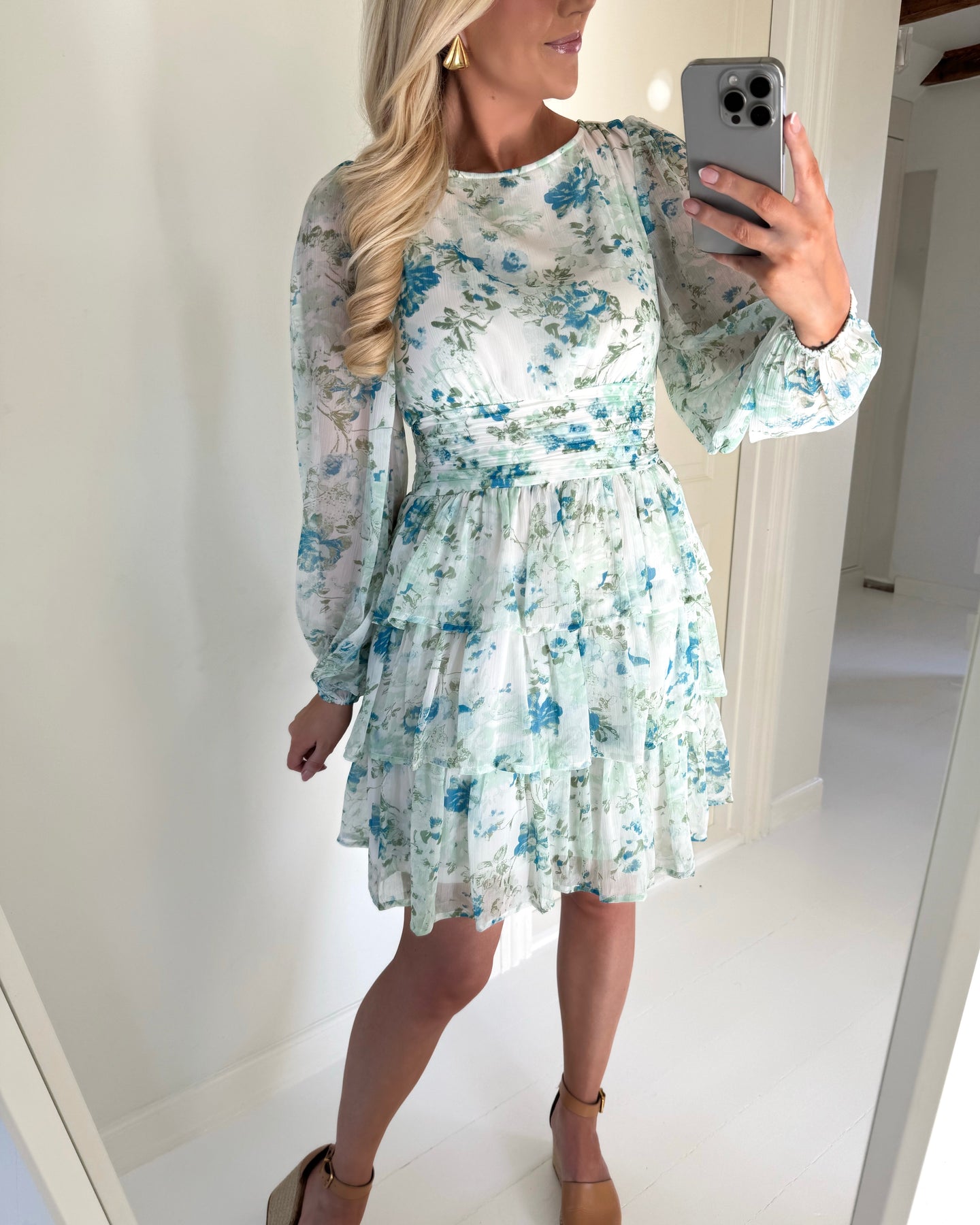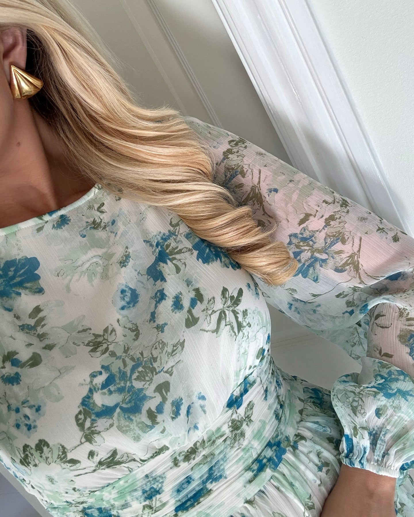 Skøn kjole i en fin hvid farve med lyseblå og grønt blomsterprint.
