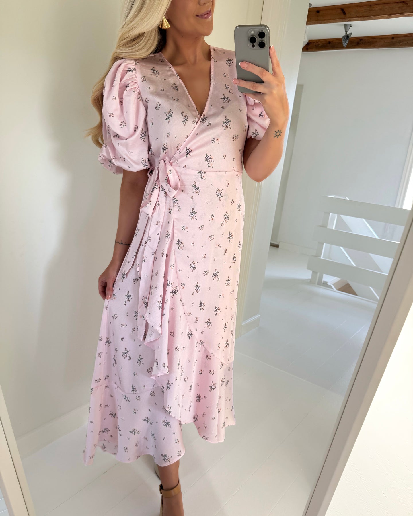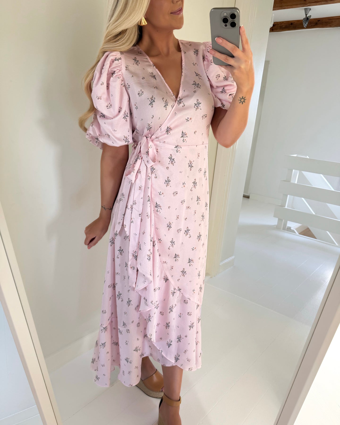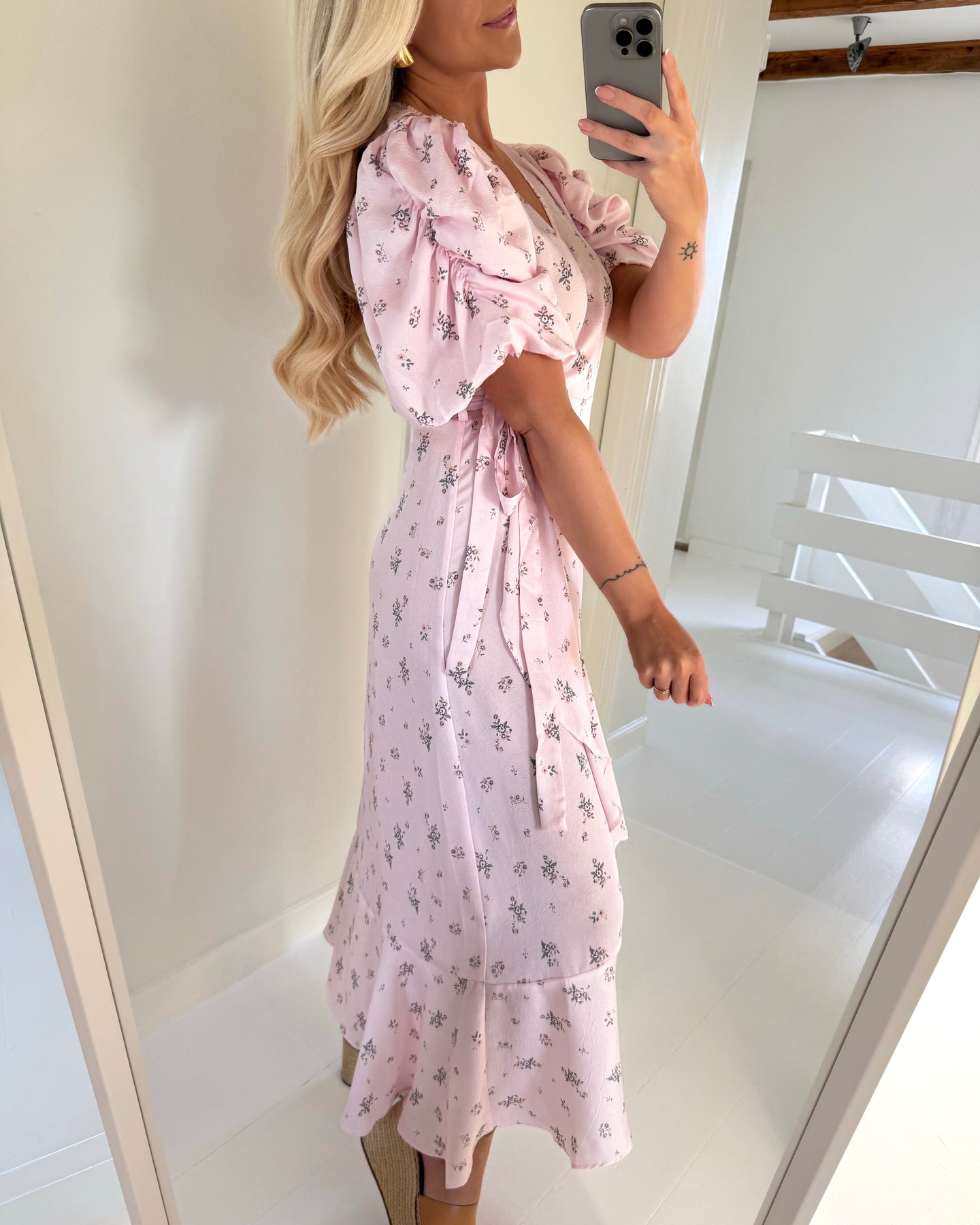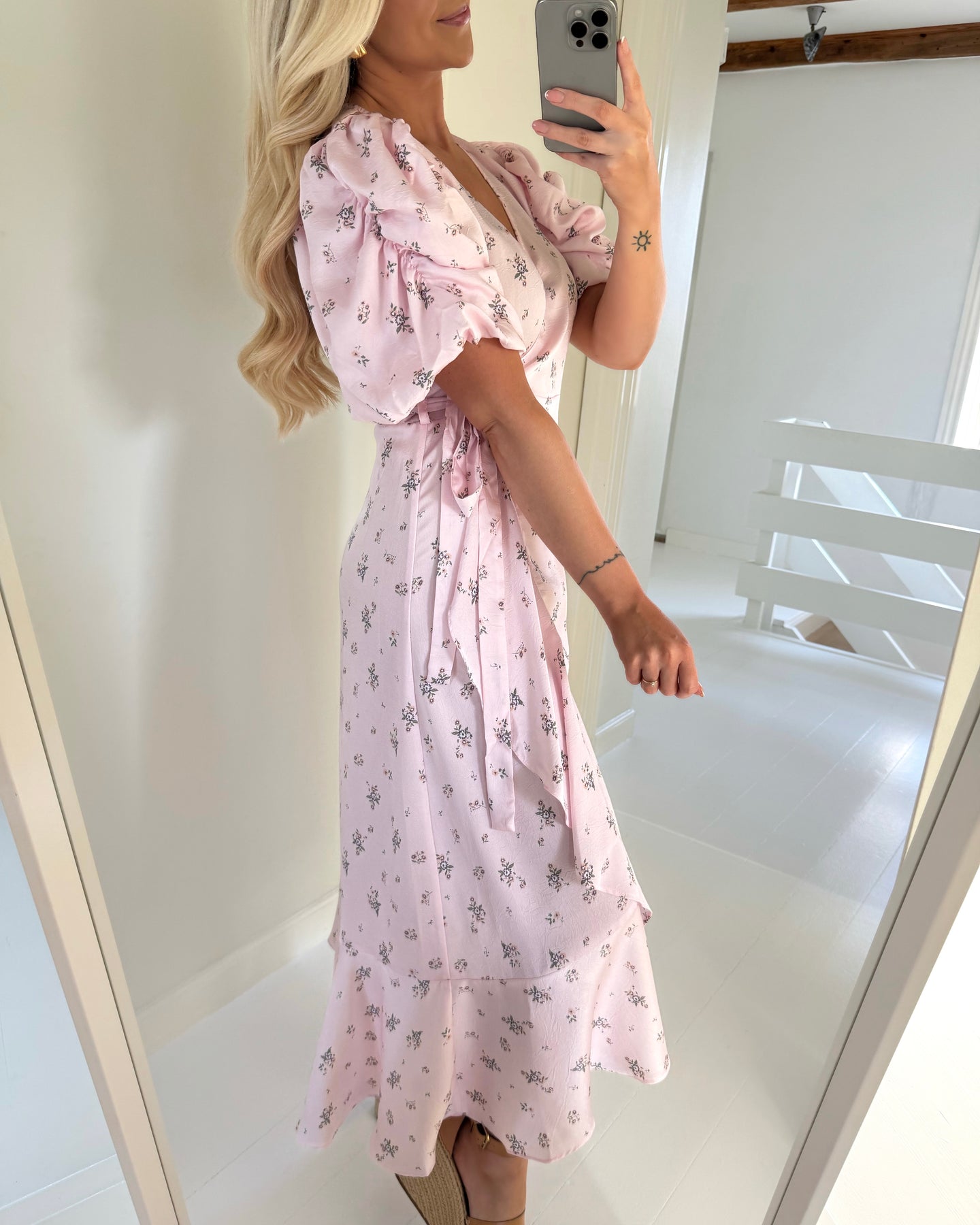 Eksklusiv lang slå-om kjole i den fineste rosa farve med blomsterprint.