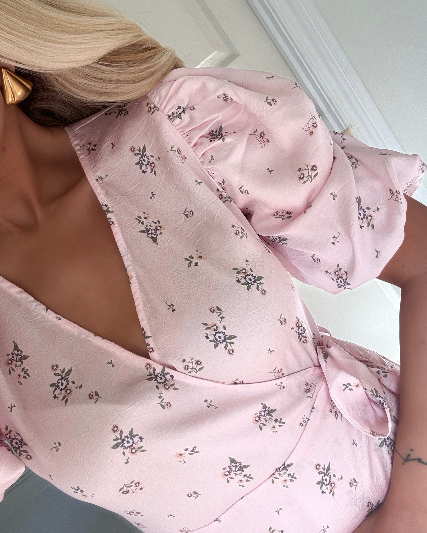 Den har v-udskæring, elegante puf-ærmer og bindebånd i taljen.