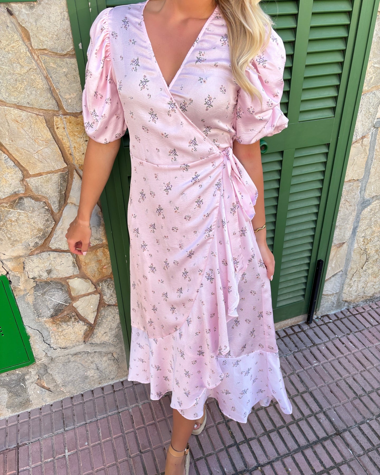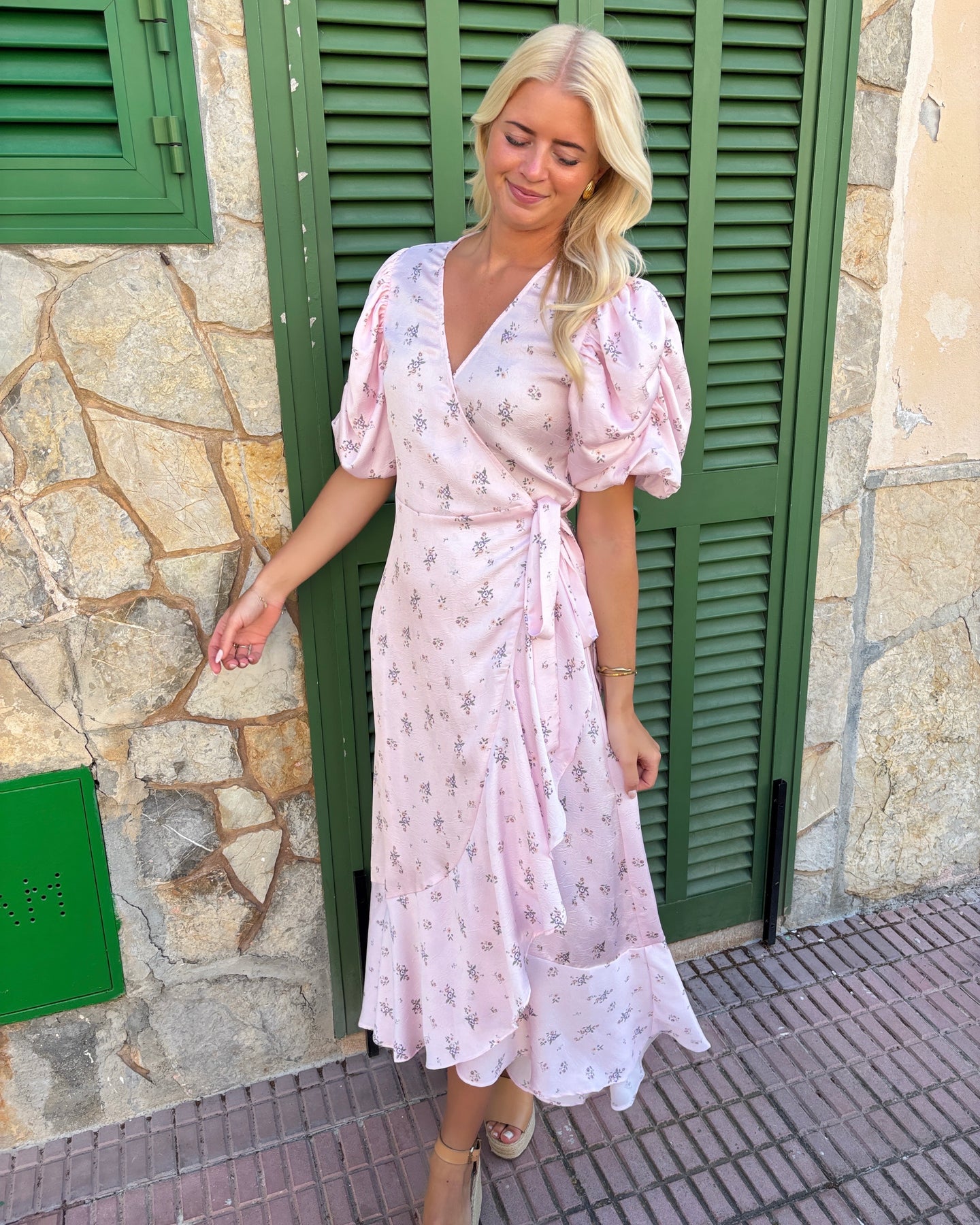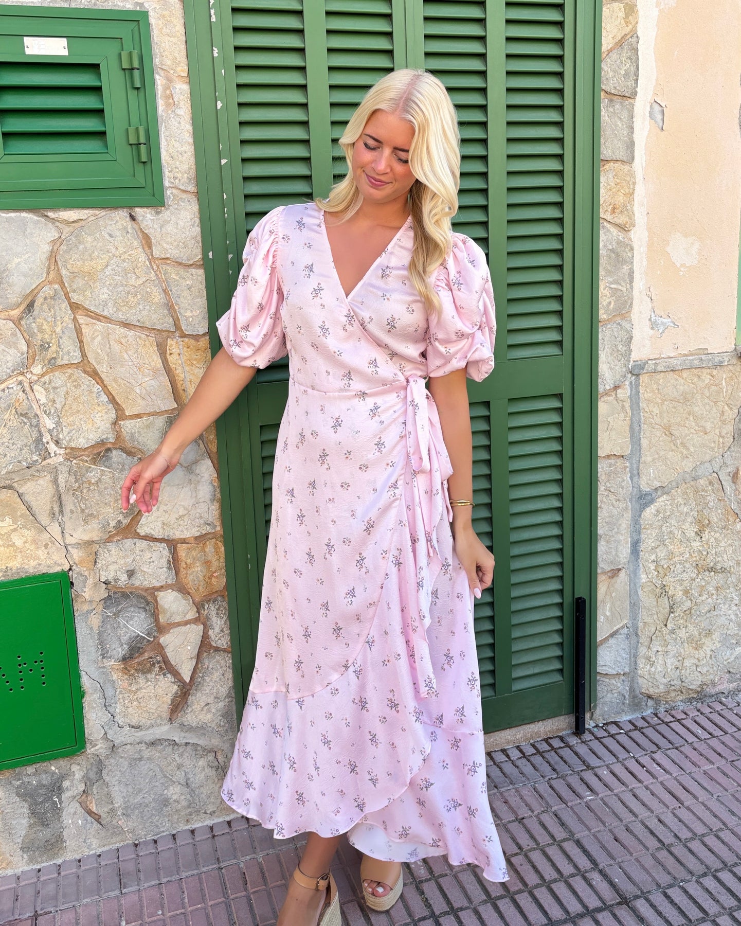Eksklusiv lang slå-om kjole i den fineste rosa farve med blomsterprint.