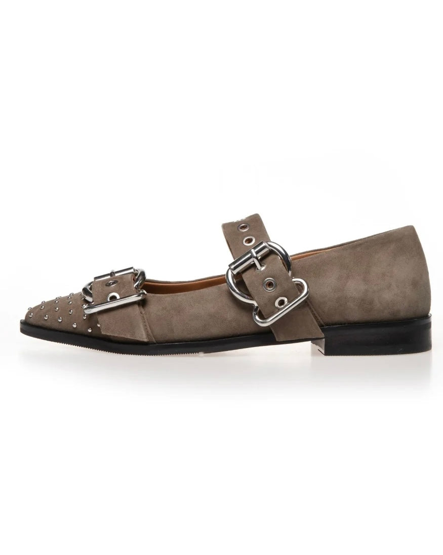 Smukke mørkegrønne ballerina sko, med nitter og remme med store spænder i sølvmetal.