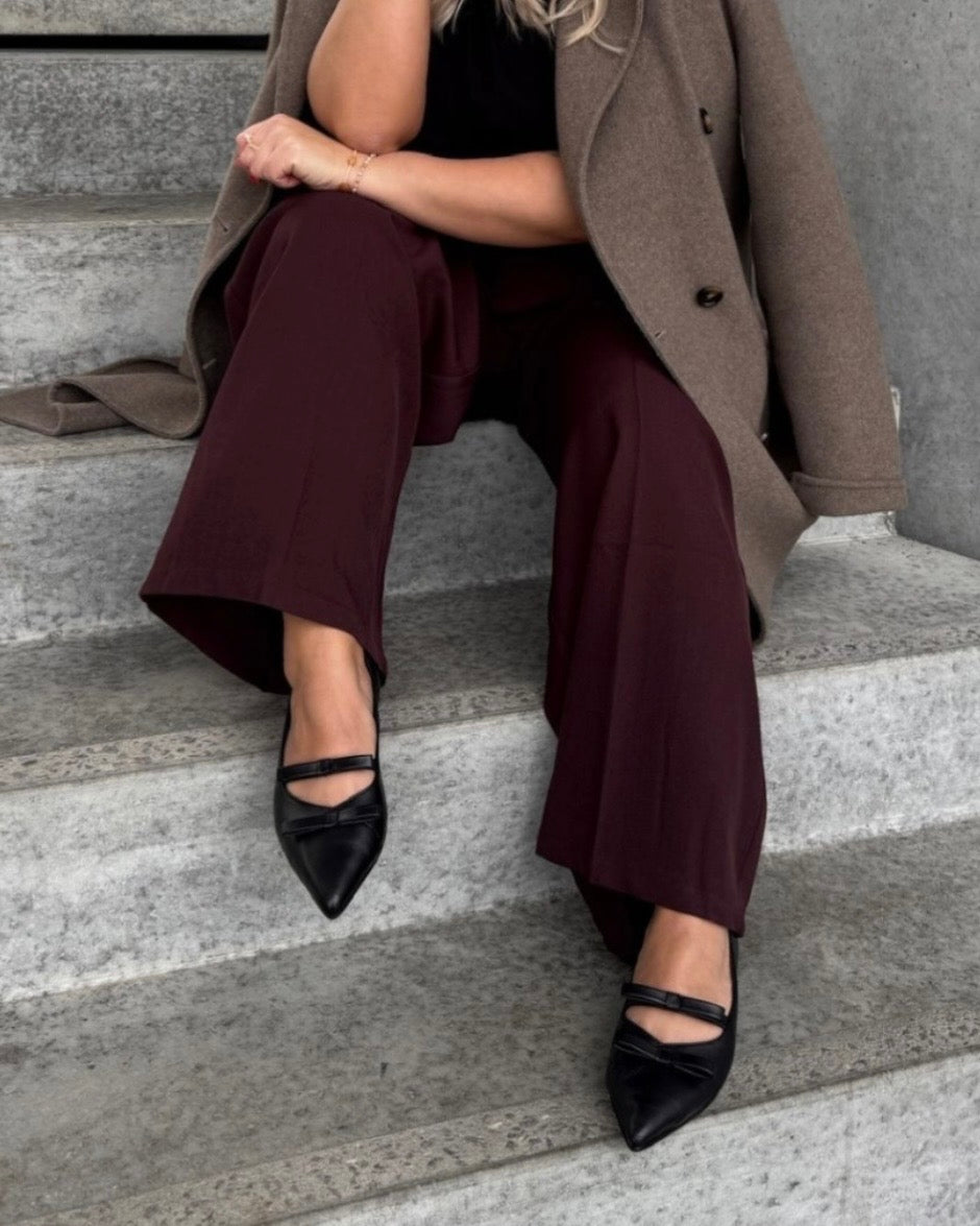 Elegant og feminin ballerina i sort læder med spids snude og to fine sløjfer over vristen.