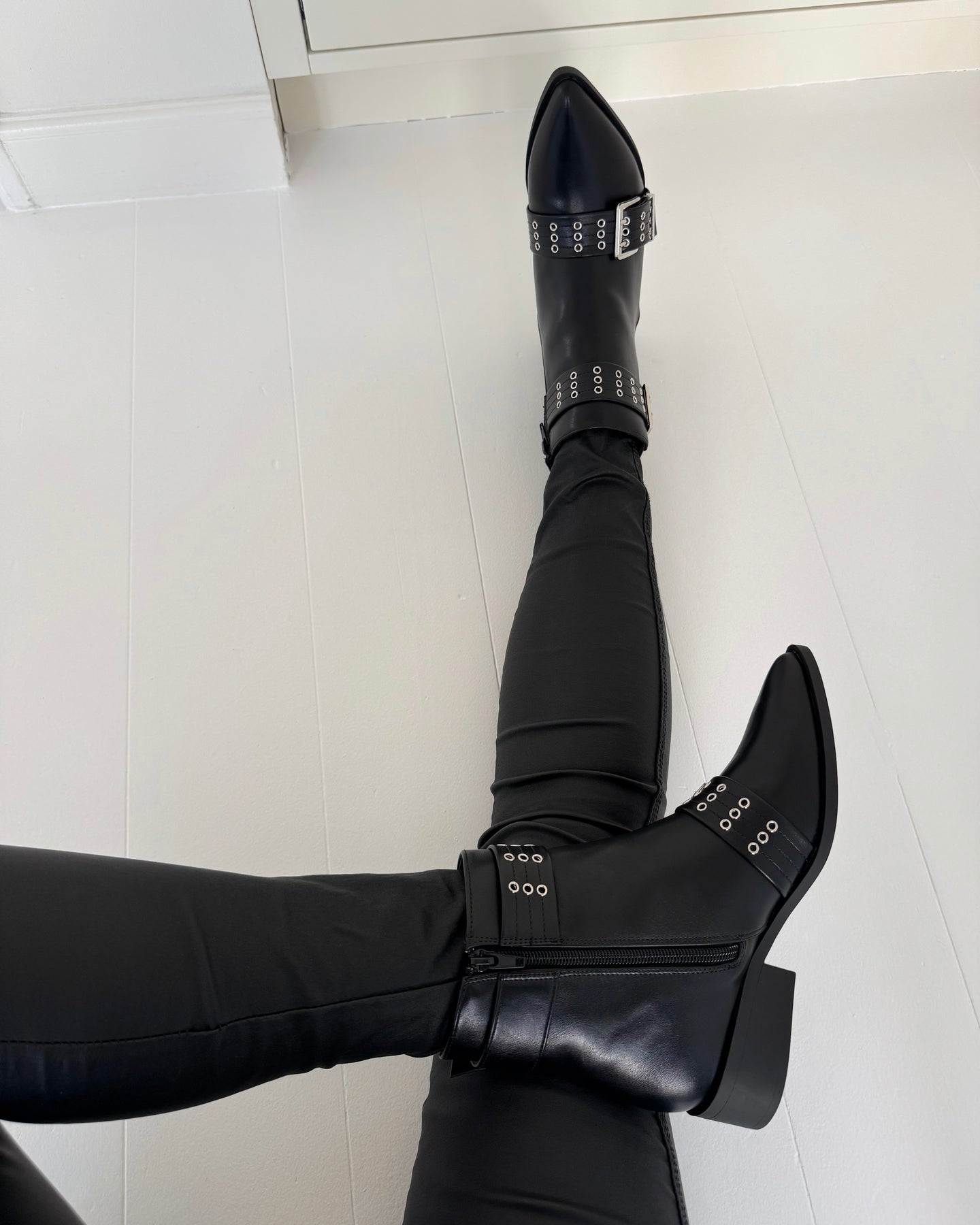De har to spænder øverst og forneden samt en lynlås på indersiden, så de er lette at få af og på.