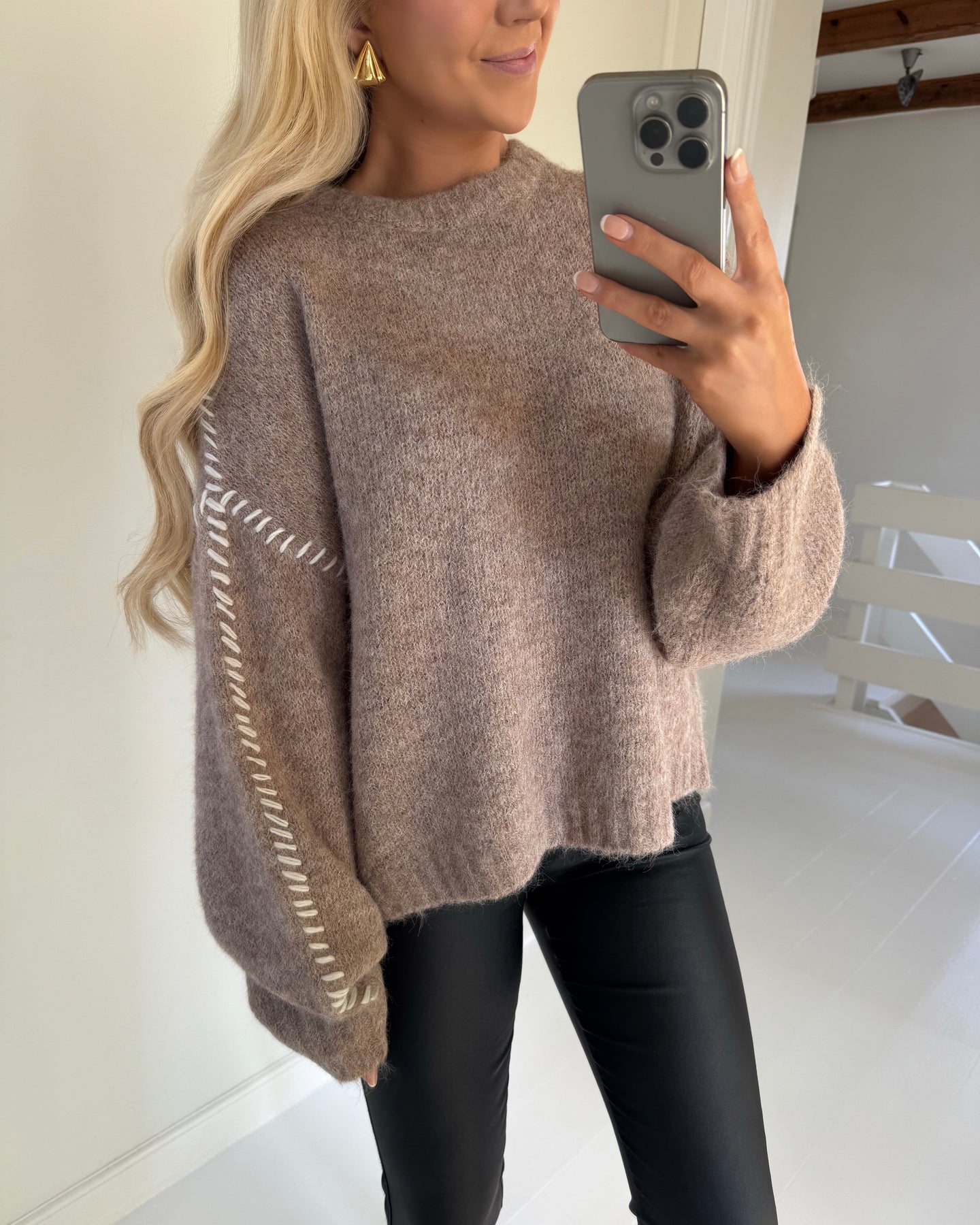 Beige striktrøje med hvide syninger ved skuldrene og langs ærmerne.