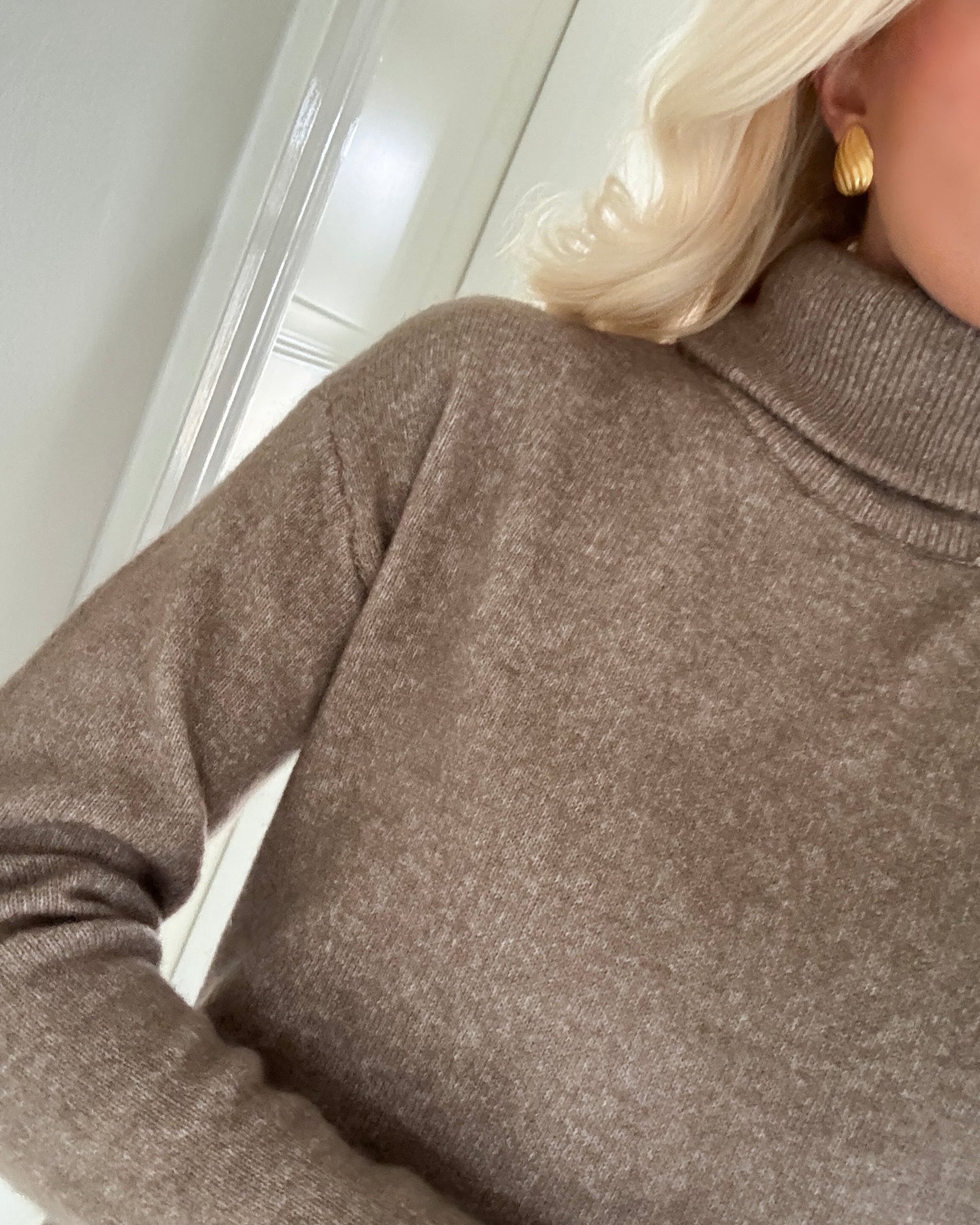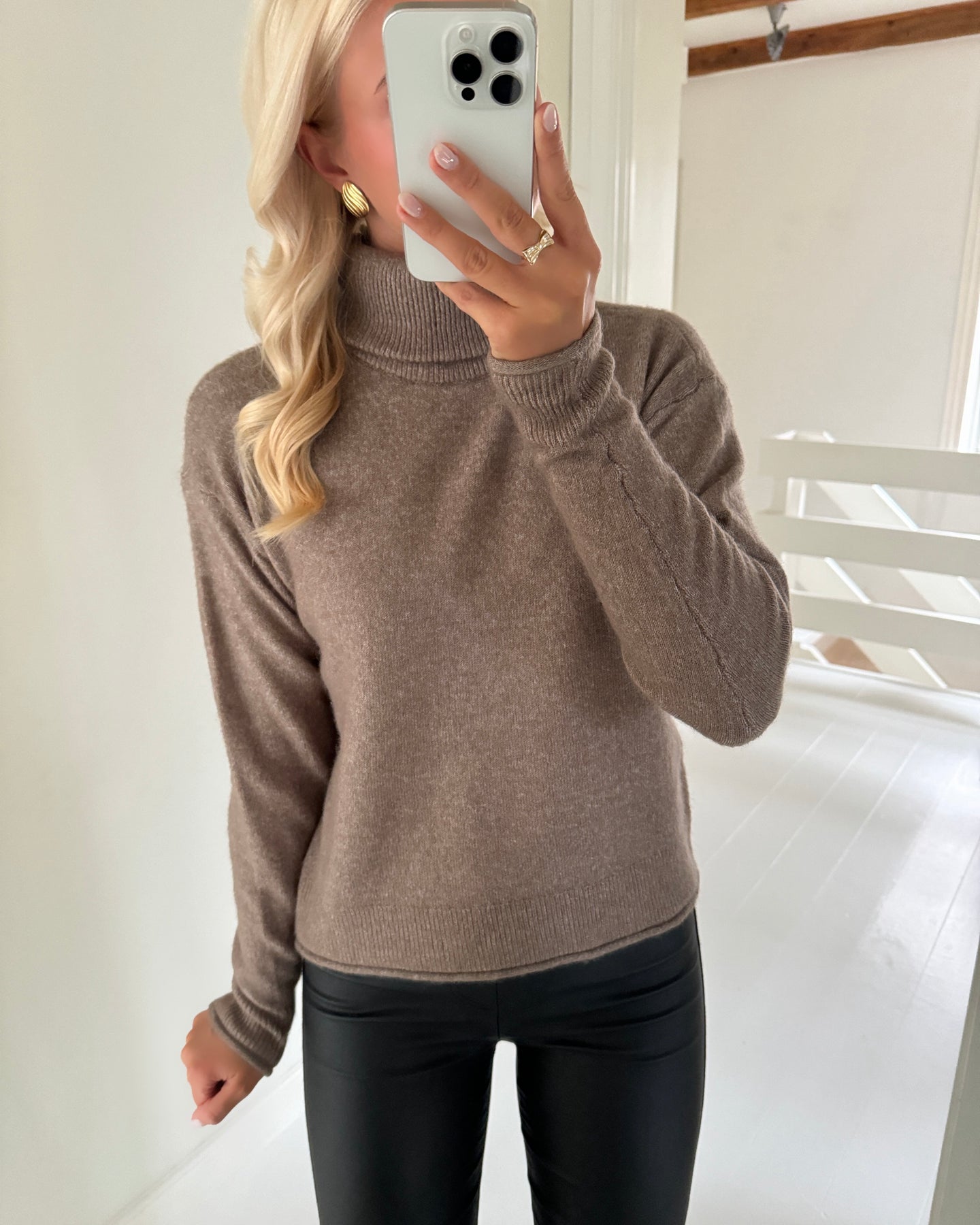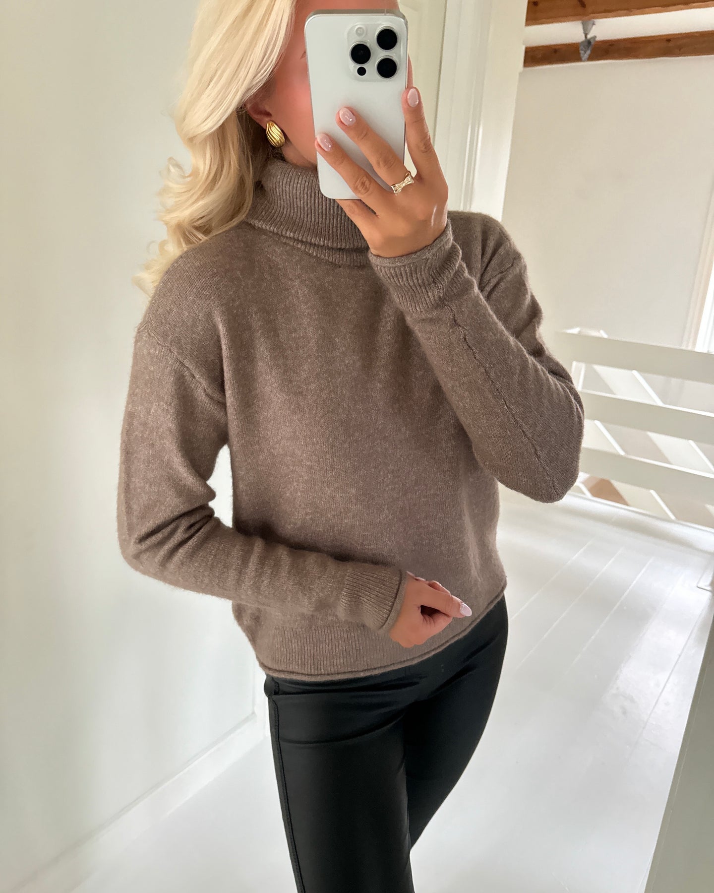 Super flot lysebrun striktrøje med rullekrave i blødt kvalitet.