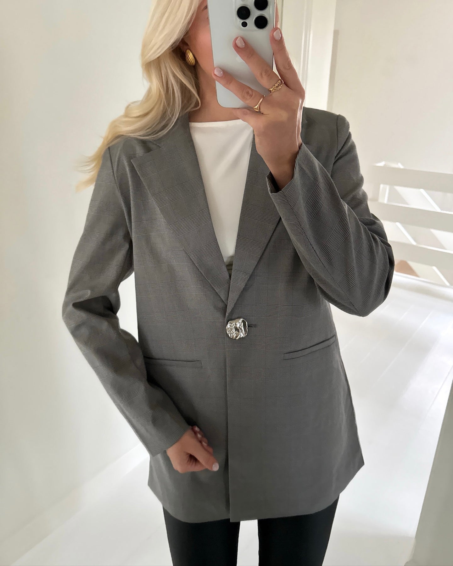 Skøn blazer i en lækker grå farve, med en eksklusiv knap og det sødeste ternede mønster.