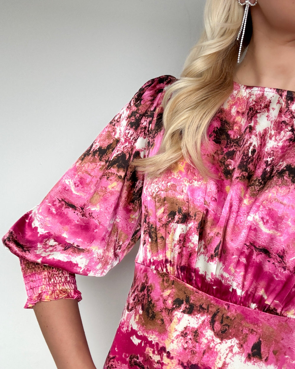 Lang og løs multifarvet kjole med det fineste marble print i pink nuancer. Kjolen har høj hals samt løse 3/4 ærmer med en smuk lang smockkant.