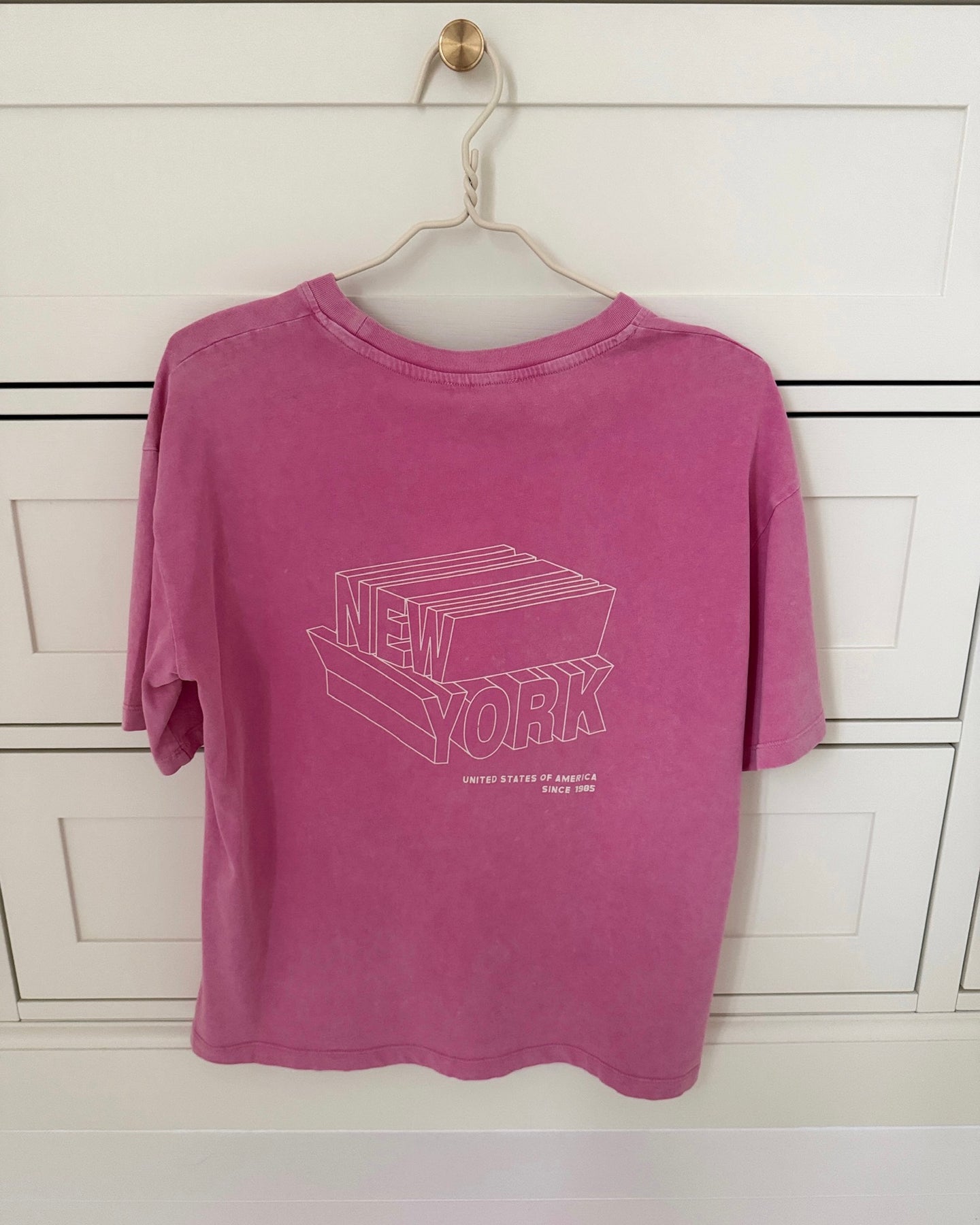 T-shirten har korte ærmer, en rund hals og print på ryggen.