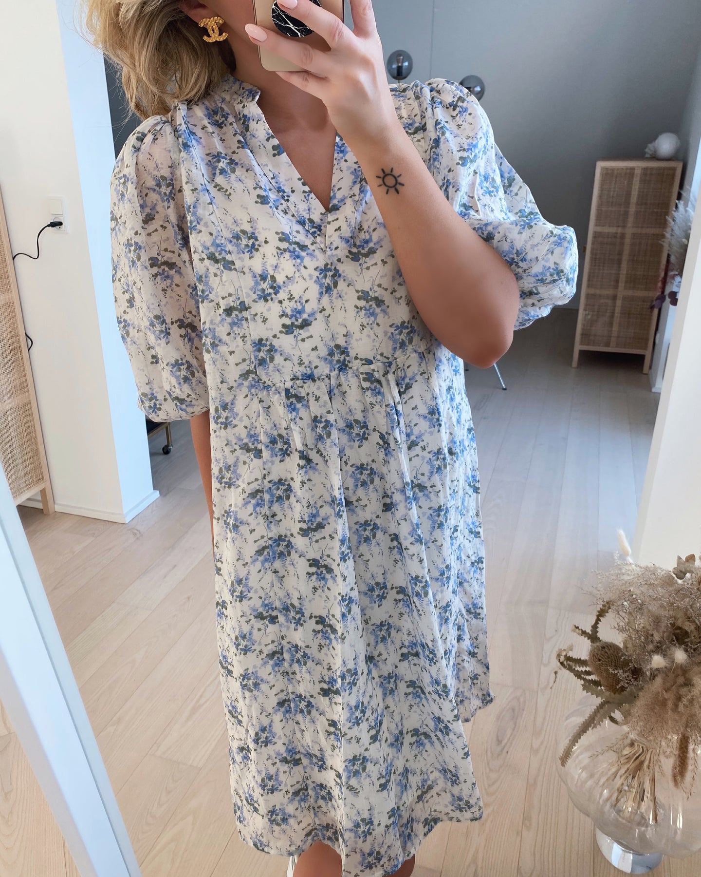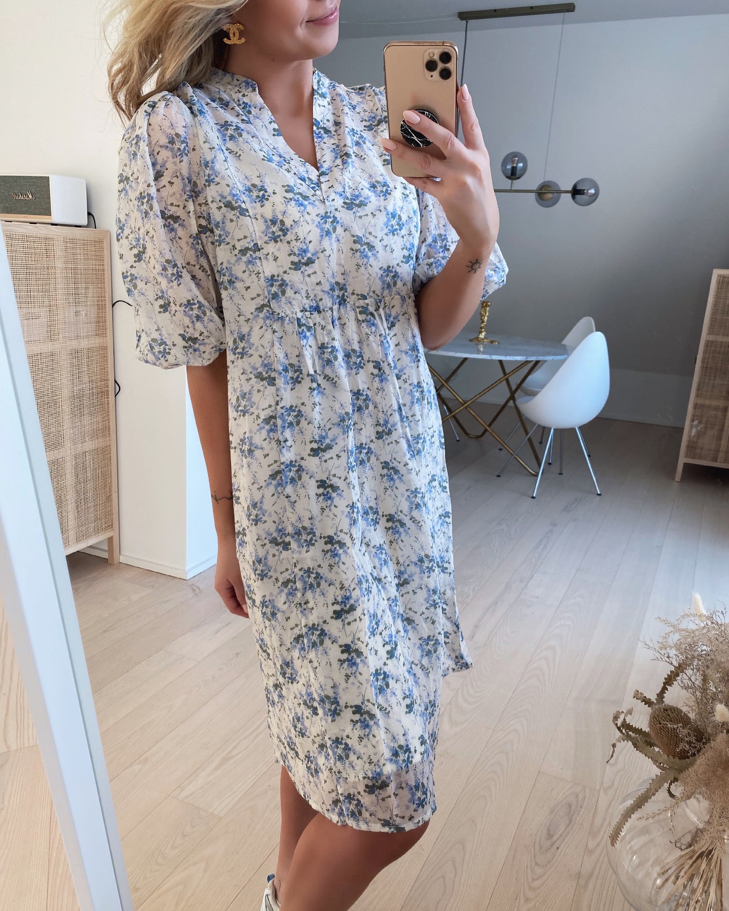 Midikjole i et eksklusivt print med blomsterprint, og i den lækreste kvalitet! Kjolen er designet med v-hals, peplum og lange ærmer.