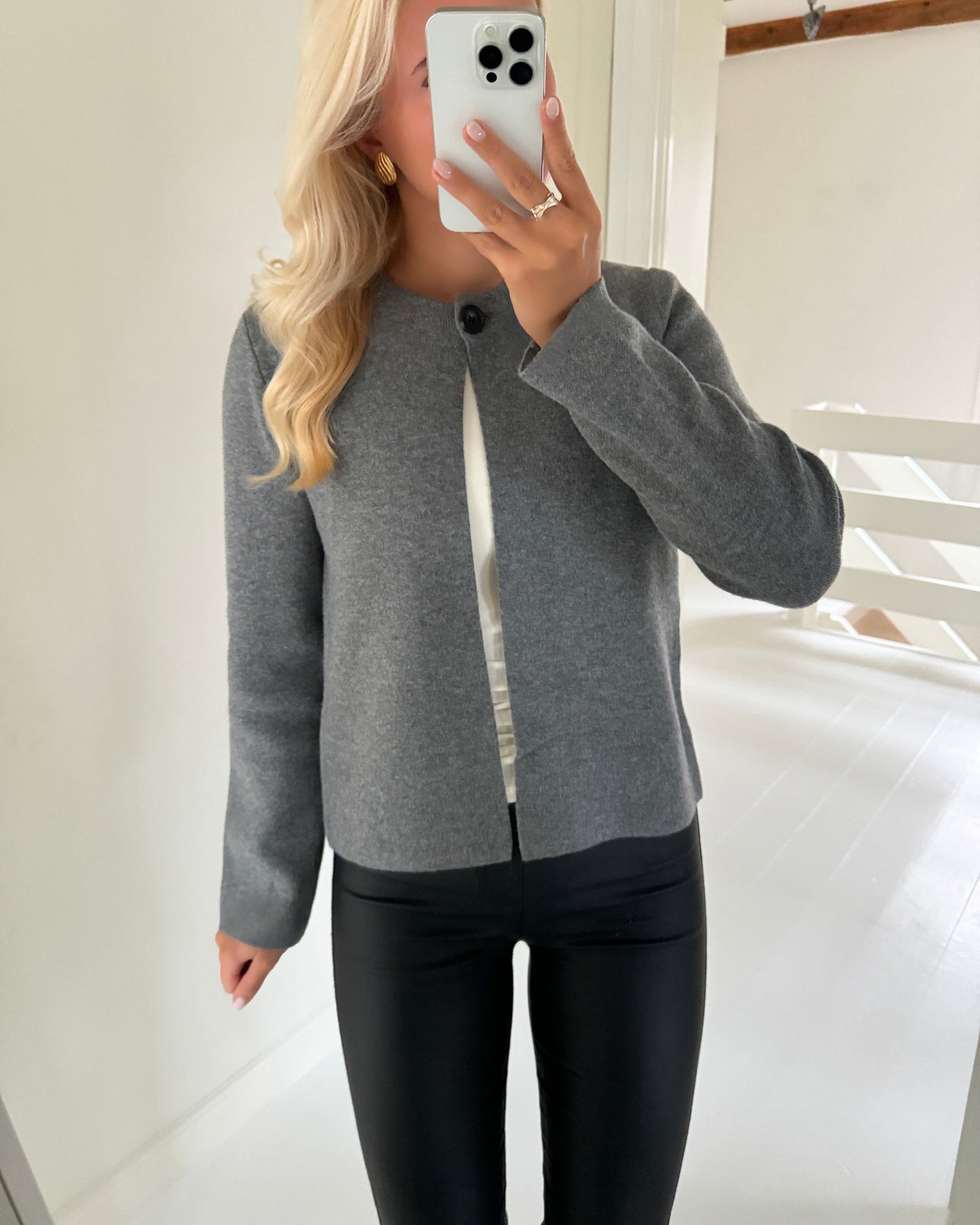 Den har en rund hals, lange ærmer og en knap i kraven til at lukke.