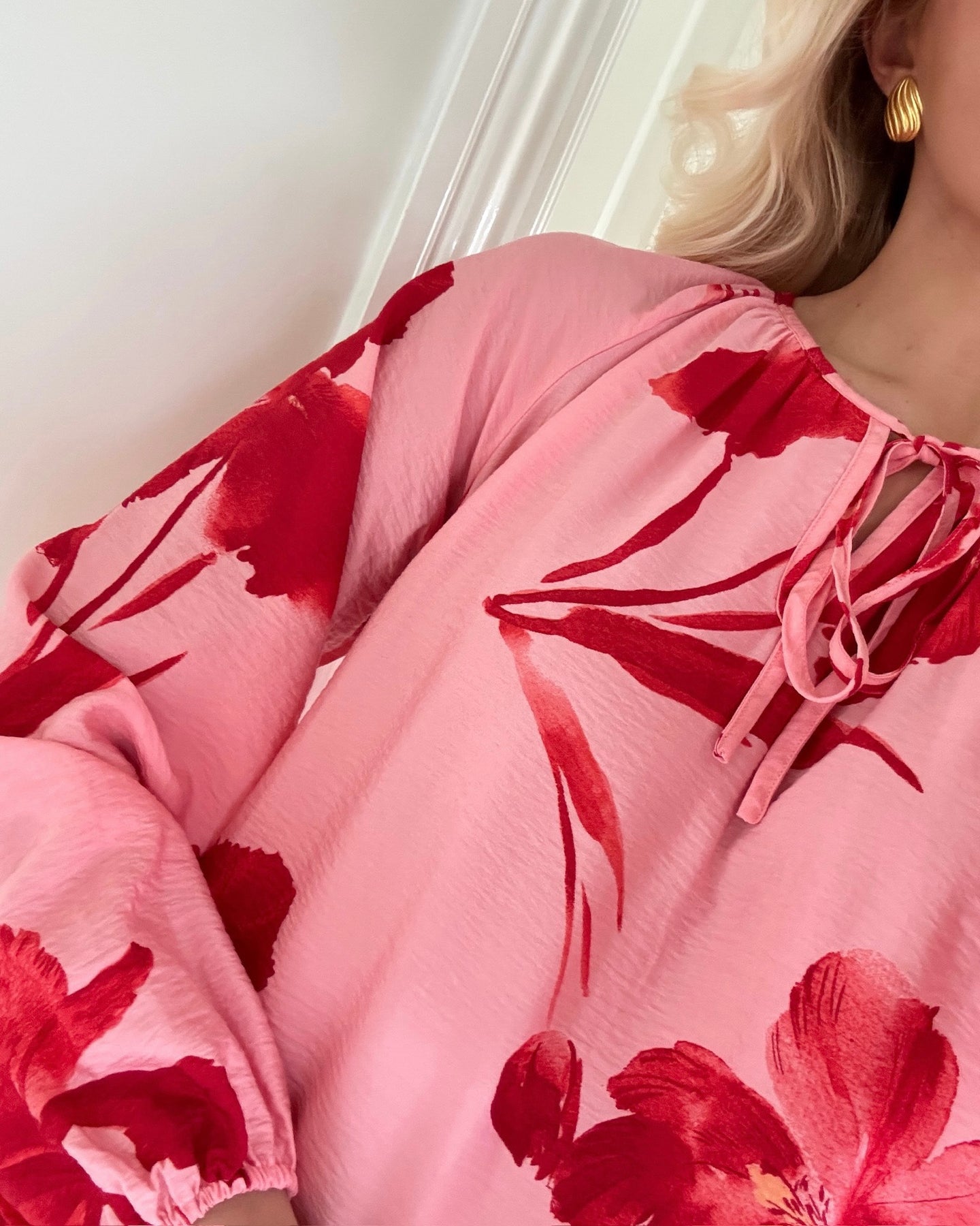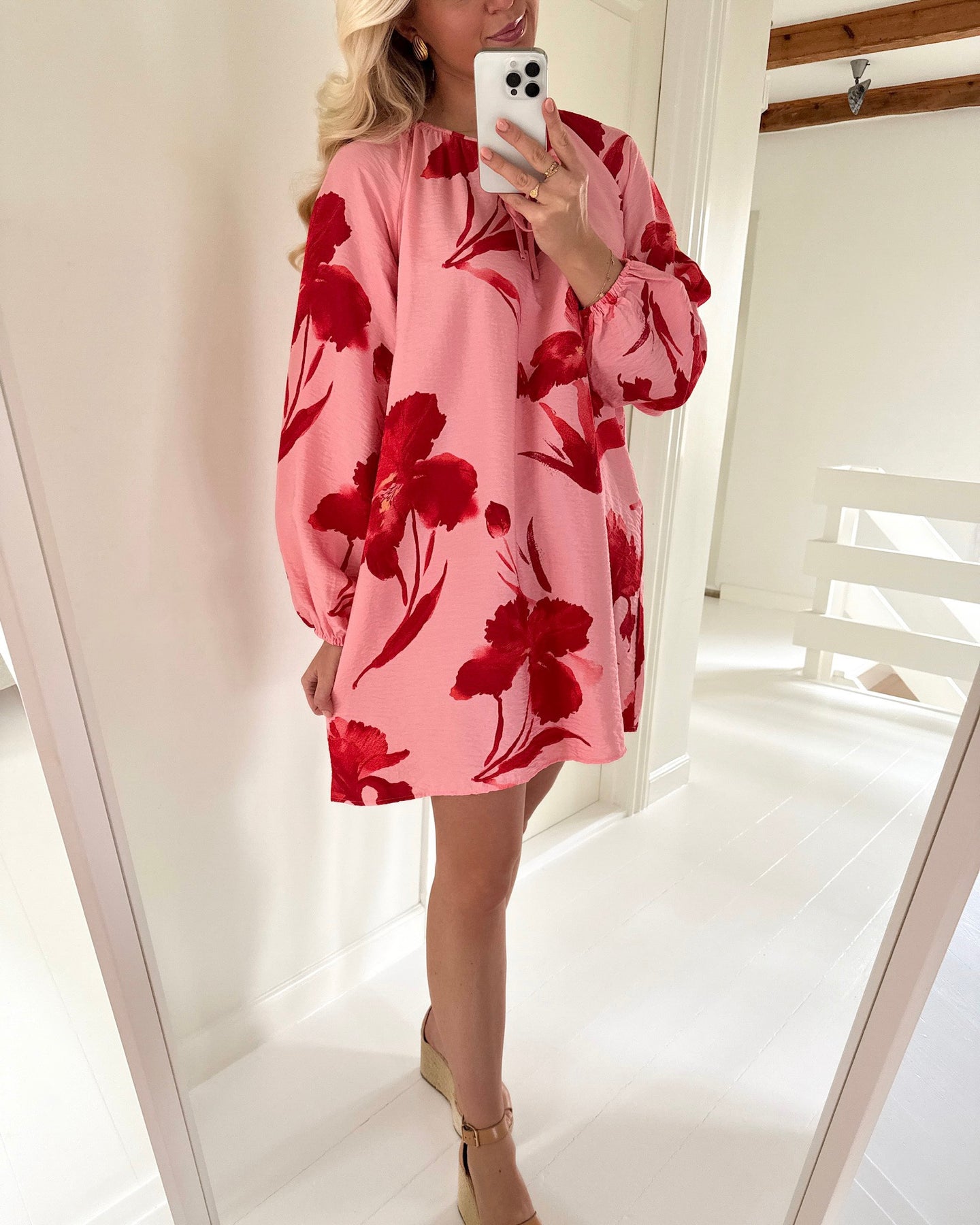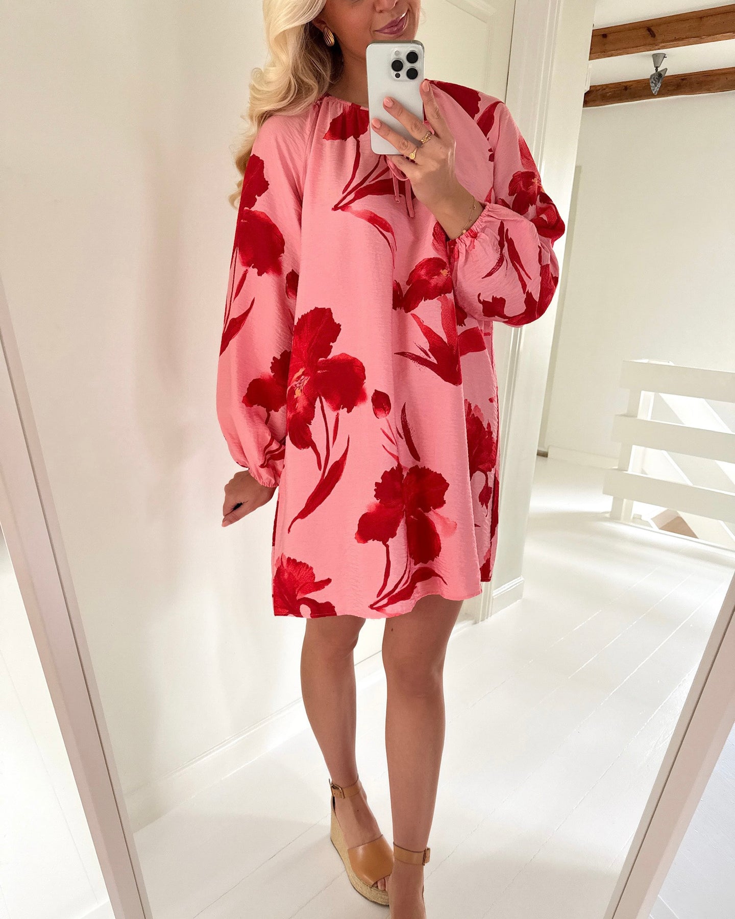 Skøn kjole i den flotteste lyserøde farve med det fineste røde blomstermønster.