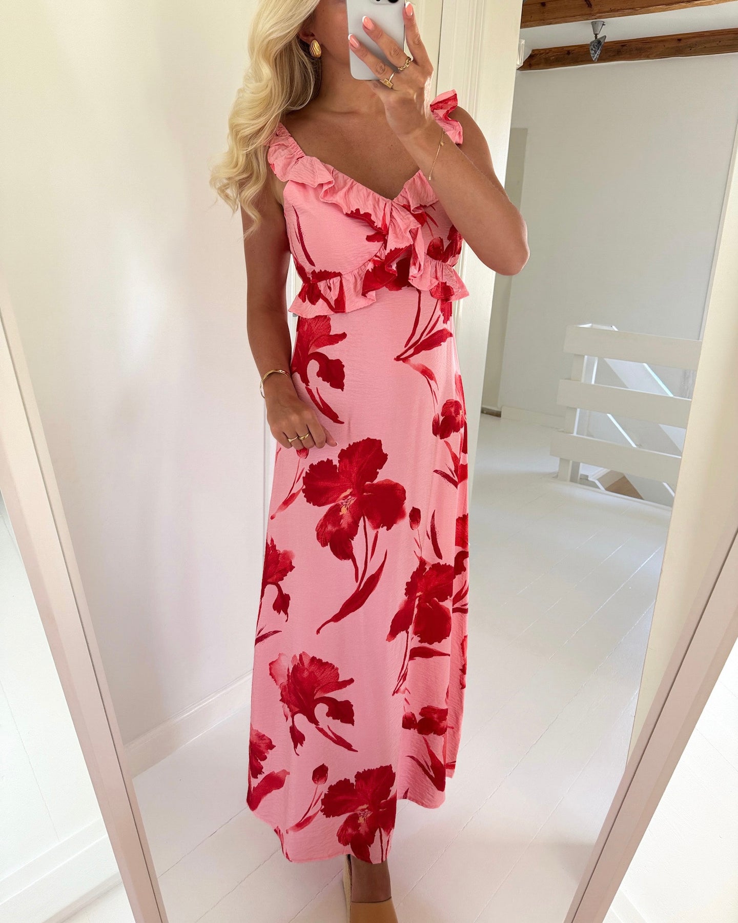 Smuk kjole i en skøn lyserød farve med sødt blomsterprint.