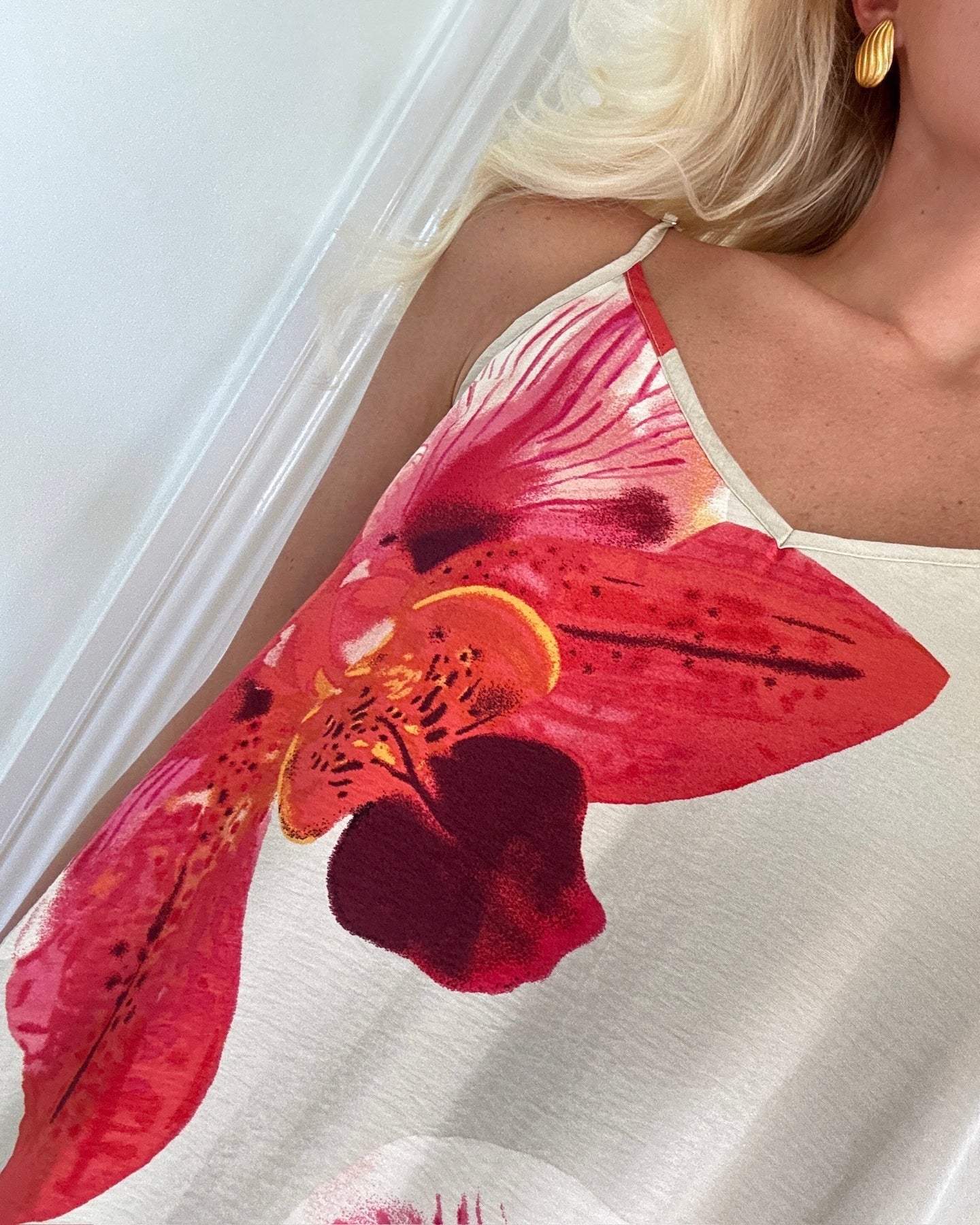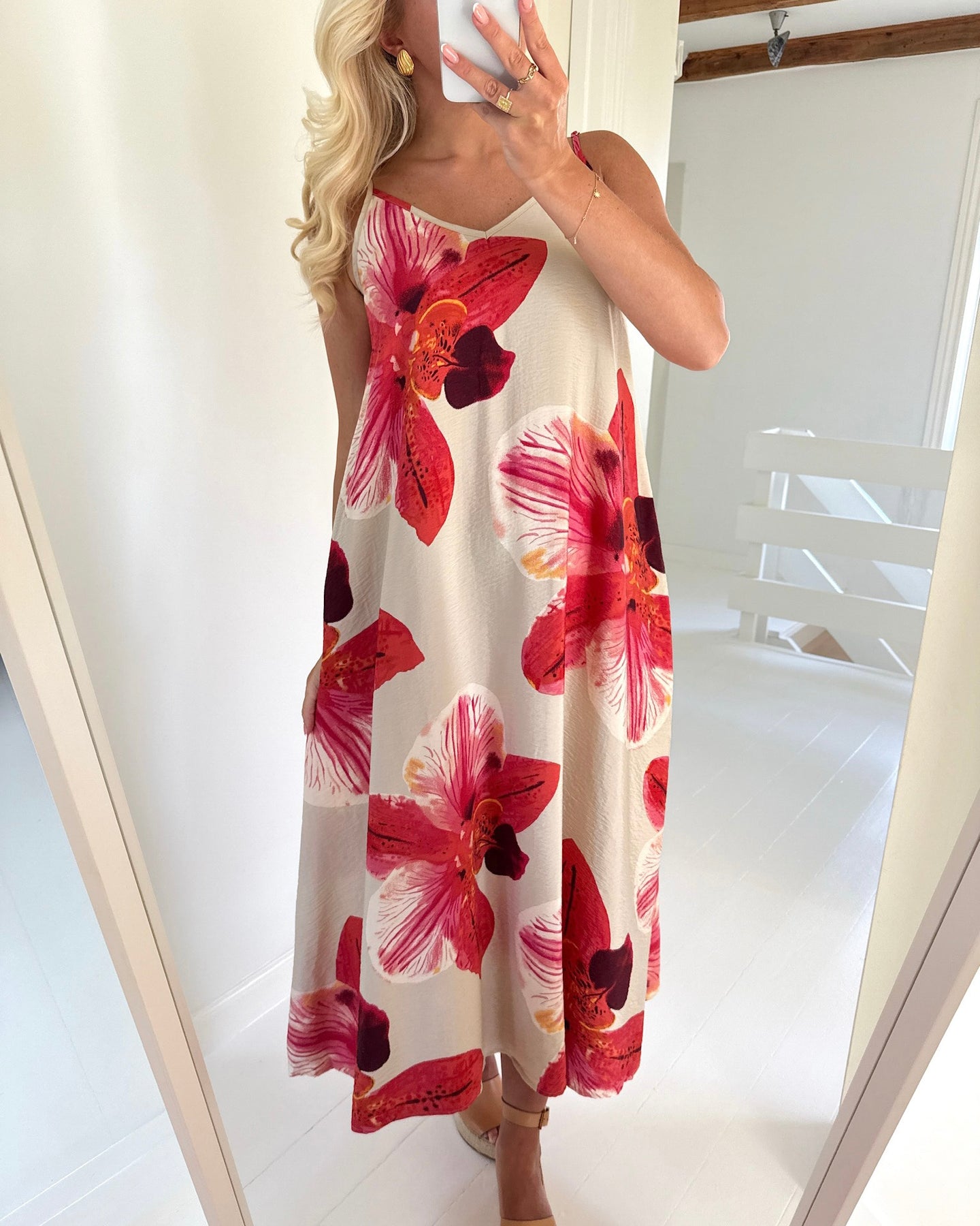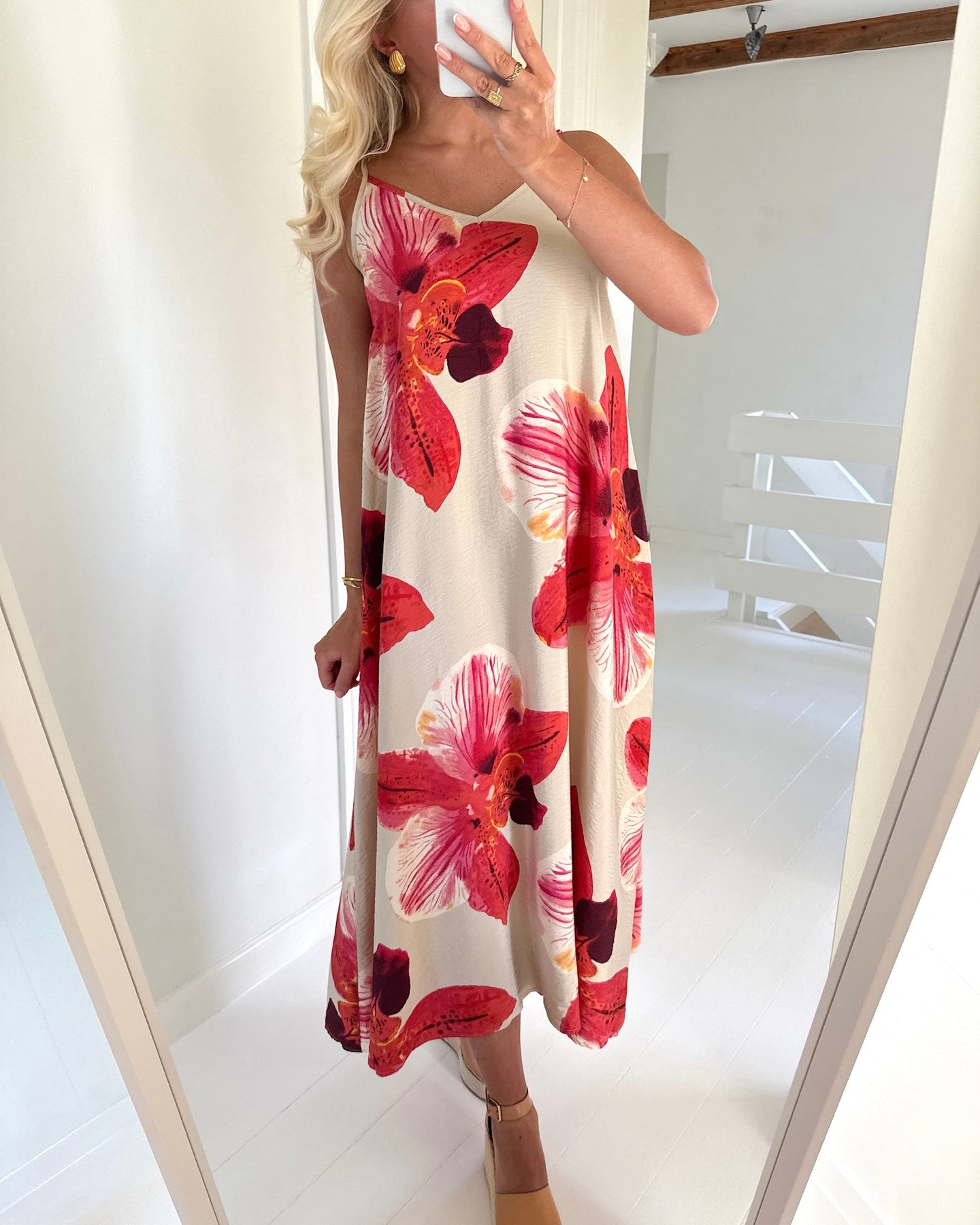 Smuk kjole i en fin beige farve med et eksklusivt orkidéprint.