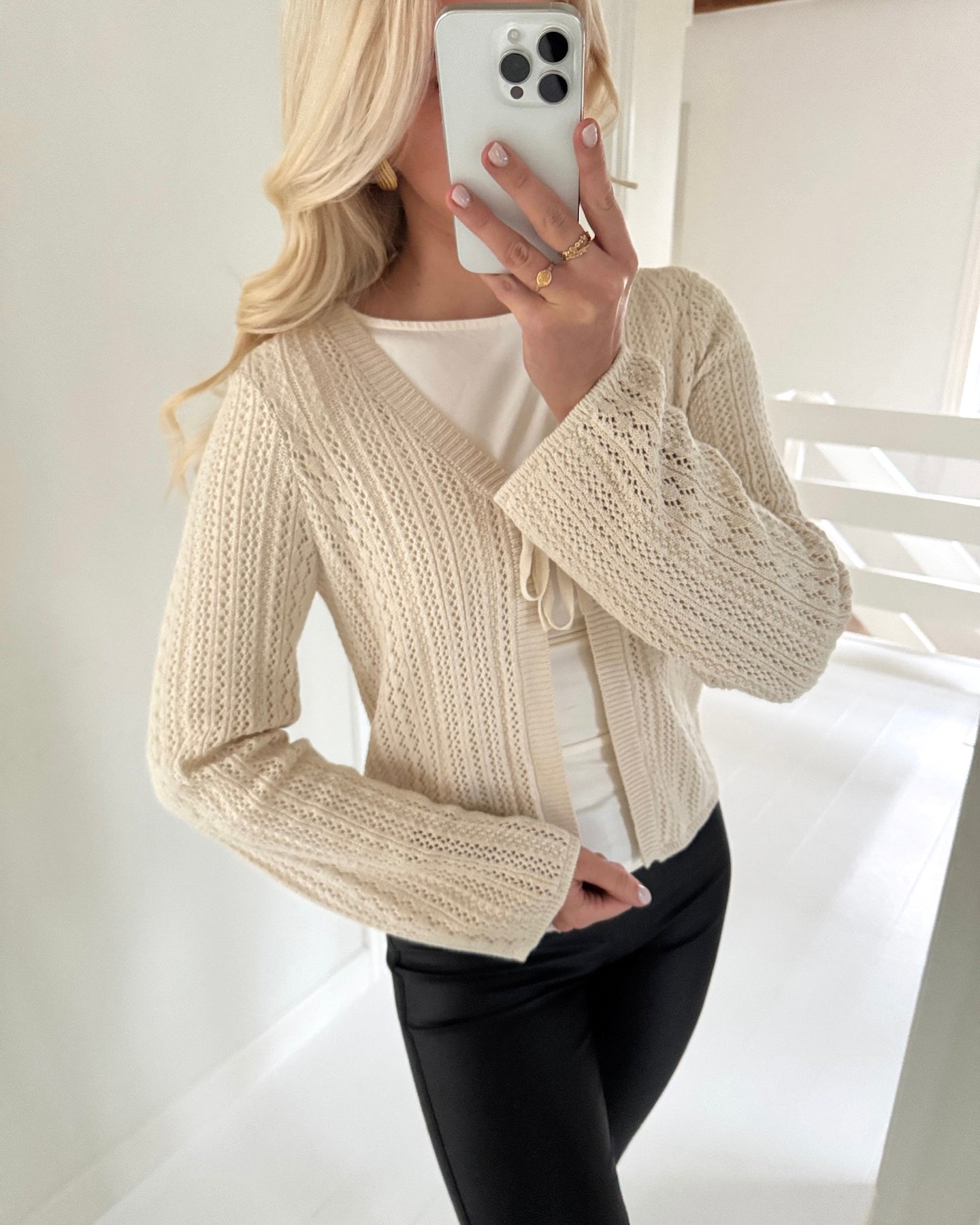 Cardigan har en fin v-udskæring med en snor foran til lukning.