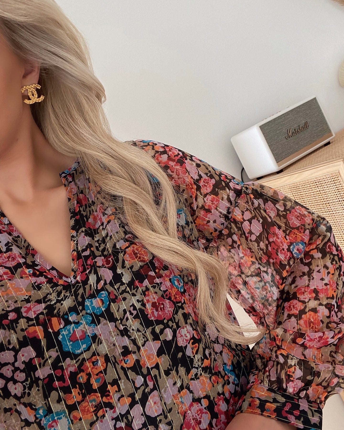Utrolig smuk kjole i det flotteste multifarvet print med blomster og glimmer detaljer.