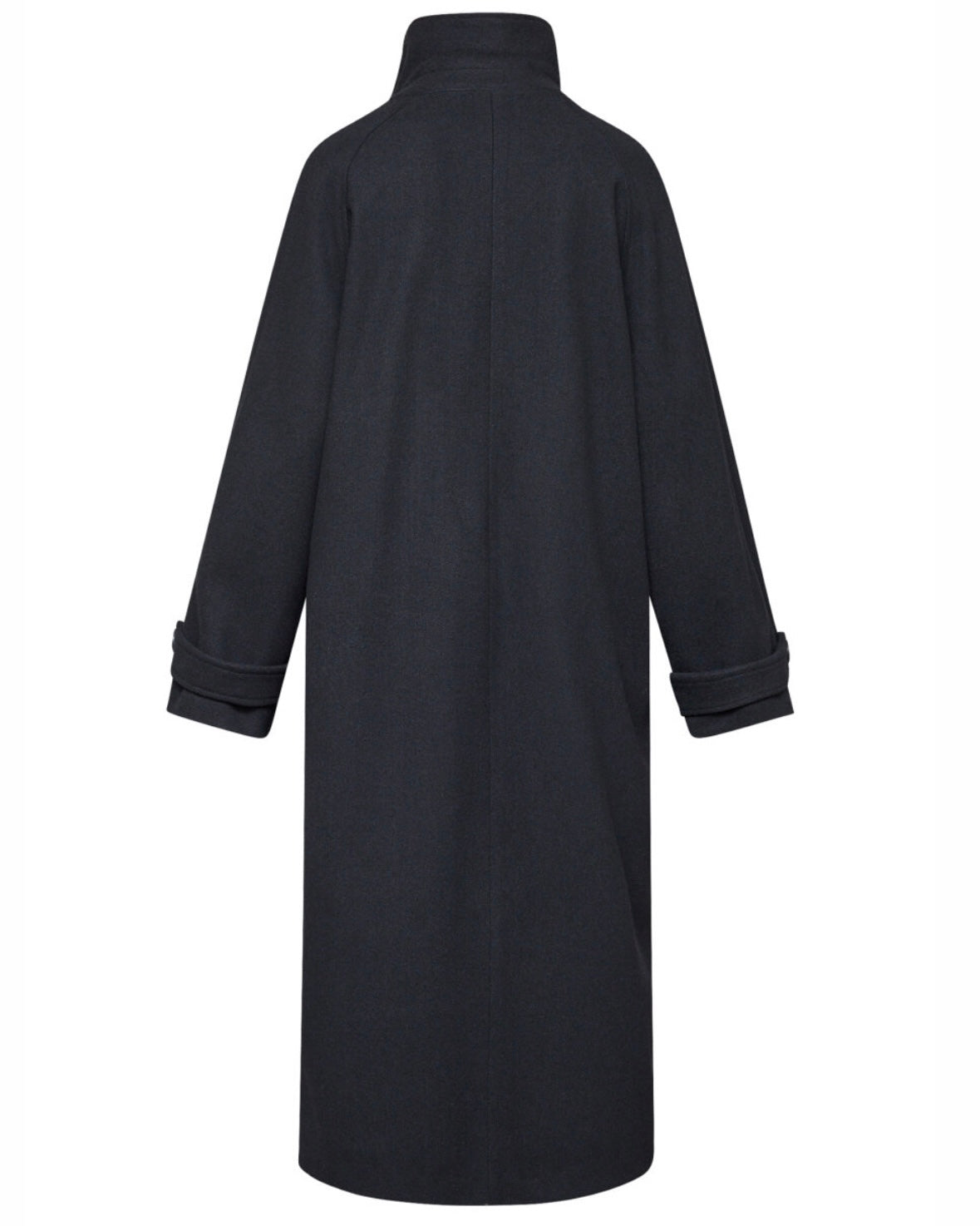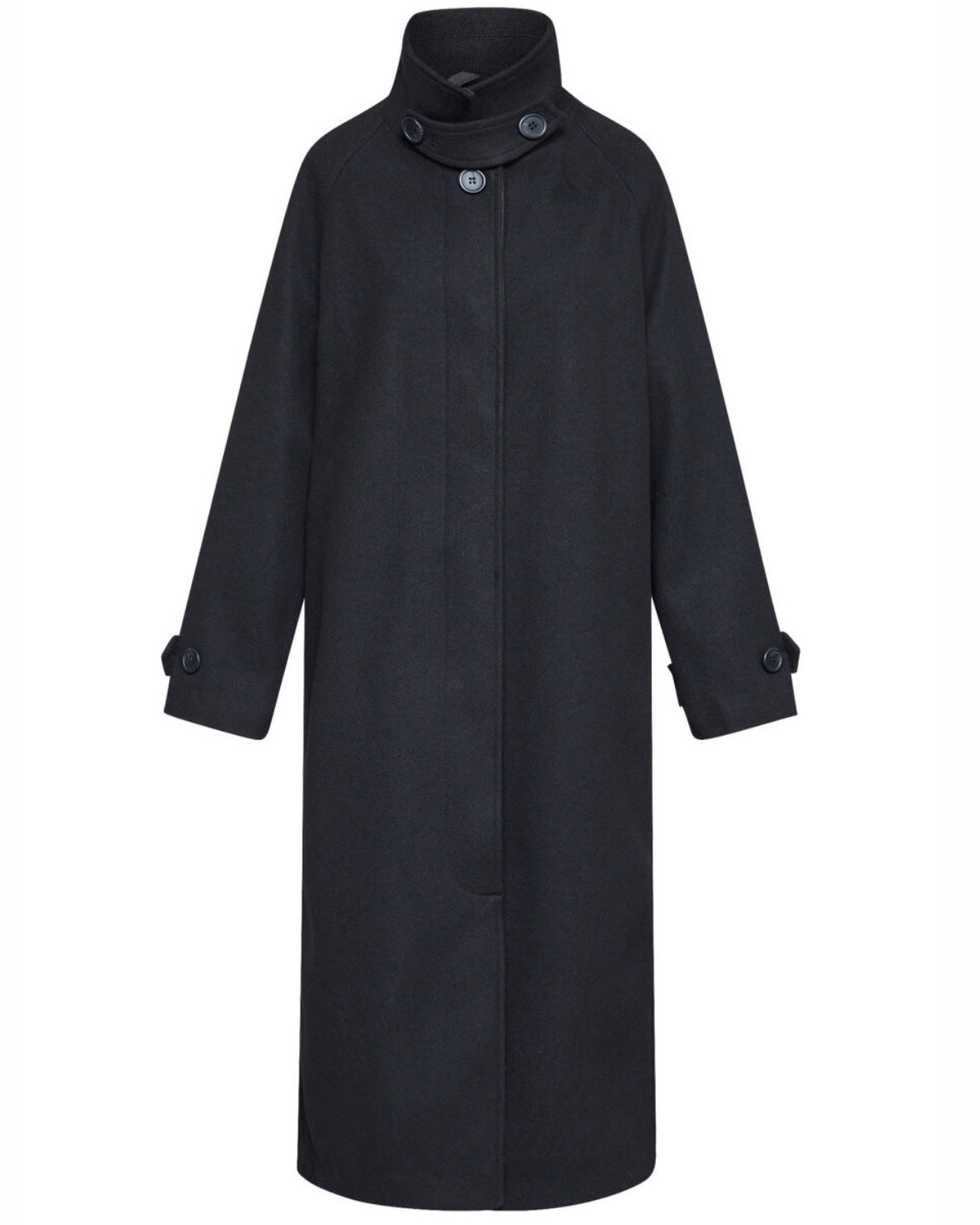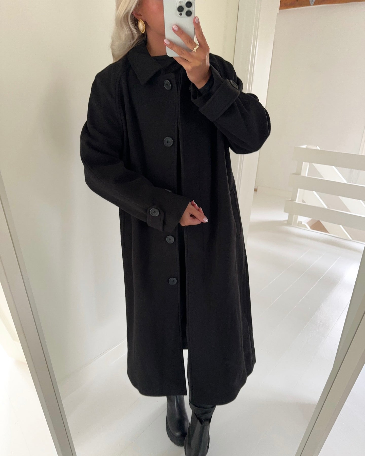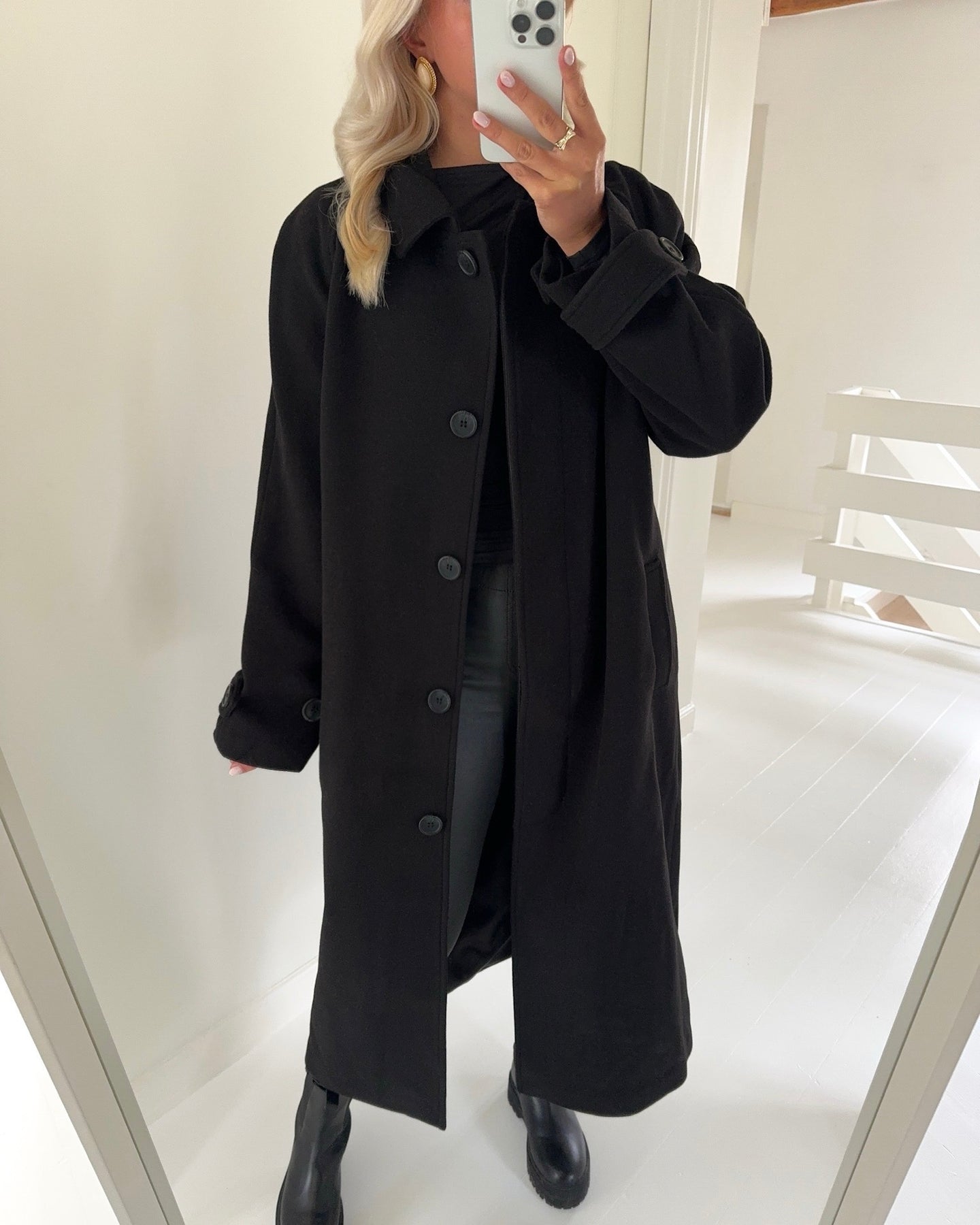 Fineste lange frakke i klassisk sort med feminine detaljer.