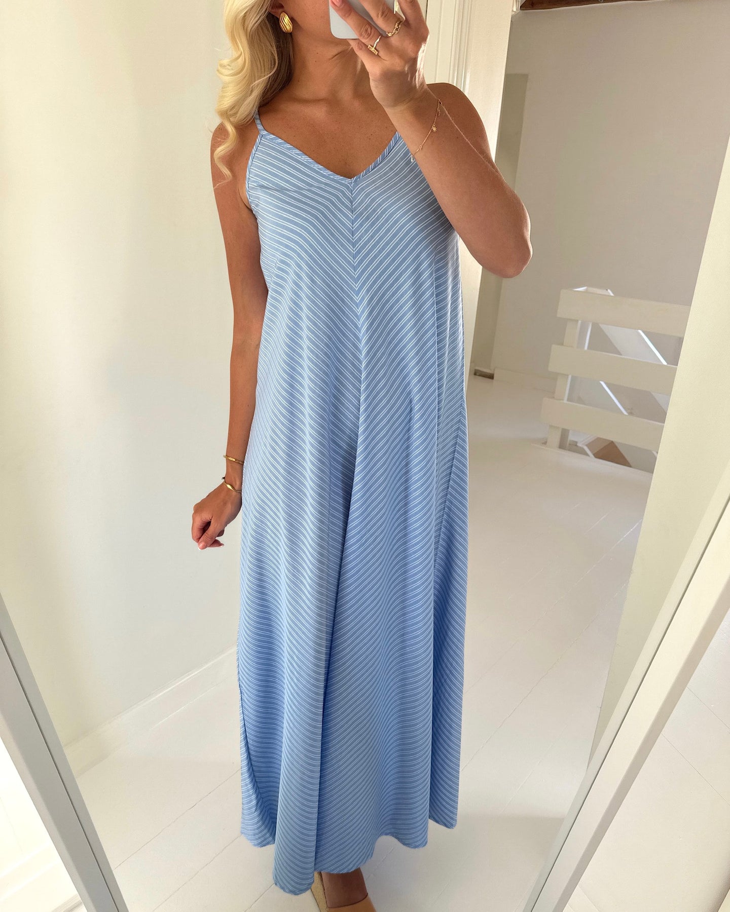 Kjole i smuk blå farve med et hvidt stribet mønster.