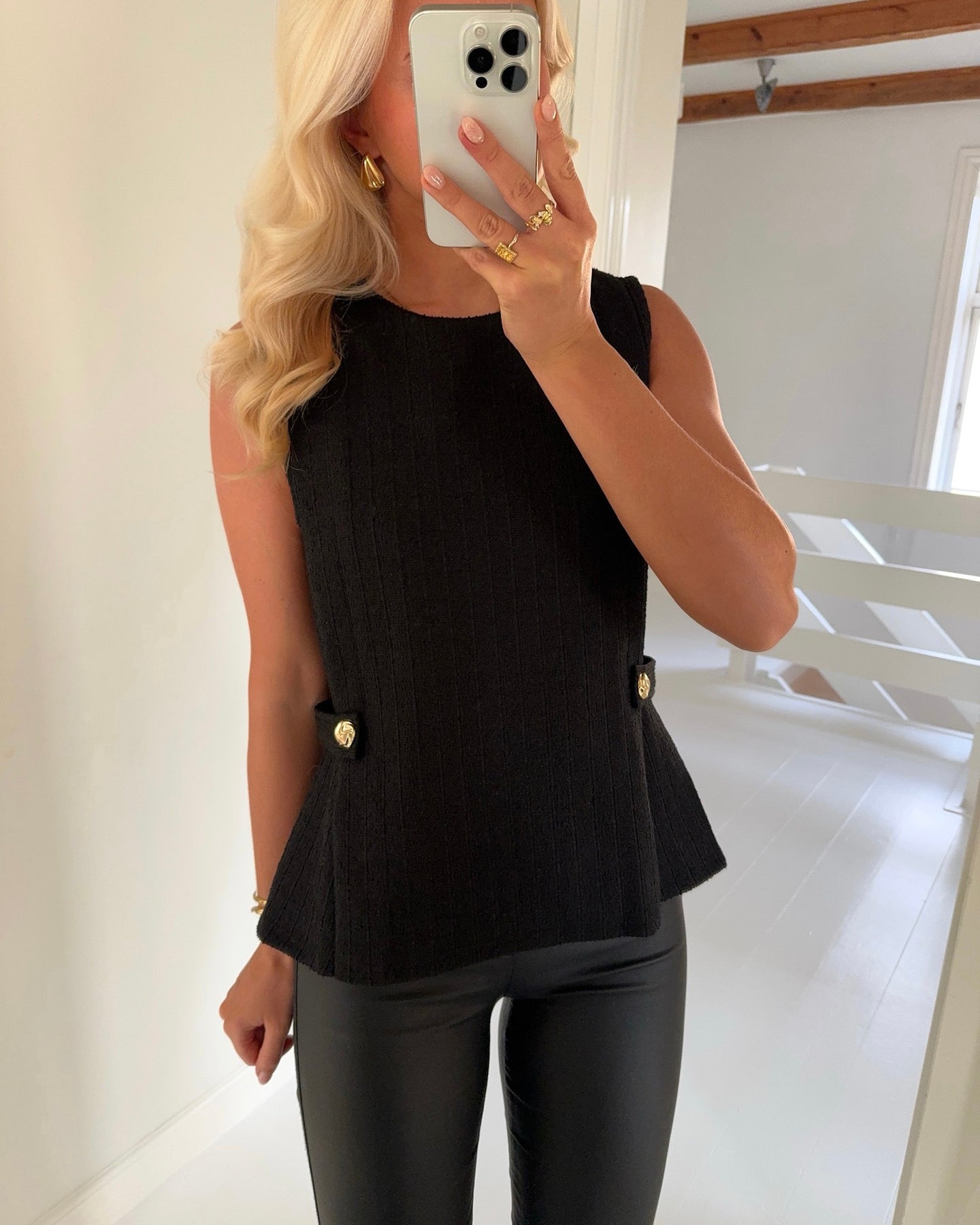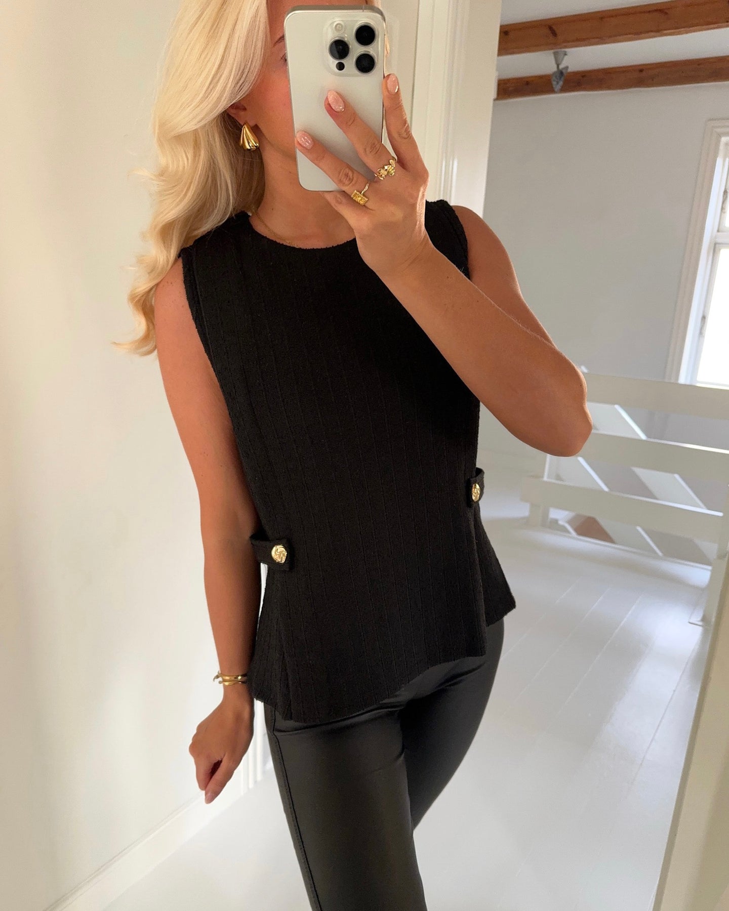 Skøn top i en klassisk sort farve med fine knappe-detaljer i siderne.