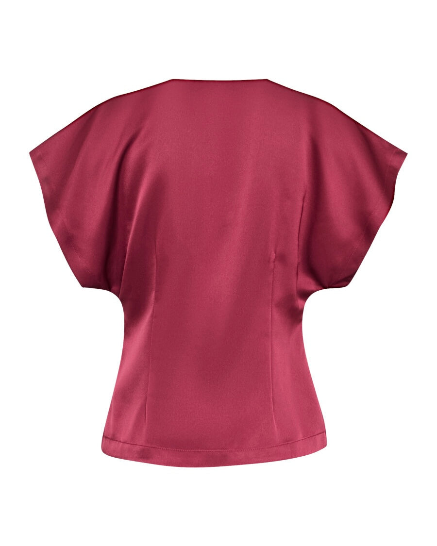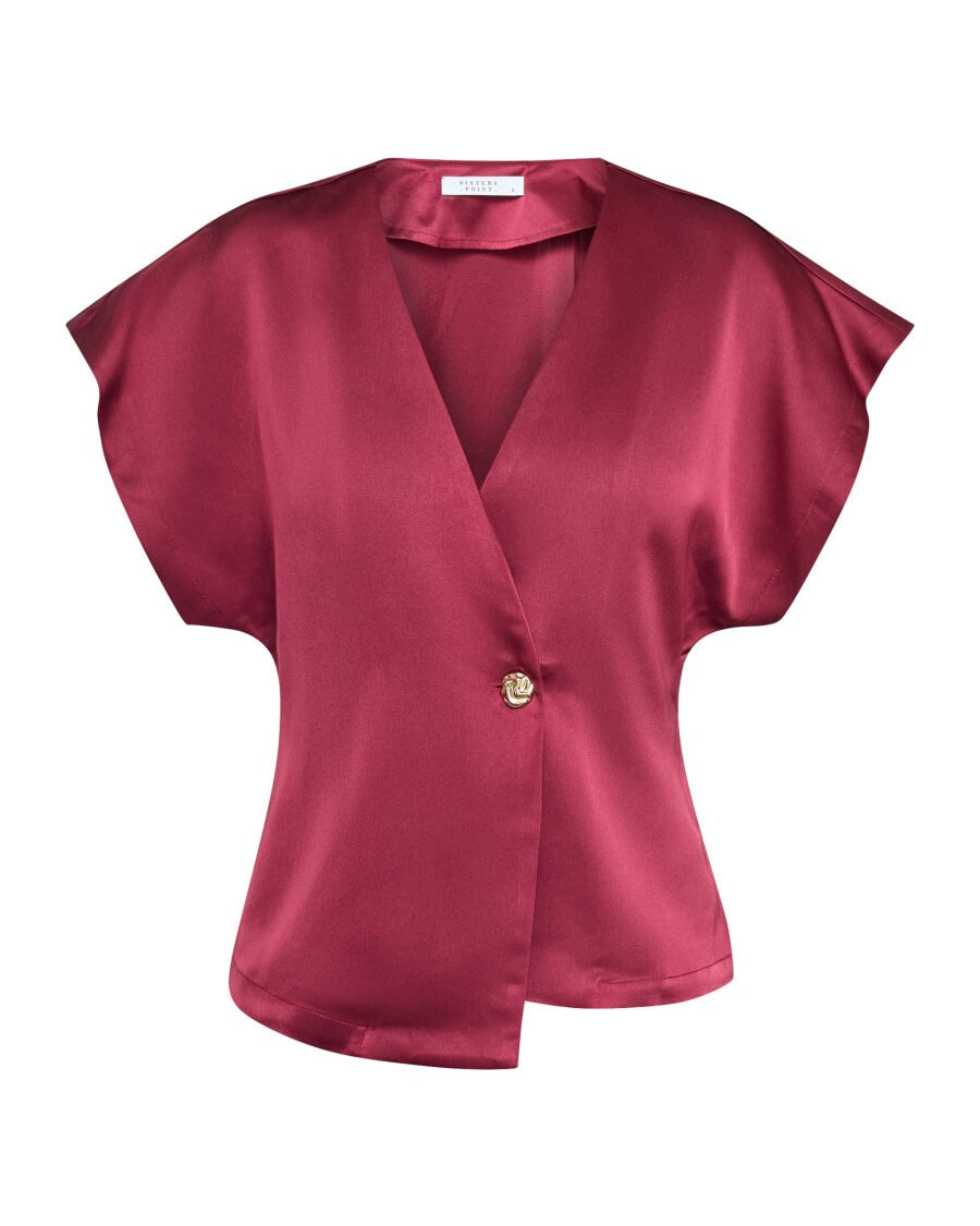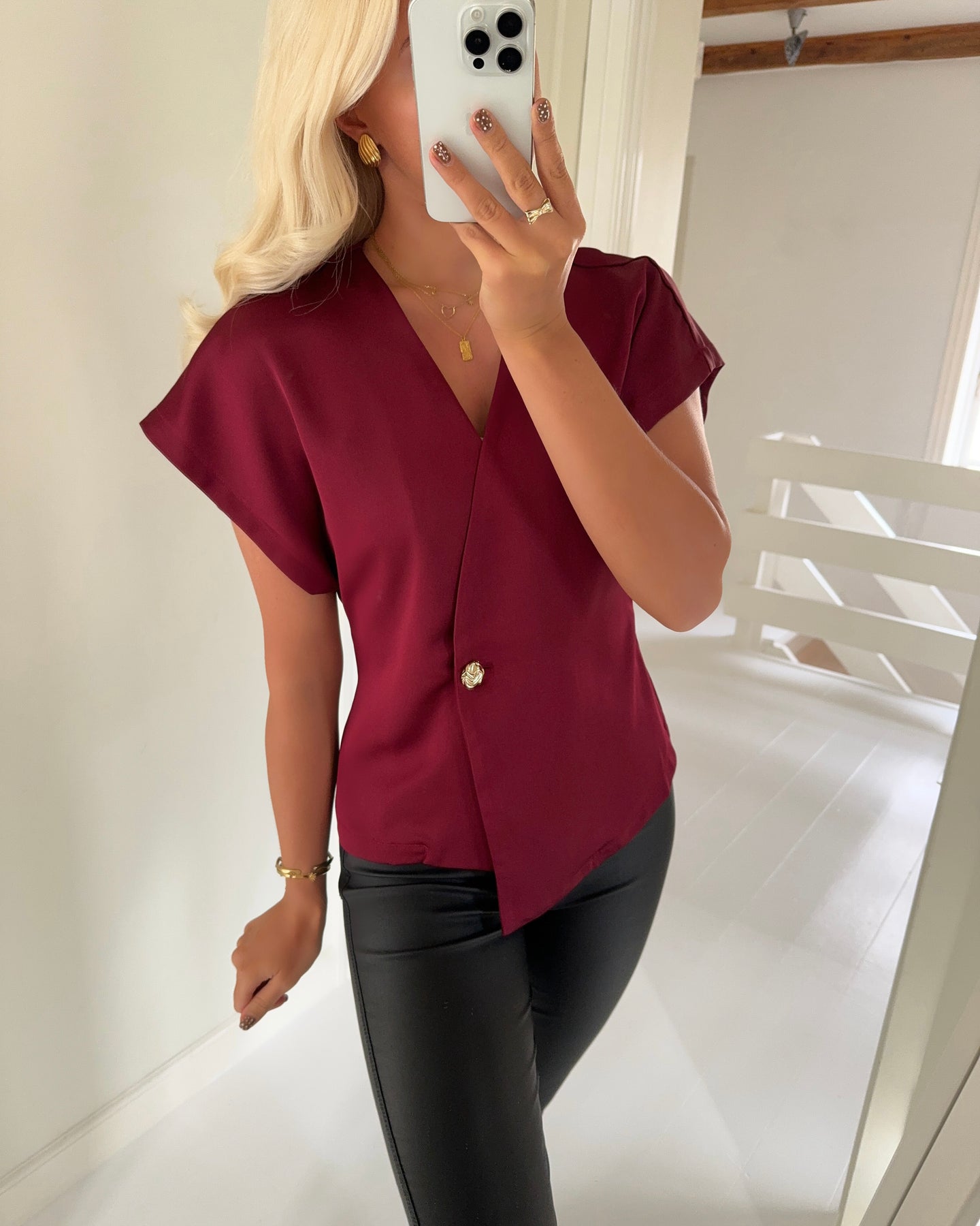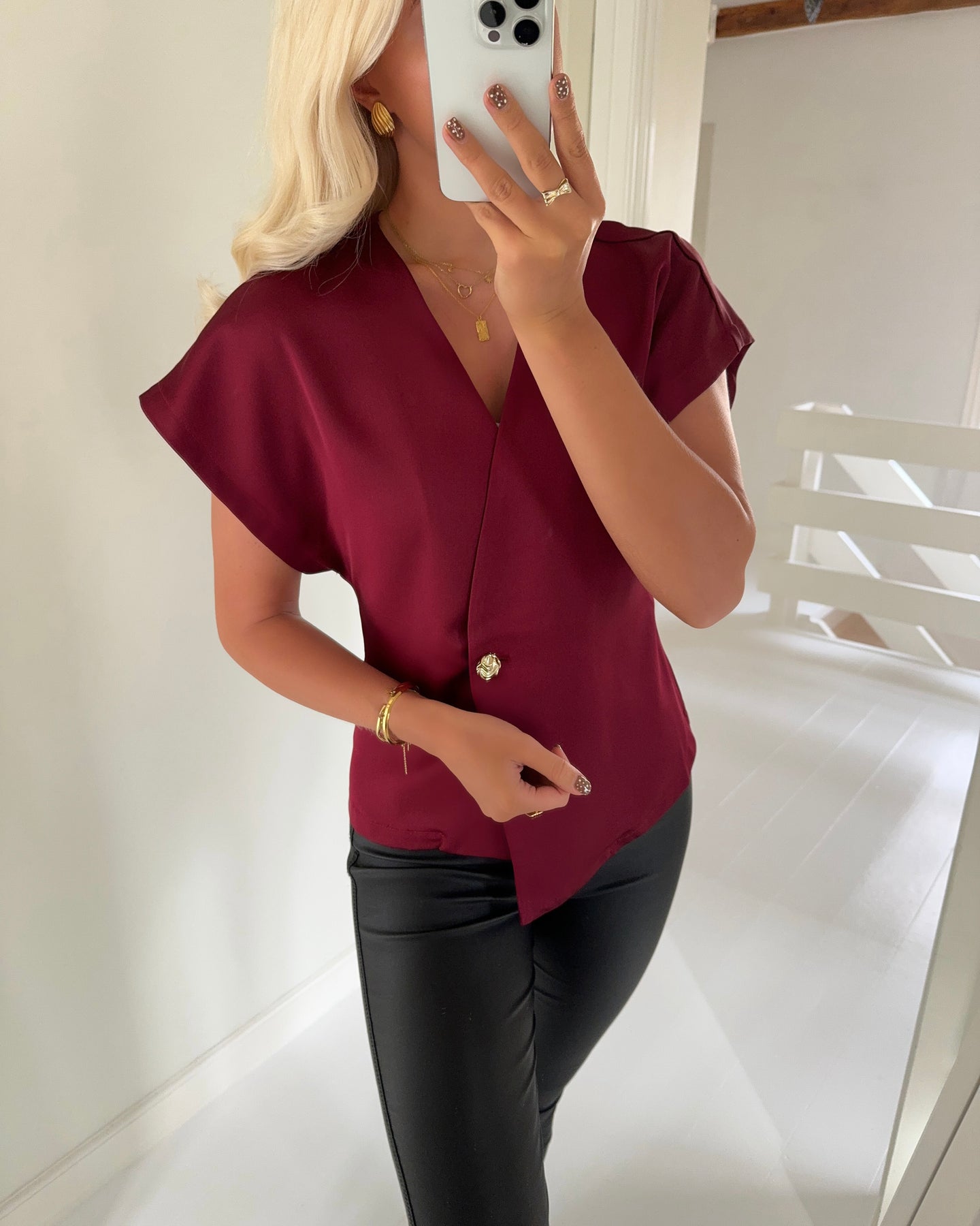 Toppen har en sød knappedetalje, korte ærmer og en v-udskæring.