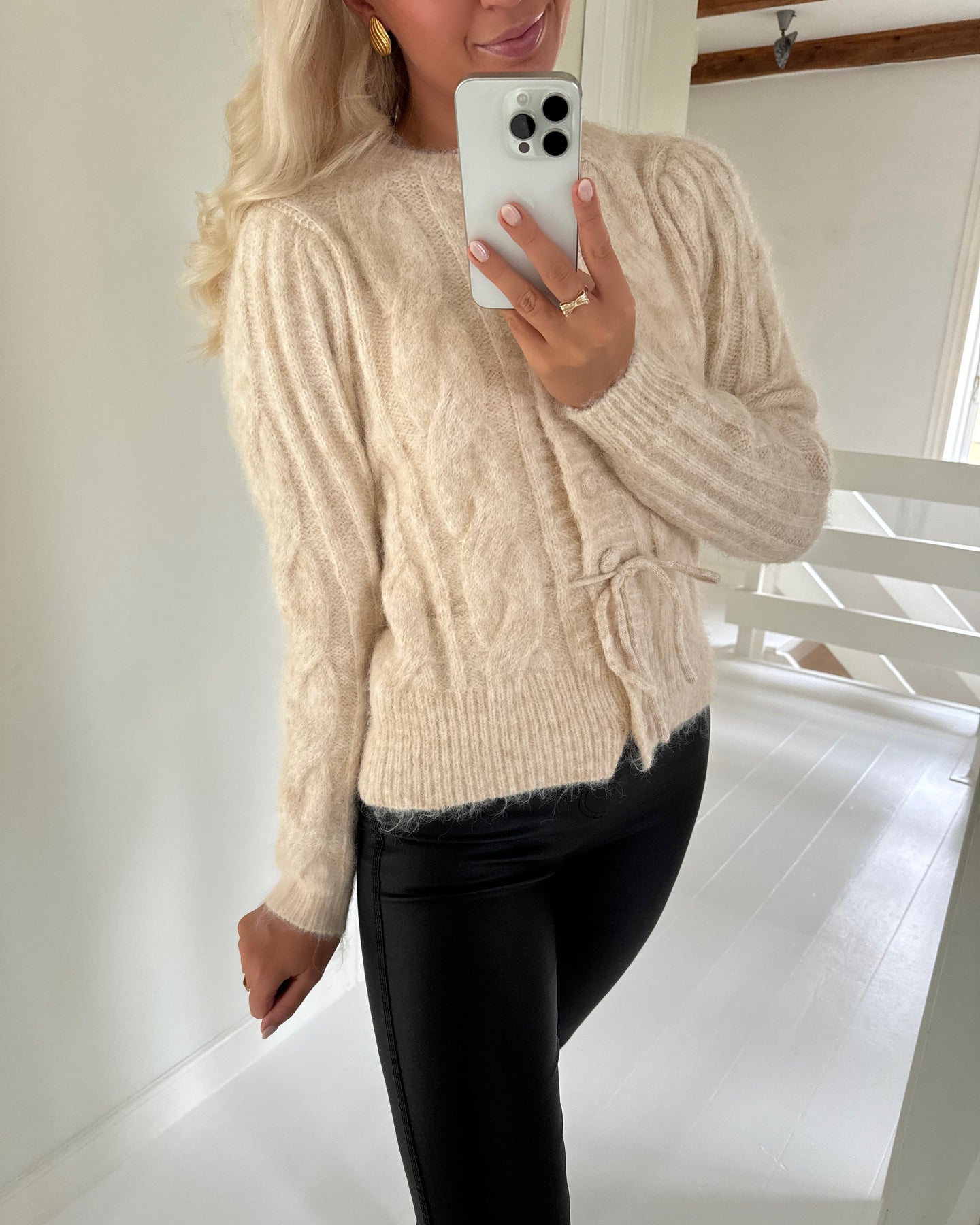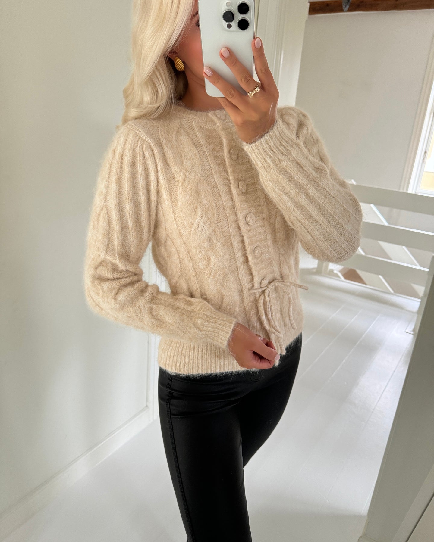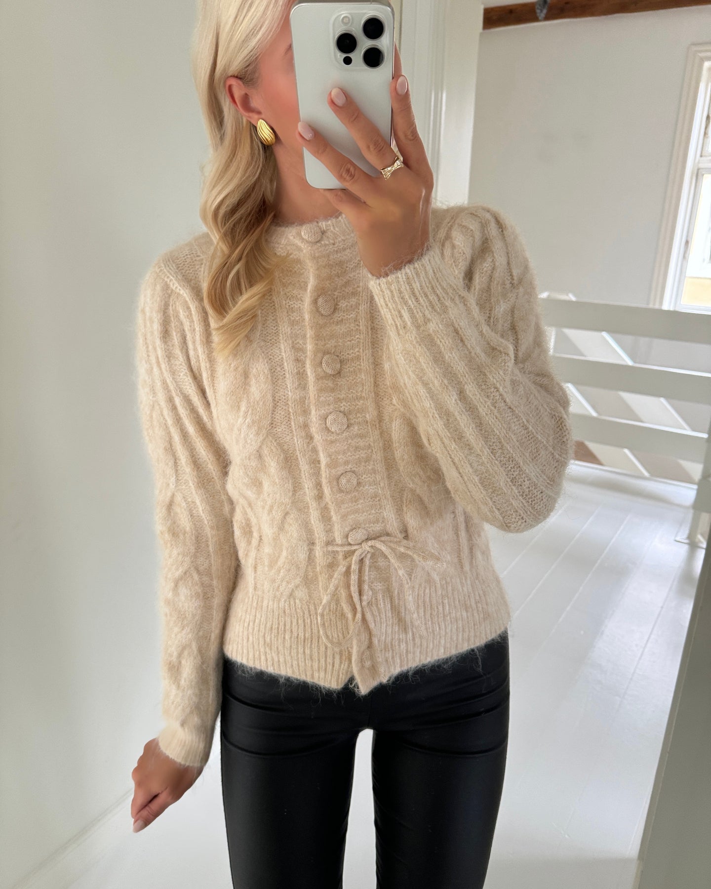Cardiganen har rund hals og fine knapper hele vejen ned.